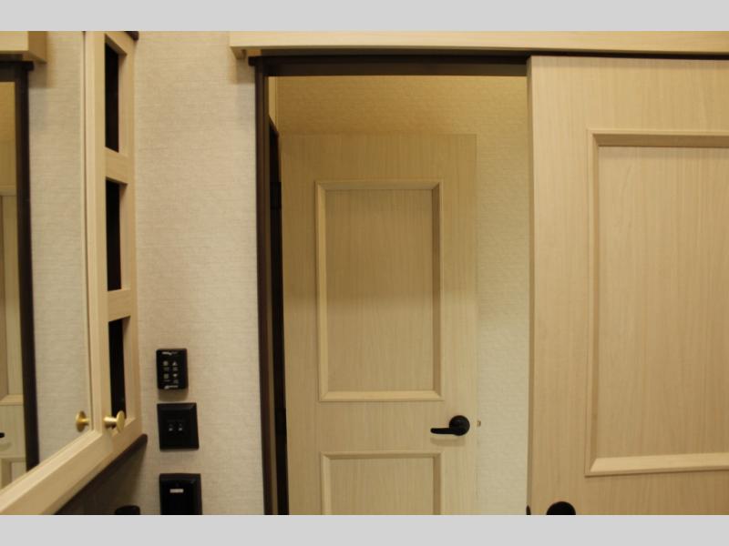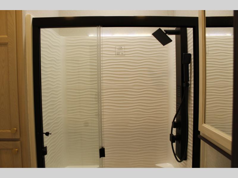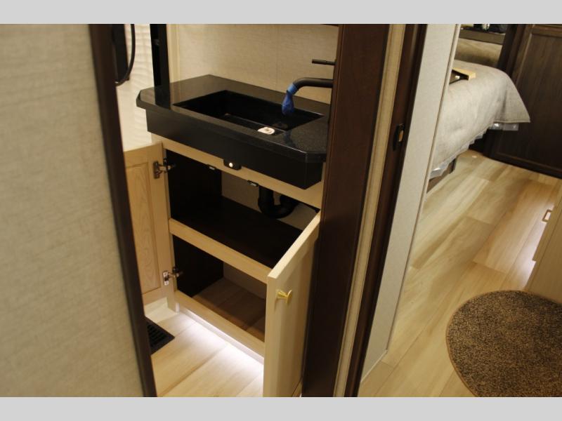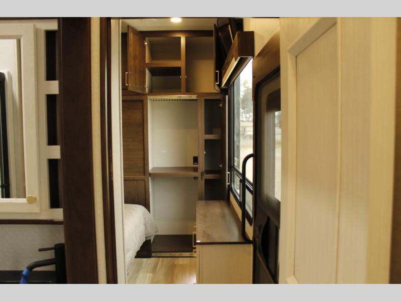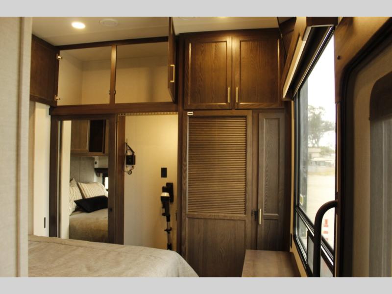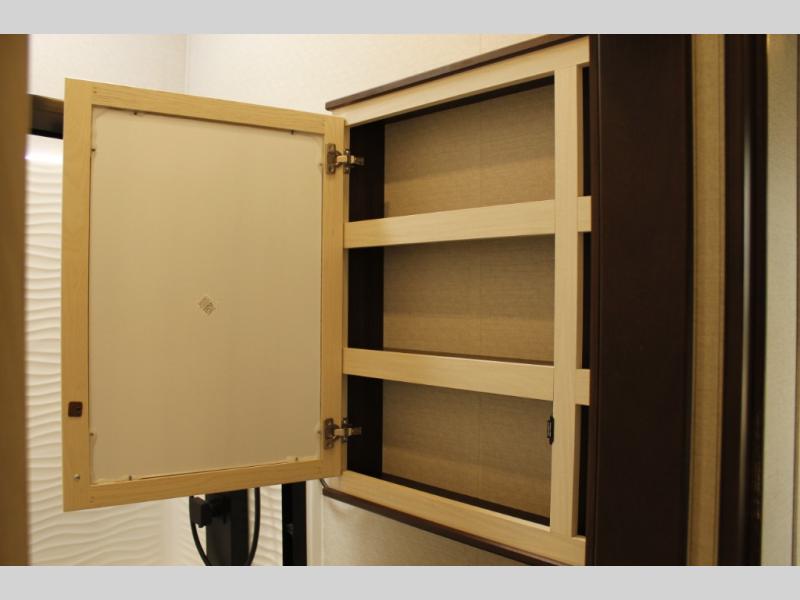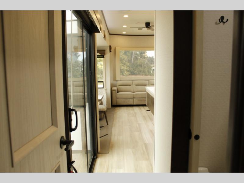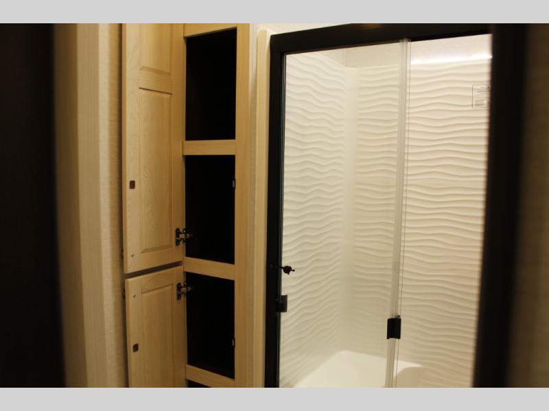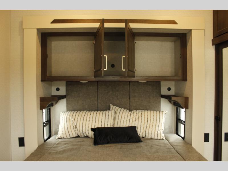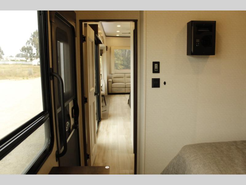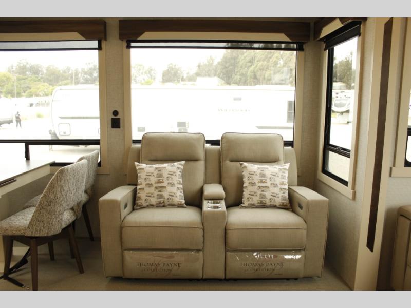 You're sure to feel right at home in this triple slide out destination trailer for four happy campers. The front private bedroom includes a king bed slide out, a large front wardrobe, and a dresser to keep your clothes organized. The full bath includes a shower skylight, extra storage for linens, and a Create-A-Breeze fan to keep air moving. The combined middle kitchen and living area will be a favorite place to visit together with its kitchen island and fold-down breakfast counter, free-standing table with an extension and an ottoman, and power theater seating. There is also a Murphy pantry behind the swivel mounted TV and fireplace for convenient storage, and a hide-a-bed sofa provides guests a place to sleep!