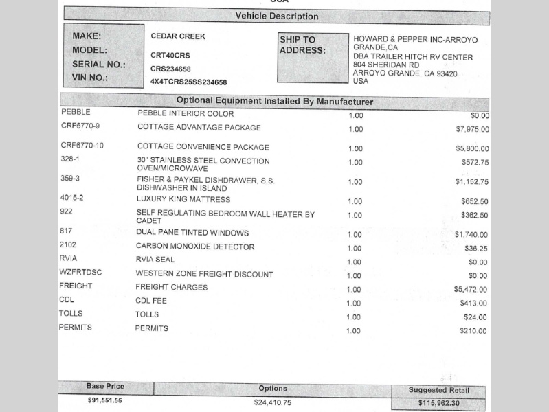 LOWEST CEDAR CREEK PRICE IN THE USA! COMPARE THE OPTIONS! OUR ARE FULLY LOADED!