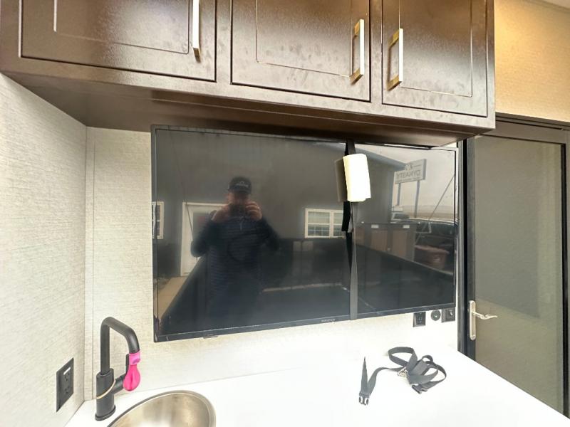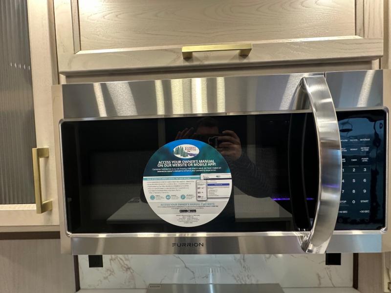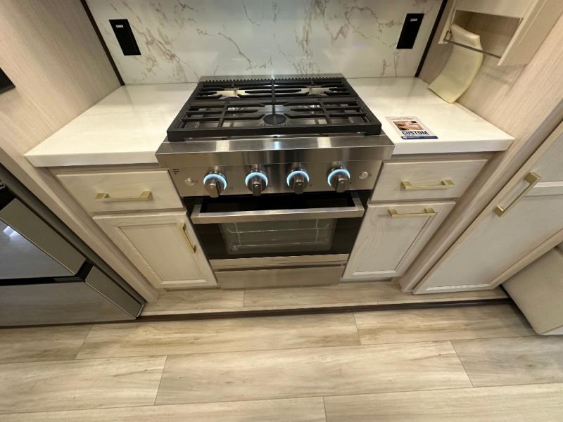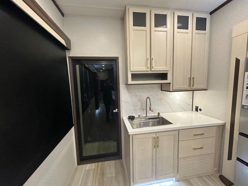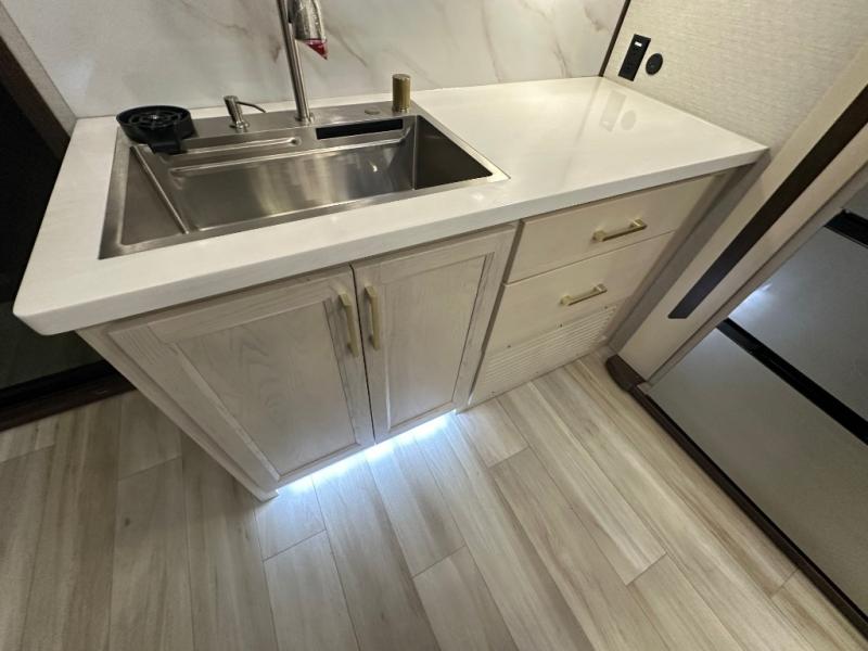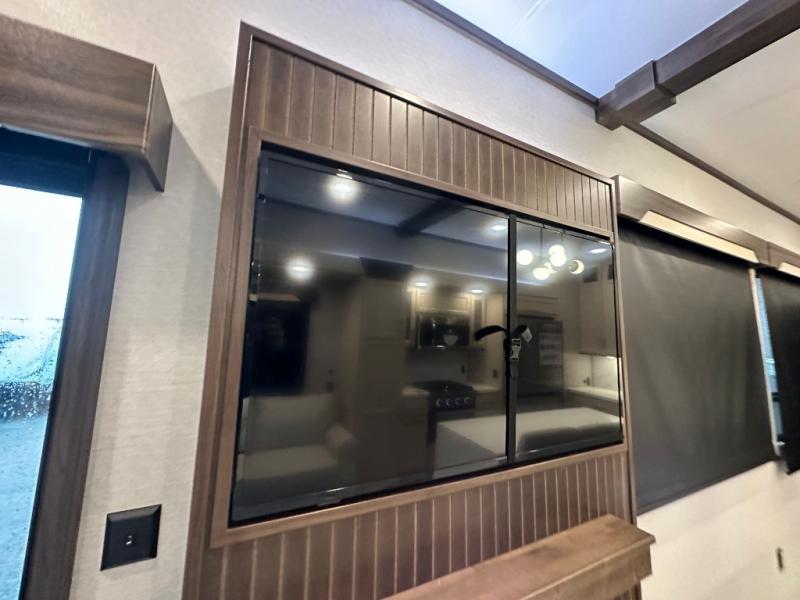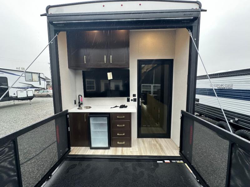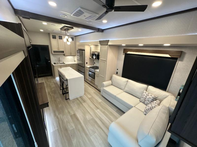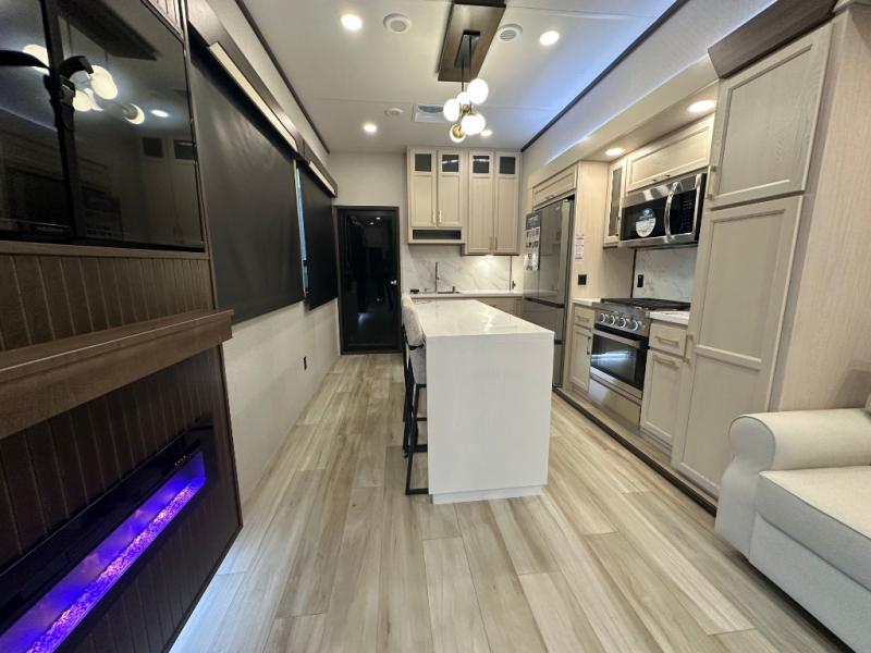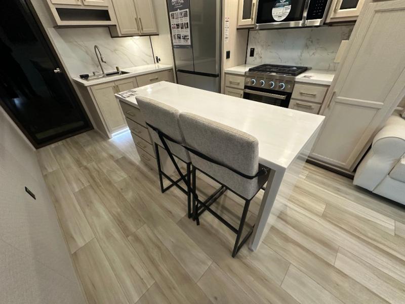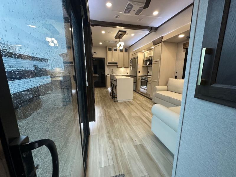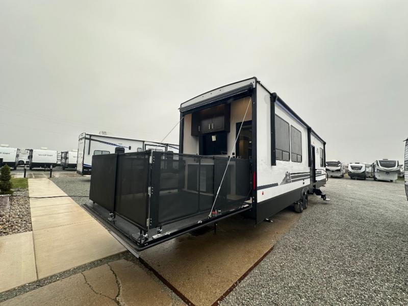 At-home comforts are found in this double slide out destination trailer! With dual entry doors, you can enter in through the rear patio deck and glass door or the main living area through sliding patio doors. The combined kitchen and living room includes a large slide for ample space to move about, along with an L-shaped sectional sofa, a waterfall island with two seats, and all the kitchen appliances to cook meals each day. There is even a dishwasher option if you want to make cleaning up easier. A full bath will let you clean up each day, and the front private bedroom will feel just like home with its king bed slide, front wardrobe with sliding doors, and dresser with a TV above. There is also washer and dryer prep if you want to add those appliances!
