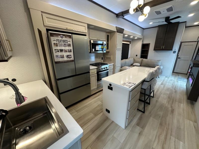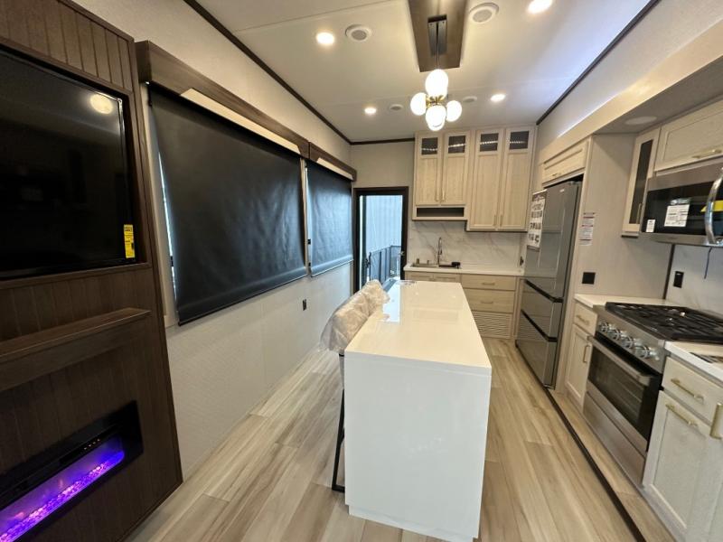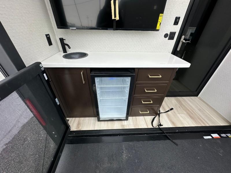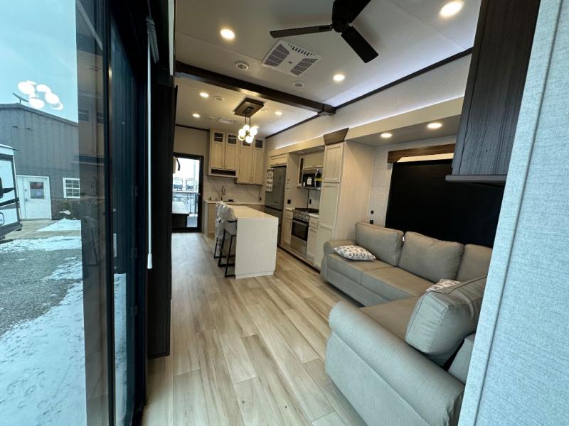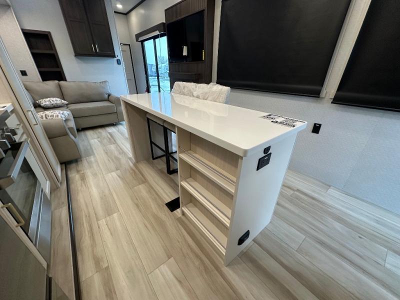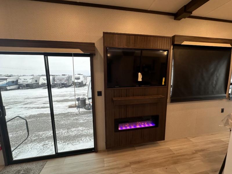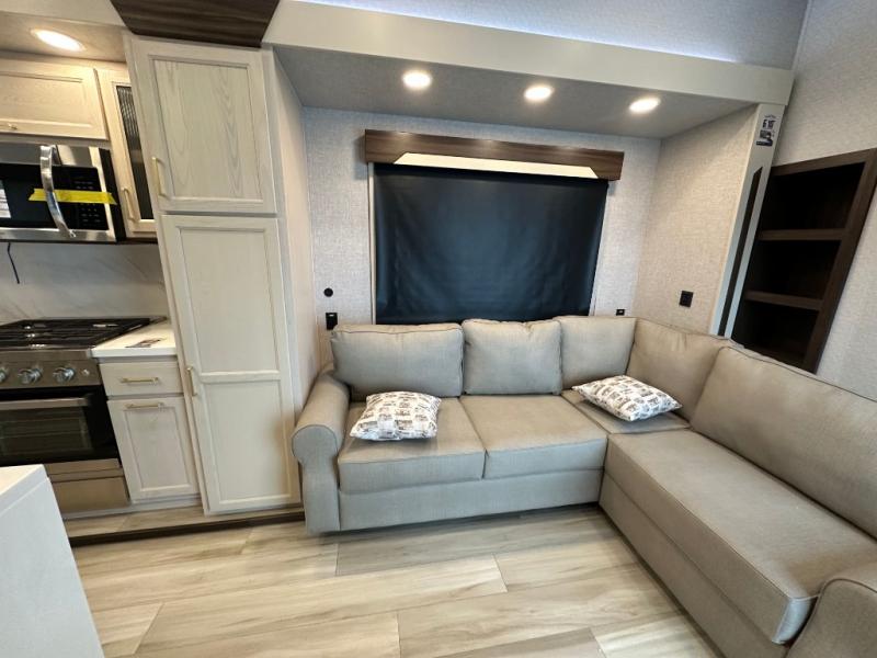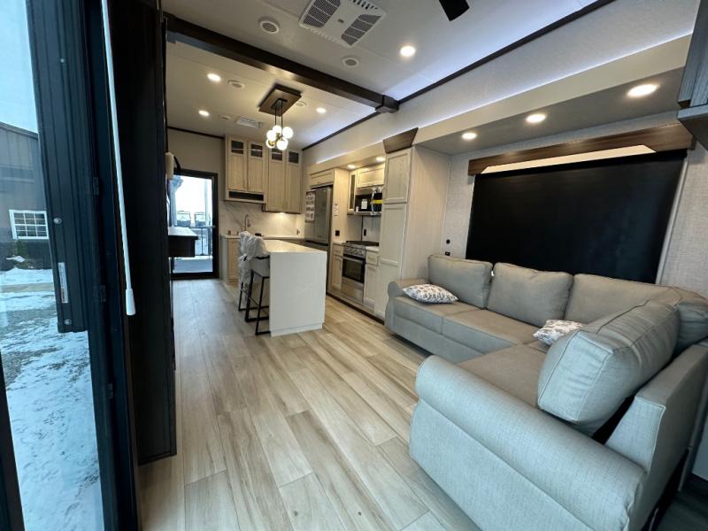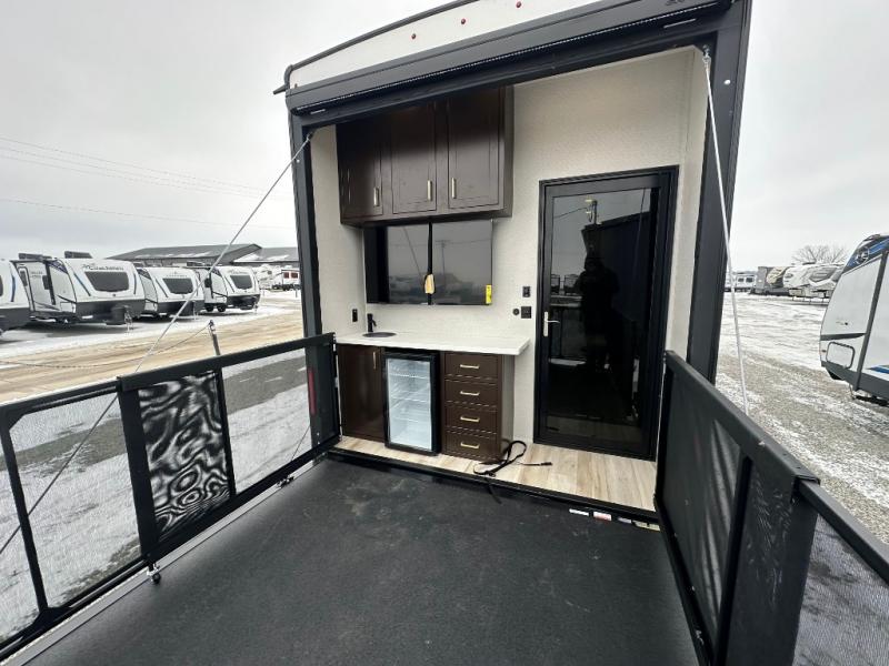 At-home comforts are found in this double slide out destination trailer! With dual entry doors, you can enter in through the rear patio deck and glass door or the main living area through sliding patio doors. The combined kitchen and living room includes a large slide for ample space to move about, along with an L-shaped sectional sofa, a waterfall island with two seats, and all the kitchen appliances to cook meals each day. There is even a dishwasher option if you want to make cleaning up easier. A full bath will let you clean up each day, and the front private bedroom will feel just like home with its king bed slide, front wardrobe with sliding doors, and dresser with a TV above. There is also washer and dryer prep if you want to add those appliances!
