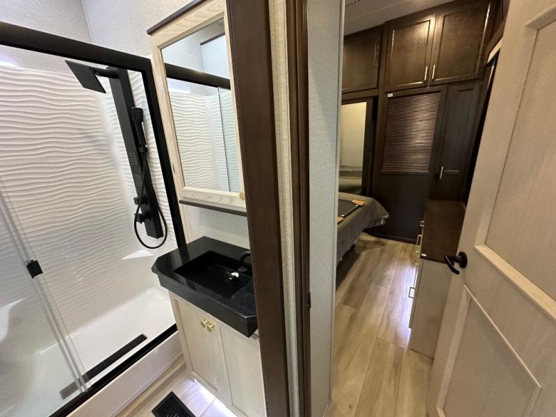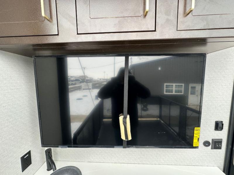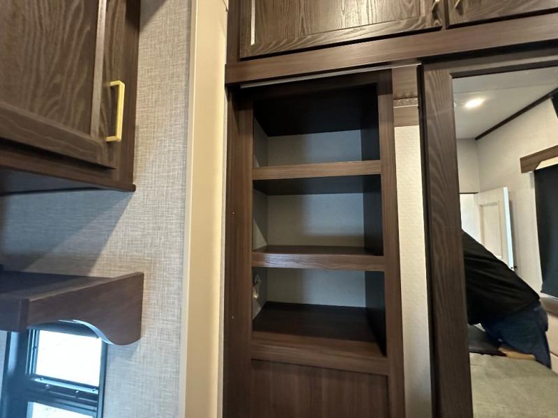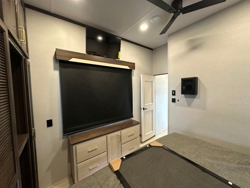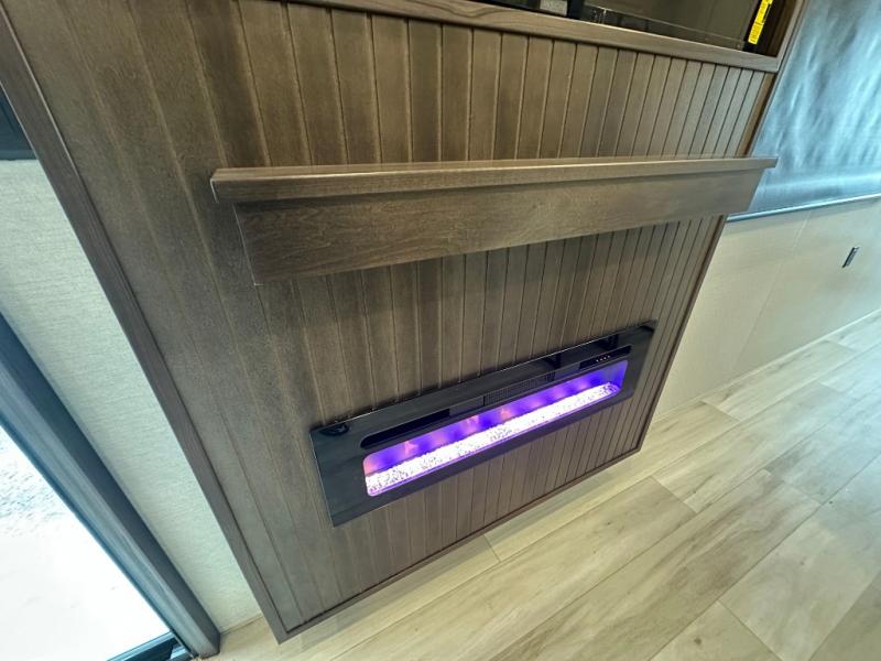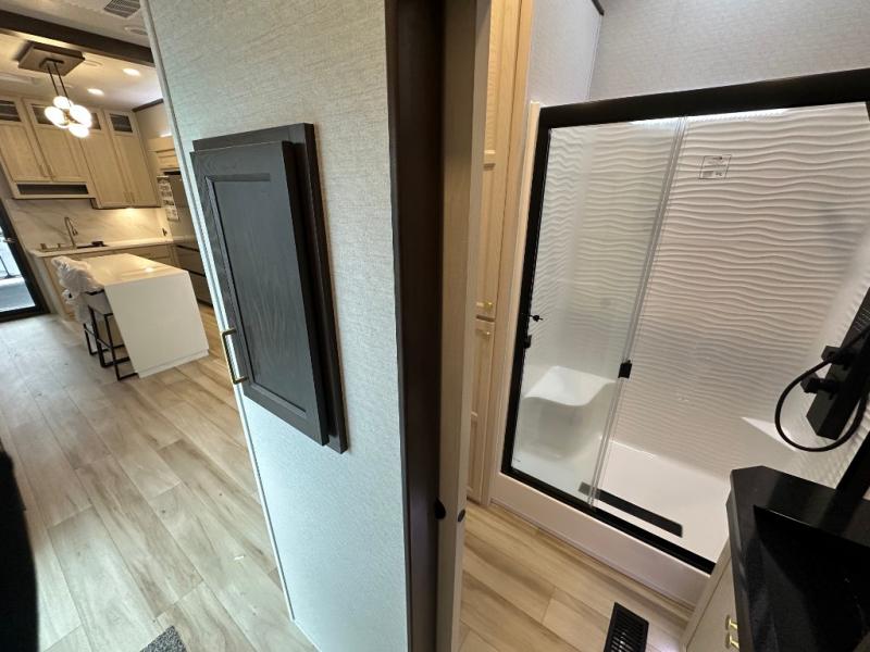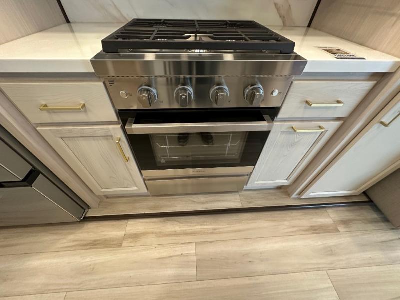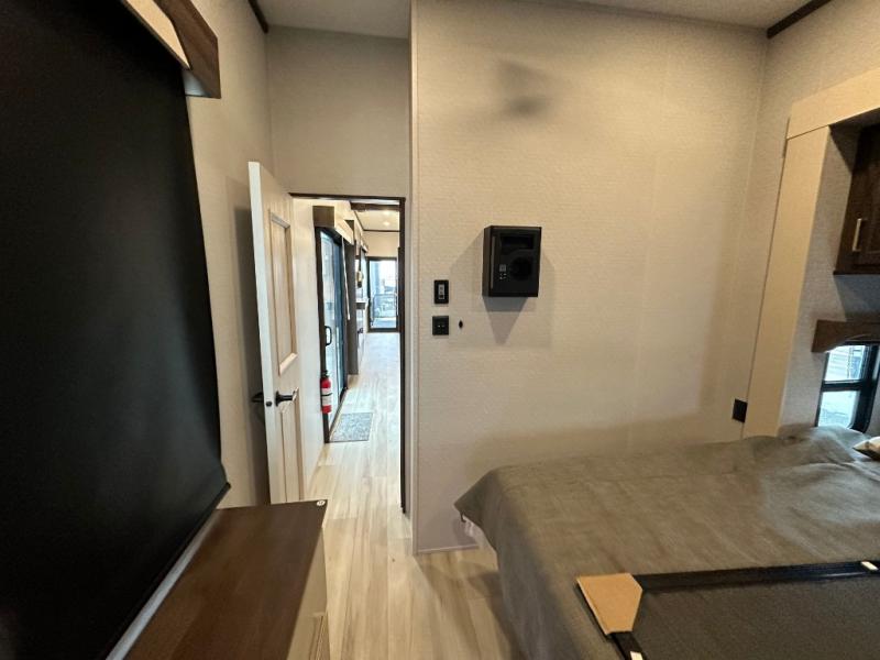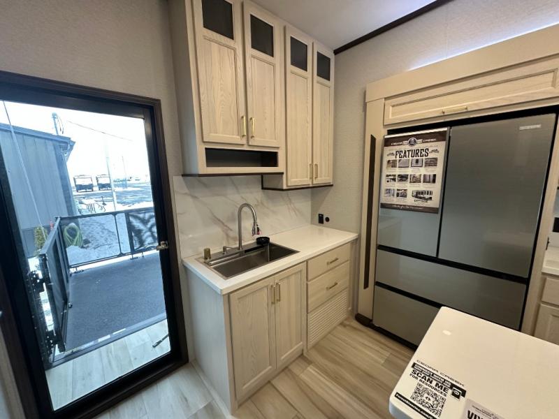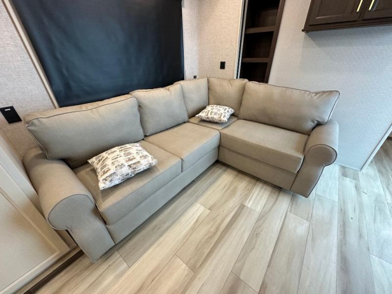 At-home comforts are found in this double slide out destination trailer! With dual entry doors, you can enter in through the rear patio deck and glass door or the main living area through sliding patio doors. The combined kitchen and living room includes a large slide for ample space to move about, along with an L-shaped sectional sofa, a waterfall island with two seats, and all the kitchen appliances to cook meals each day. There is even a dishwasher option if you want to make cleaning up easier. A full bath will let you clean up each day, and the front private bedroom will feel just like home with its king bed slide, front wardrobe with sliding doors, and dresser with a TV above. There is also washer and dryer prep if you want to add those appliances!