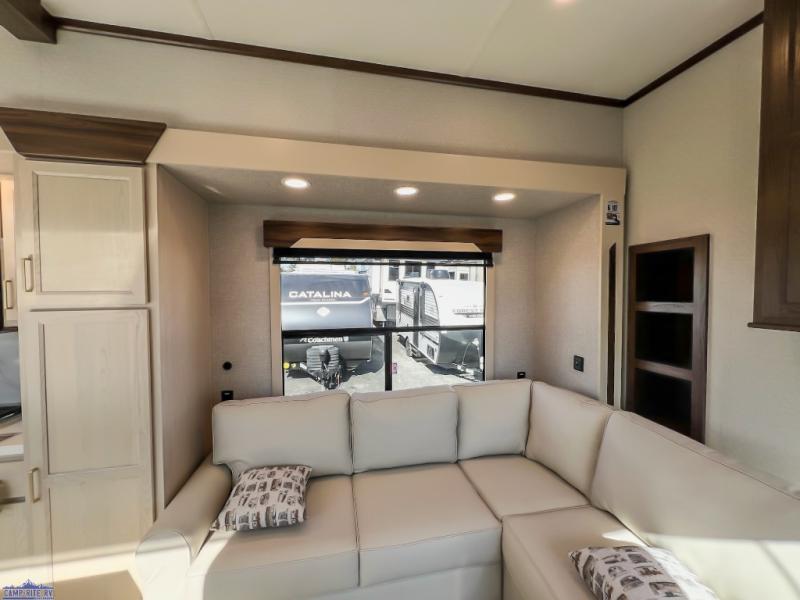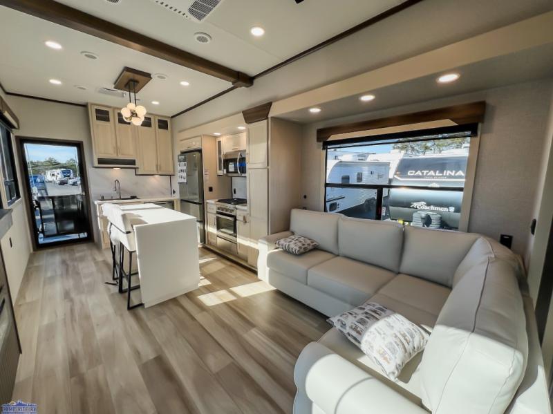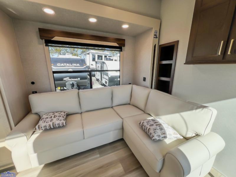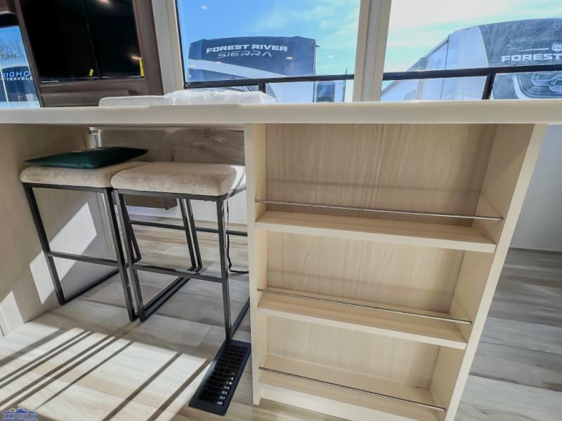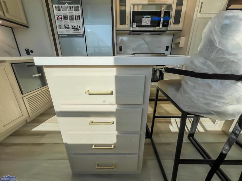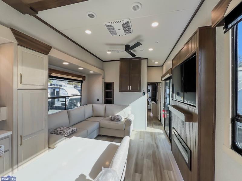 At-home comforts are found in this double slide out destination trailer! With dual entry doors, you can enter in through the rear patio deck and glass door or the main living area through sliding patio doors. The combined kitchen and living room includes a large slide for ample space to move about, along with an L-shaped sectional sofa, a waterfall island with two seats, and all the kitchen appliances to cook meals each day. There is even a dishwasher option if you want to make cleaning up easier. A full bath will let you clean up each day, and the front private bedroom will feel just like home with its king bed slide, front wardrobe with sliding doors, and dresser with a TV above. There is also washer and dryer prep if you want to add those appliances!