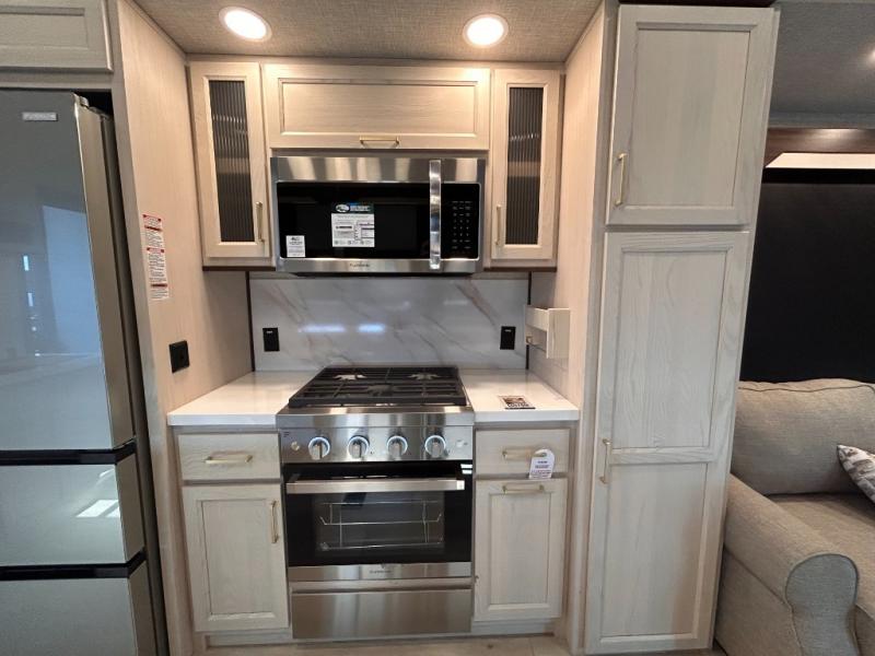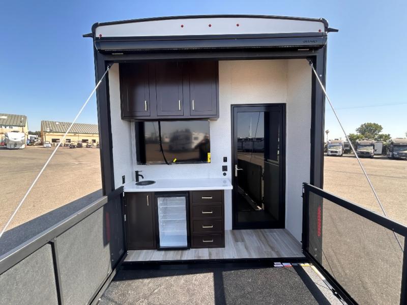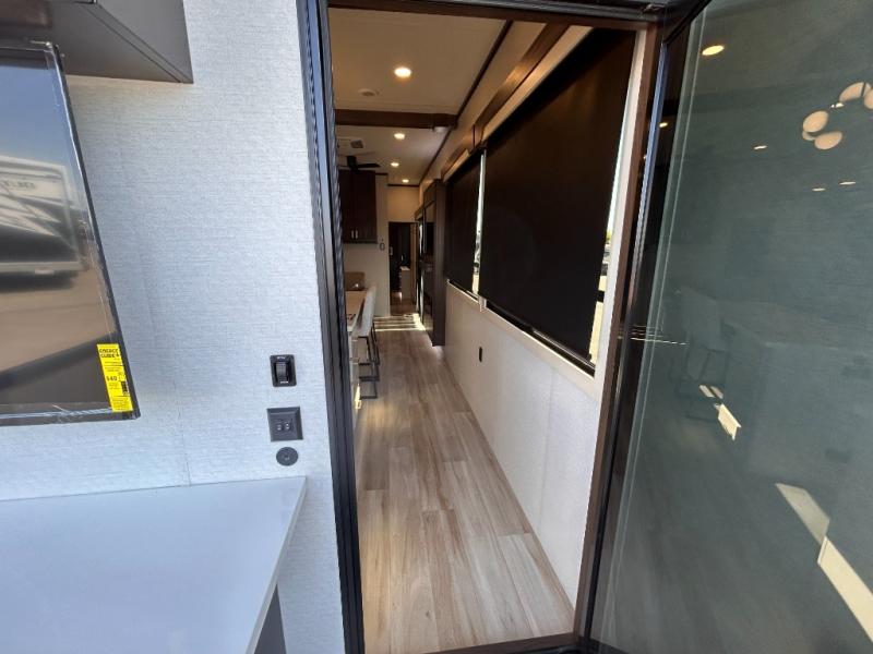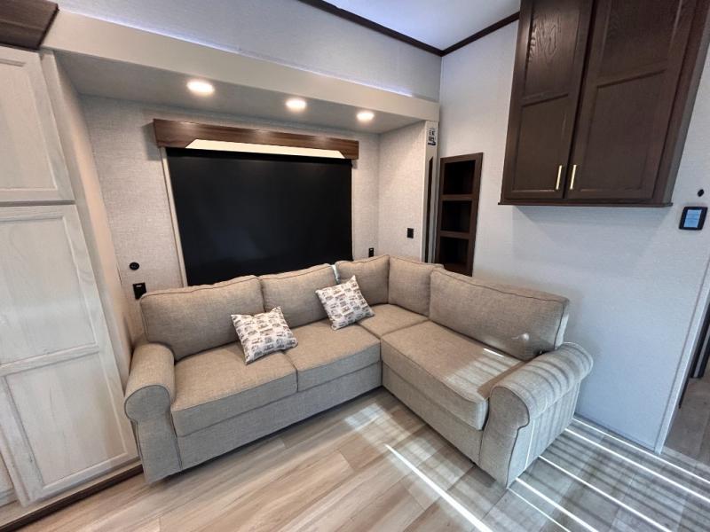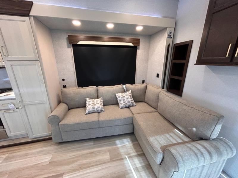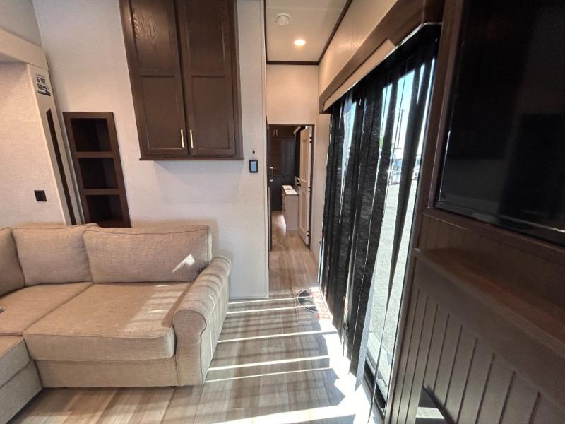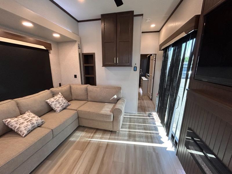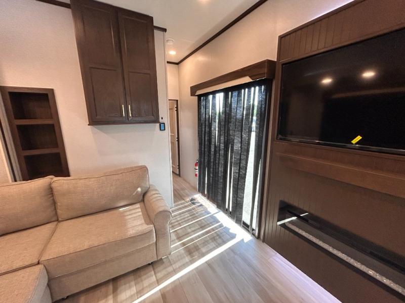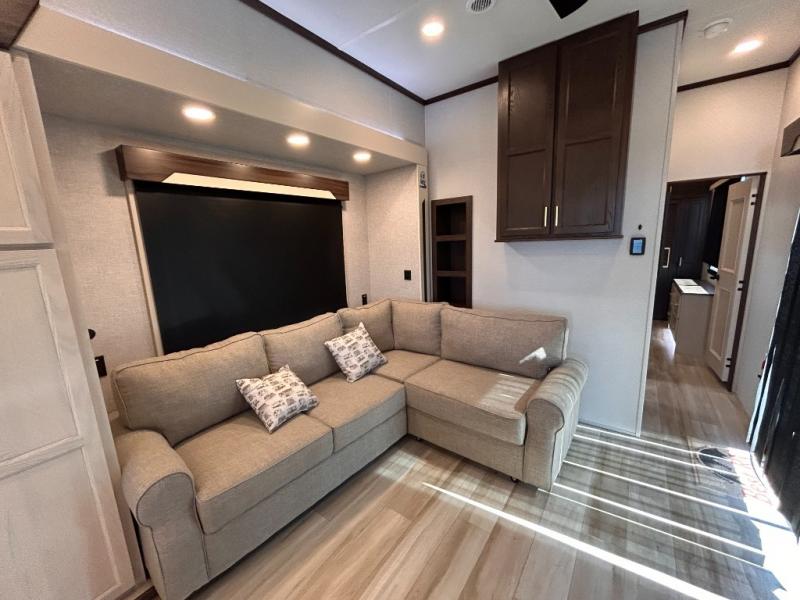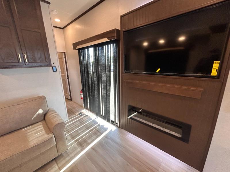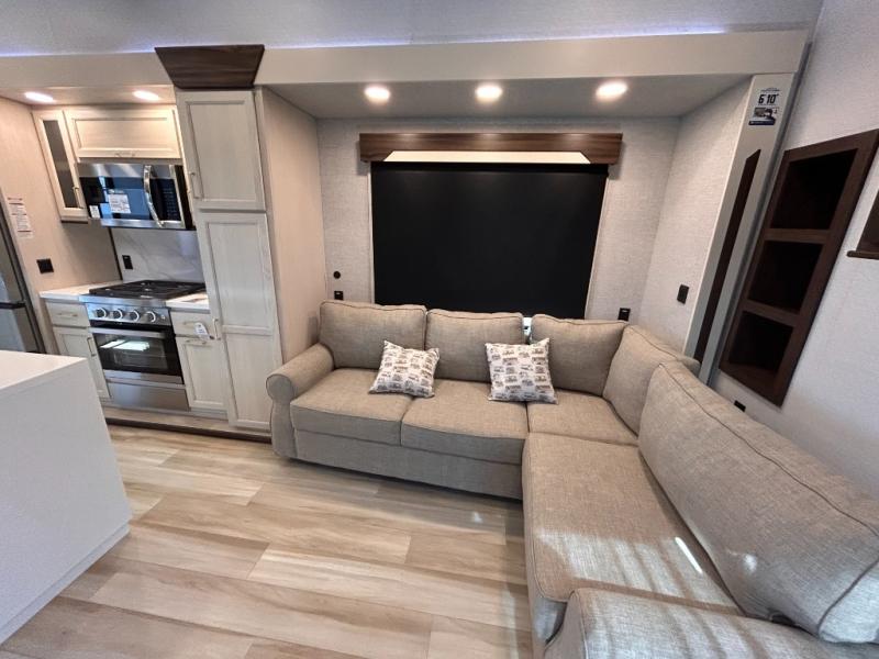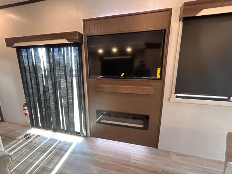 At-home comforts are found in this double slide out destination trailer! With dual entry doors, you can enter in through the rear patio deck and glass door or the main living area through sliding patio doors. The combined kitchen and living room includes a large slide for ample space to move about, along with an L-shaped sectional sofa, a waterfall island with two seats, and all the kitchen appliances to cook meals each day. There is even a dishwasher option if you want to make cleaning up easier. A full bath will let you clean up each day, and the front private bedroom will feel just like home with its king bed slide, front wardrobe with sliding doors, and dresser with a TV above. There is also washer and dryer prep if you want to add those appliances!