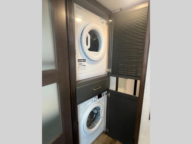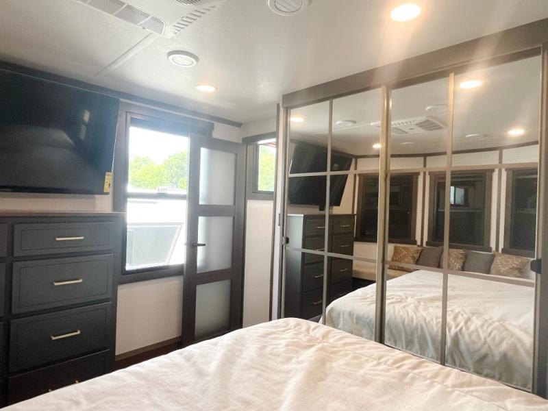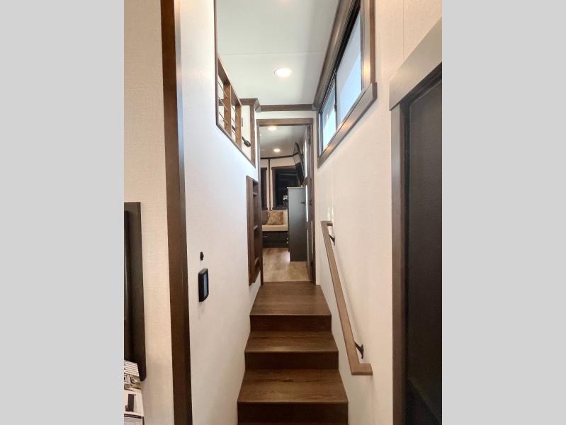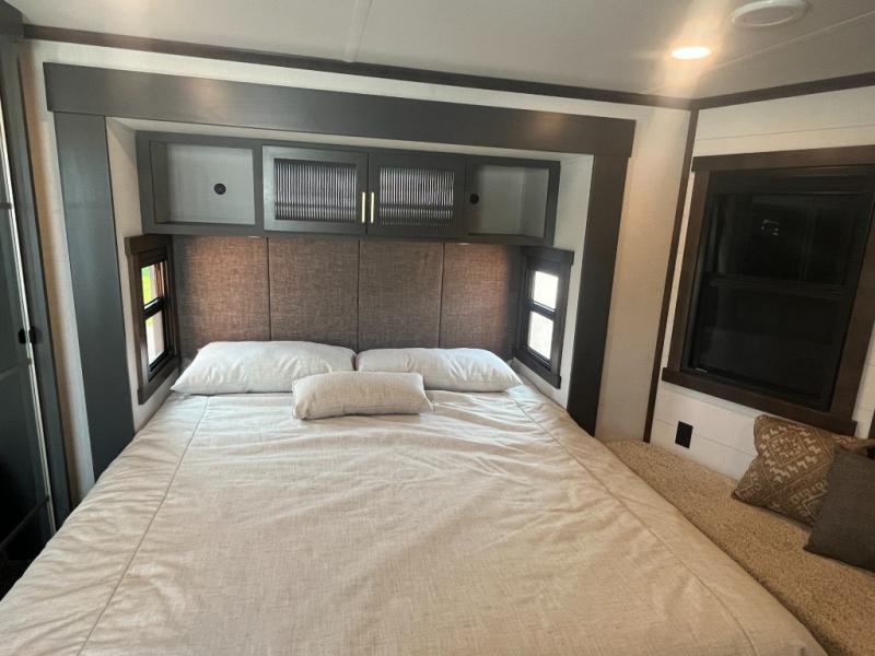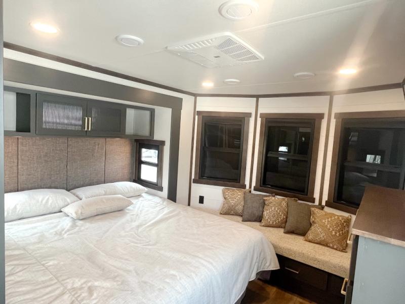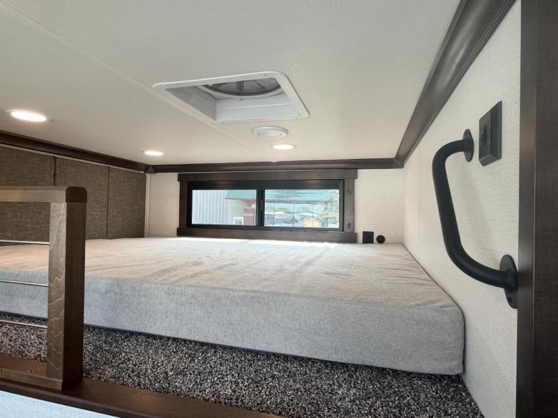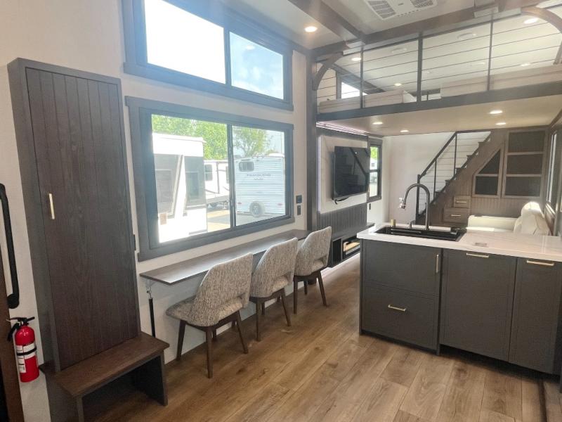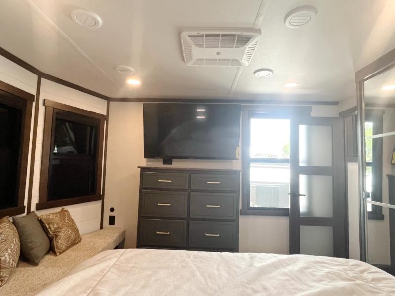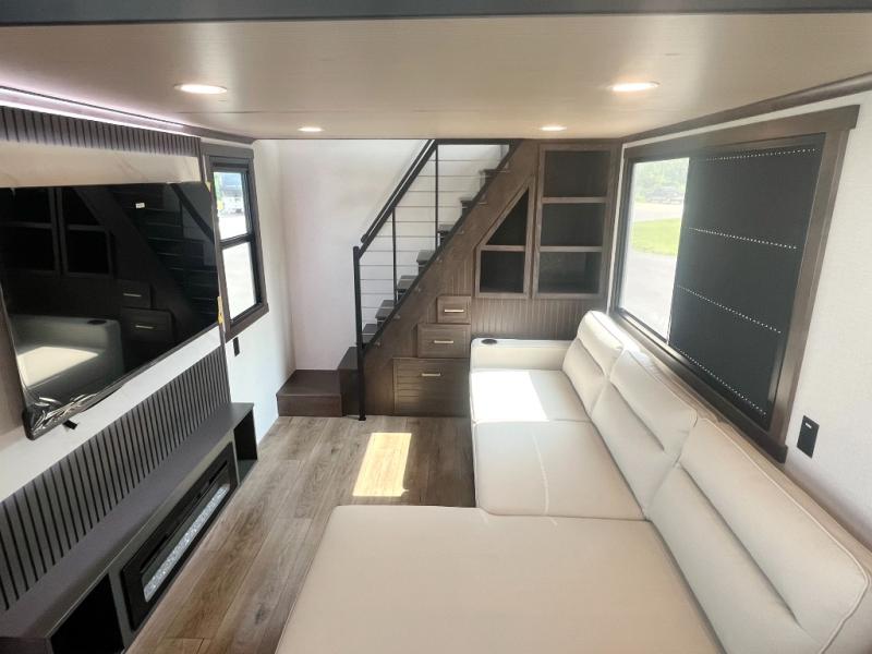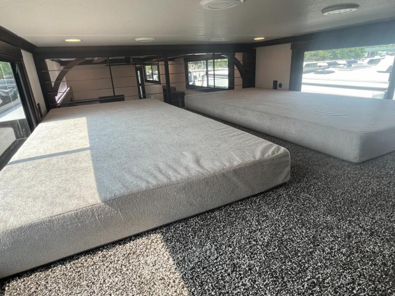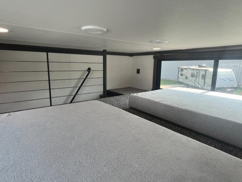It will be so easy to enjoy extended stays in this destination fifth wheel! There is a large slide out in the main living area, a counter peninsula for more counter space, and a flip-down bar top to dine at. You'll find a comfy place to relax on the sectional sofa with a trundle bed underneath for added sleeping space. There is a loft area above the living room that includes two bunk mats and loft windows so this space seems larger, and the second loft is found above the spacious full bath. Speaking of the bath, you'll find a spacious shower and sink plus washer and dryer prep if you want the option to make laundry day easier. The front private bedroom features a king bed slide out, a front bench seat, a large wardrobe, and a dresser with a TV above to watch movies in bed.
