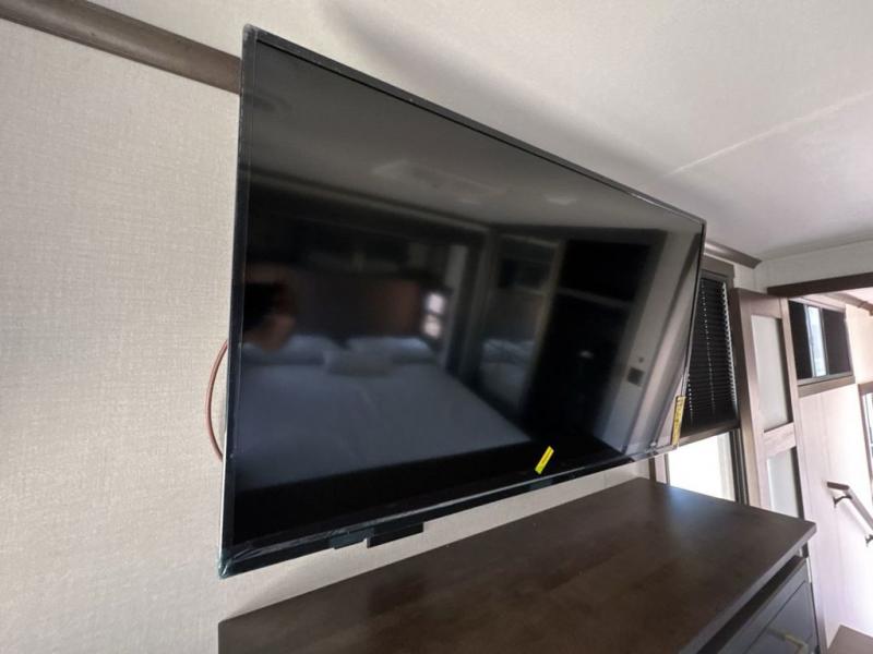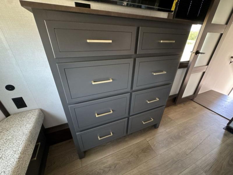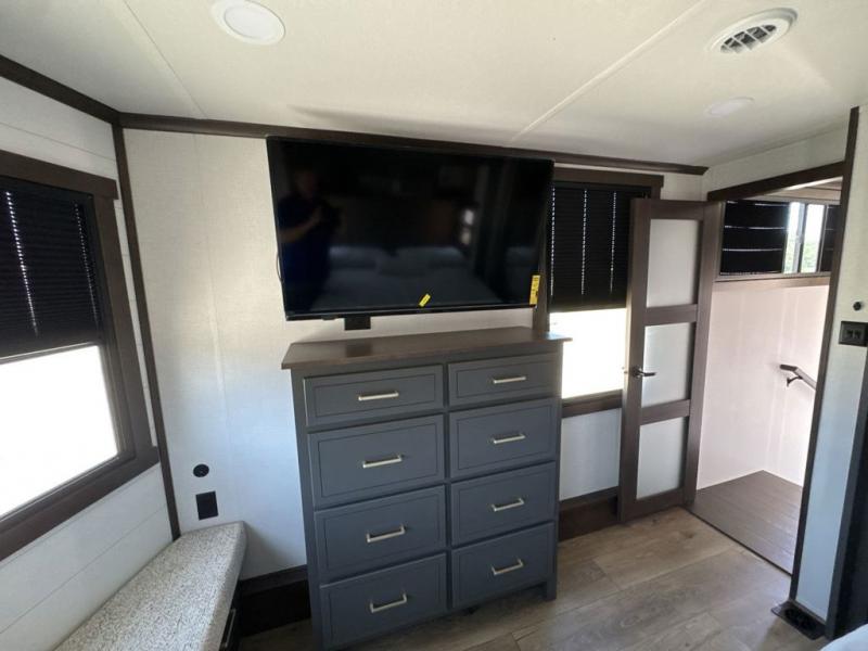 It will be so easy to enjoy extended stays in this destination fifth wheel! There is a large slide out in the main living area, a counter peninsula for more counter space, and a flip-down bar top to dine at. You'll find a comfy place to relax on the sectional sofa with a trundle bed underneath for added sleeping space. There is a loft area above the living room that includes two bunk mats and loft windows so this space seems larger, and the second loft is found above the spacious full bath. Speaking of the bath, you'll find a spacious shower and sink plus washer and dryer prep if you want the option to make laundry day easier. The front private bedroom features a king bed slide out, a front bench seat, a large wardrobe, and a dresser with a TV above to watch movies in bed.