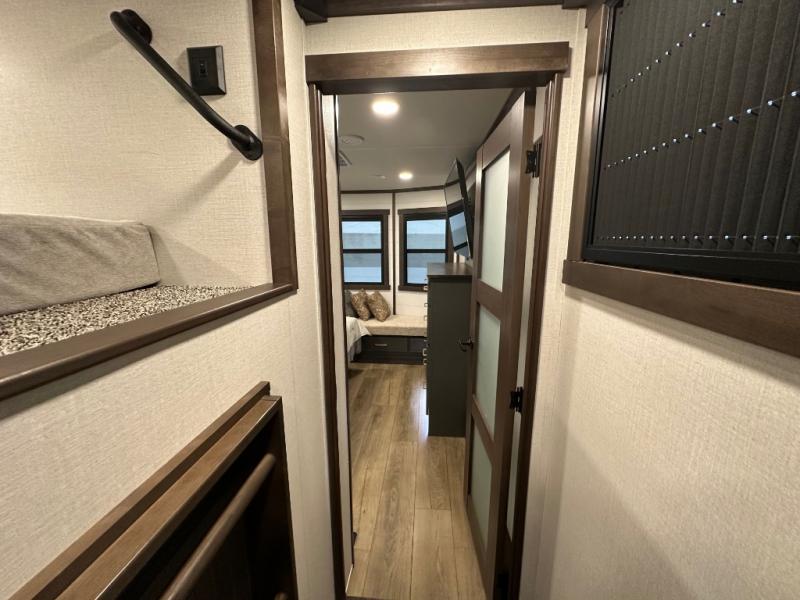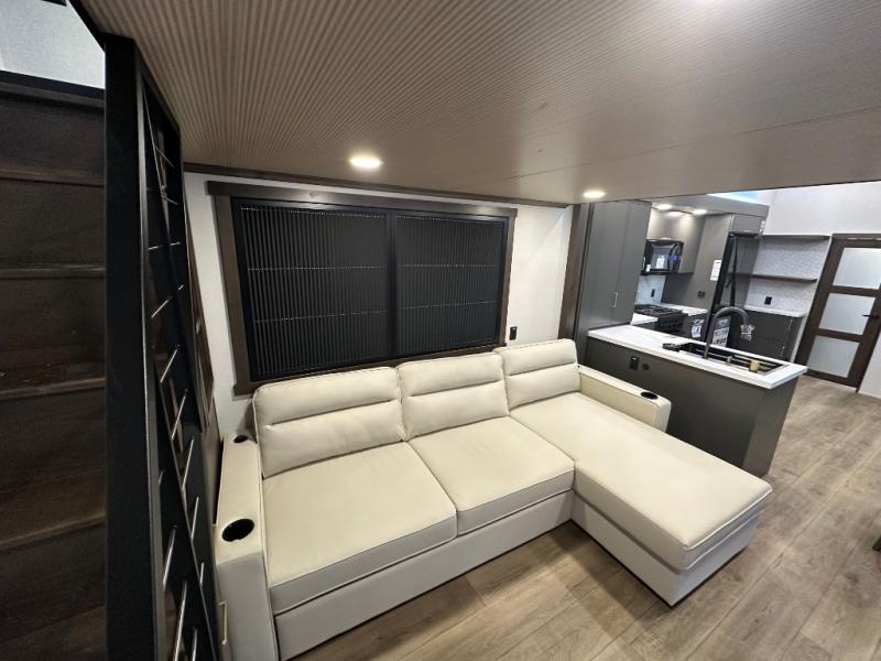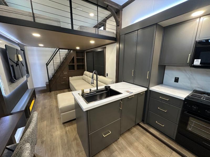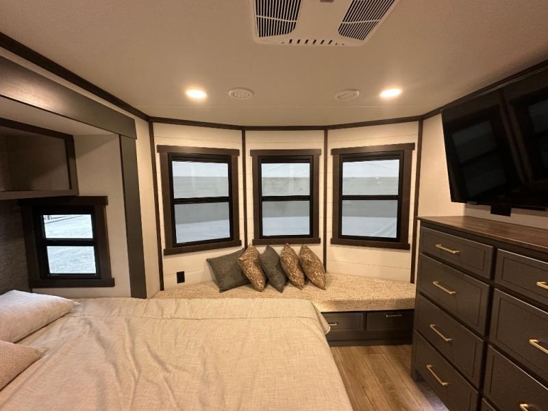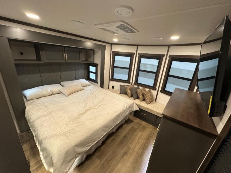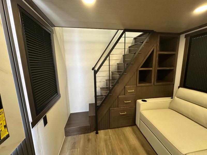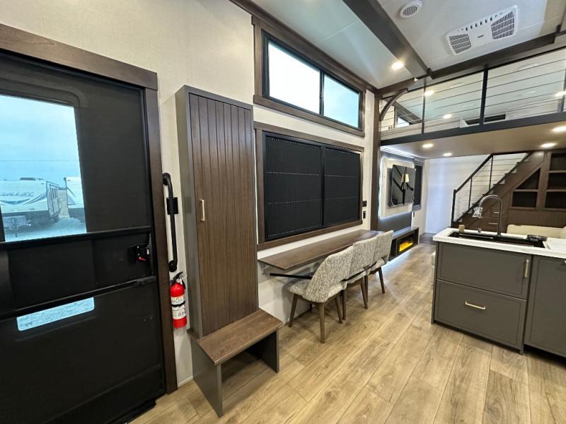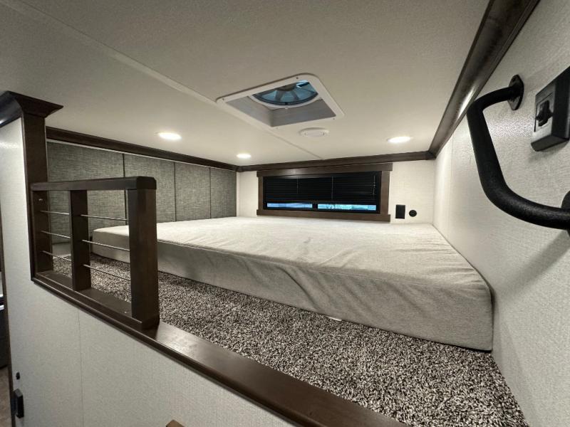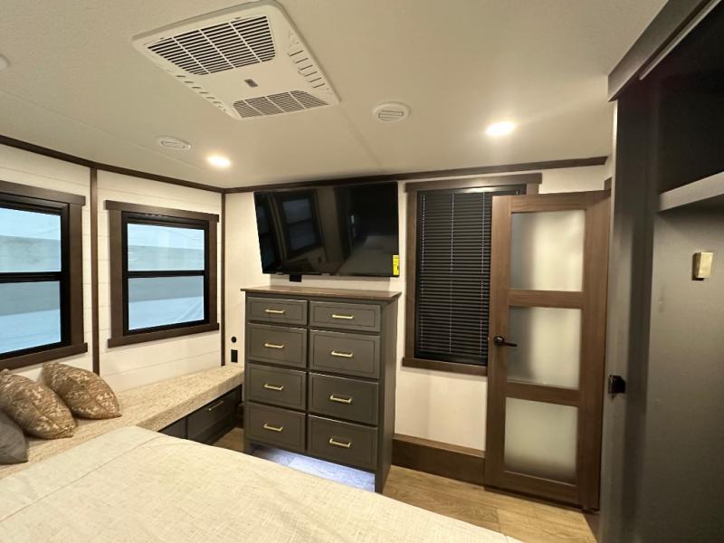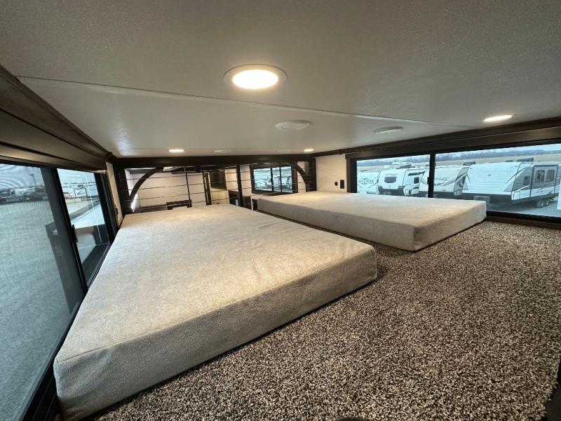 It will be so easy to enjoy extended stays in this destination fifth wheel! There is a large slide out in the main living area, a counter peninsula for more counter space, and a flip-down bar top to dine at. You'll find a comfy place to relax on the sectional sofa with a trundle bed underneath for added sleeping space. There is a loft area above the living room that includes two bunk mats and loft windows so this space seems larger, and the second loft is found above the spacious full bath. Speaking of the bath, you'll find a spacious shower and sink plus washer and dryer prep if you want the option to make laundry day easier. The front private bedroom features a king bed slide out, a front bench seat, a large wardrobe, and a dresser with a TV above to watch movies in bed.
