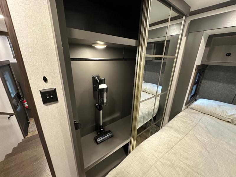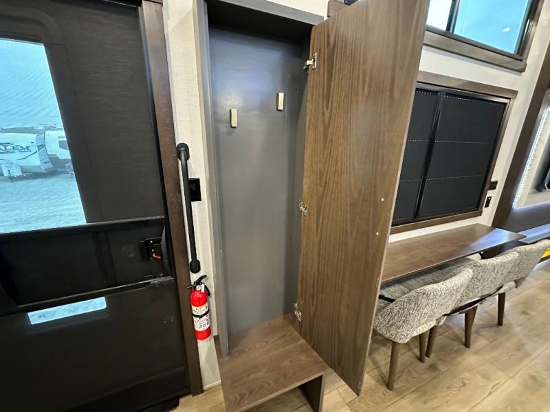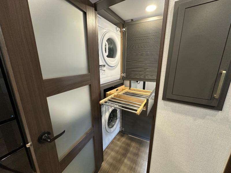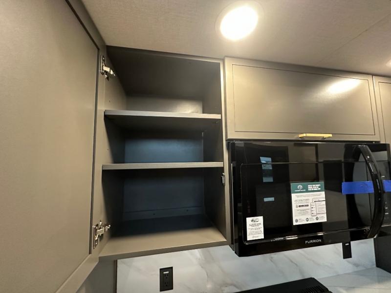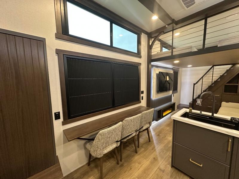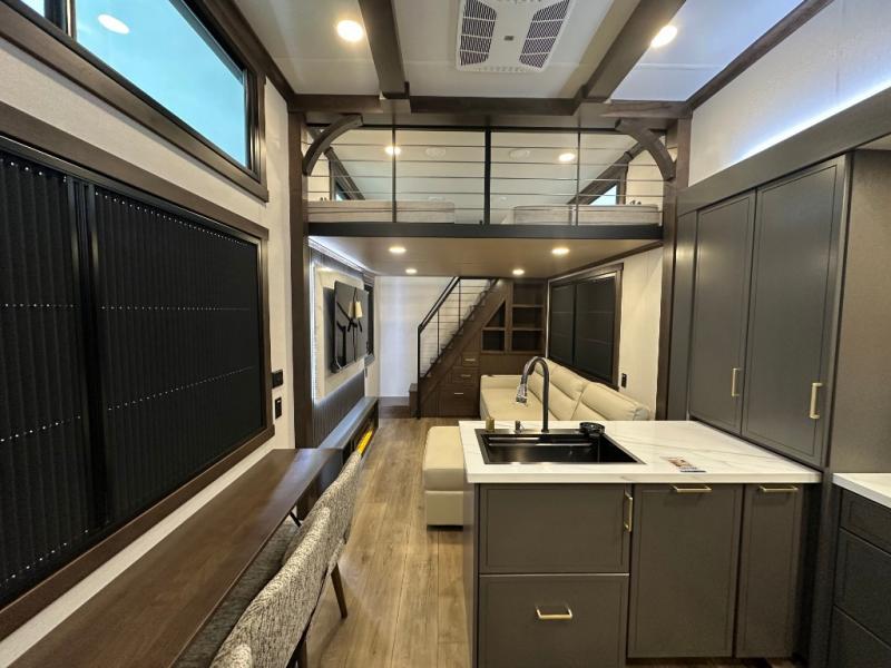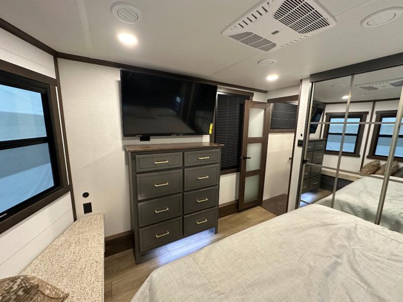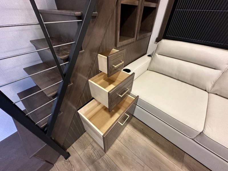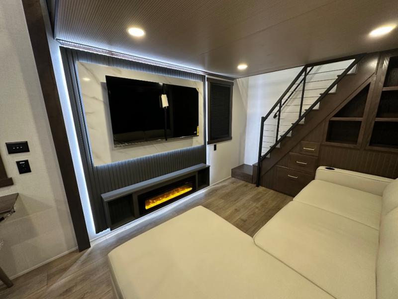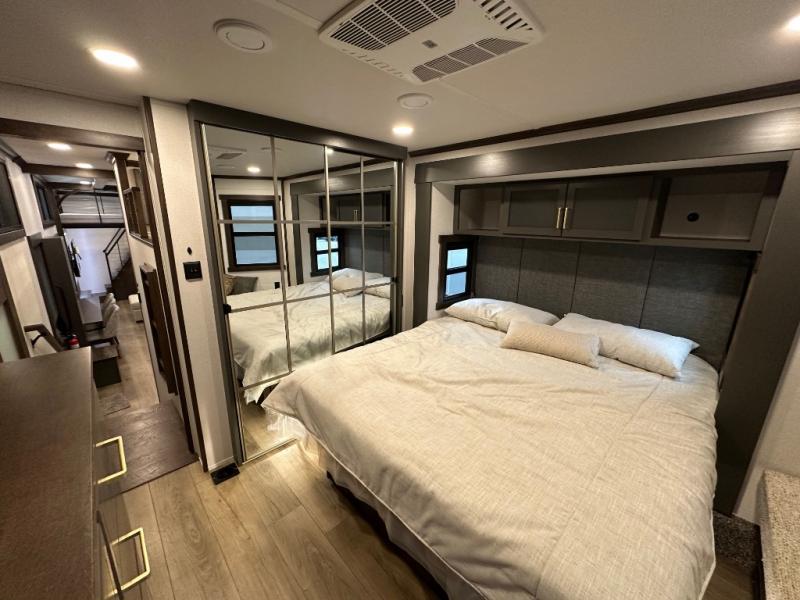 It will be so easy to enjoy extended stays in this destination fifth wheel! There is a large slide out in the main living area, a counter peninsula for more counter space, and a flip-down bar top to dine at. You'll find a comfy place to relax on the sectional sofa with a trundle bed underneath for added sleeping space. There is a loft area above the living room that includes two bunk mats and loft windows so this space seems larger, and the second loft is found above the spacious full bath. Speaking of the bath, you'll find a spacious shower and sink plus washer and dryer prep if you want the option to make laundry day easier. The front private bedroom features a king bed slide out, a front bench seat, a large wardrobe, and a dresser with a TV above to watch movies in bed.