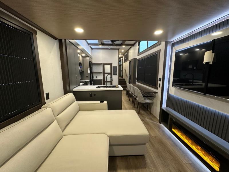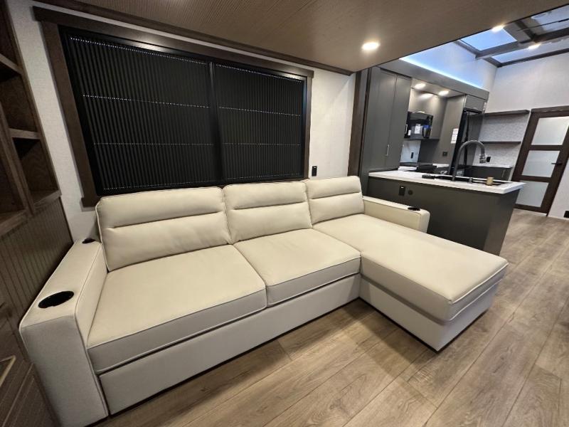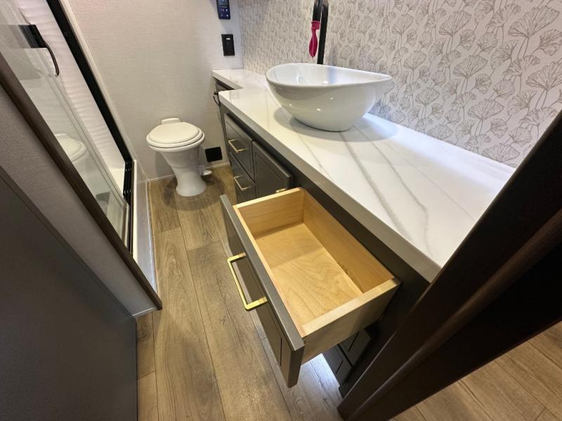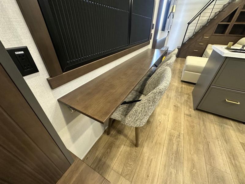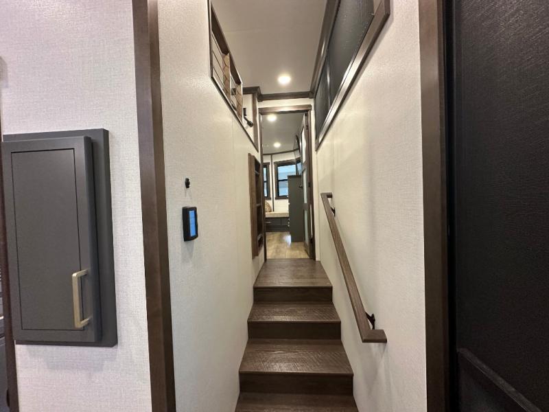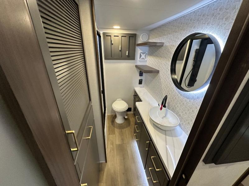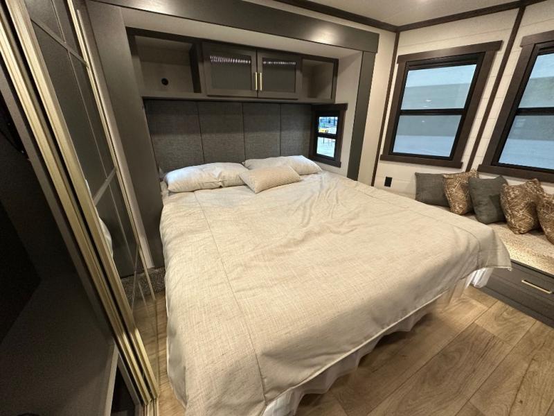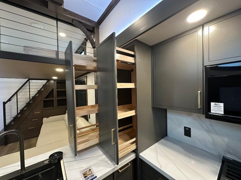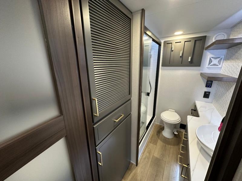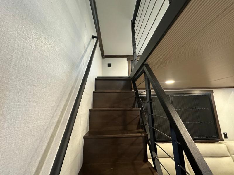 It will be so easy to enjoy extended stays in this destination fifth wheel! There is a large slide out in the main living area, a counter peninsula for more counter space, and a flip-down bar top to dine at. You'll find a comfy place to relax on the sectional sofa with a trundle bed underneath for added sleeping space. There is a loft area above the living room that includes two bunk mats and loft windows so this space seems larger, and the second loft is found above the spacious full bath. Speaking of the bath, you'll find a spacious shower and sink plus washer and dryer prep if you want the option to make laundry day easier. The front private bedroom features a king bed slide out, a front bench seat, a large wardrobe, and a dresser with a TV above to watch movies in bed.