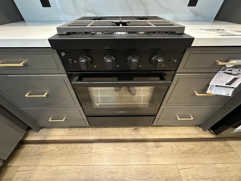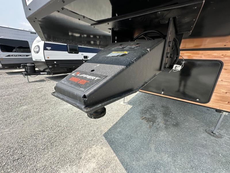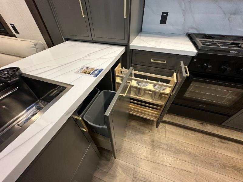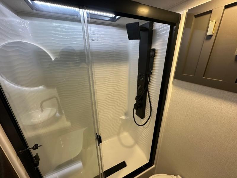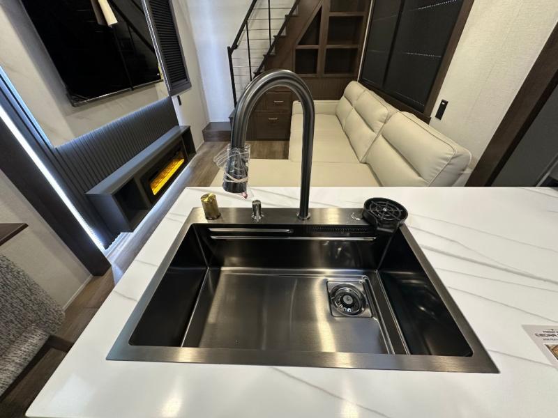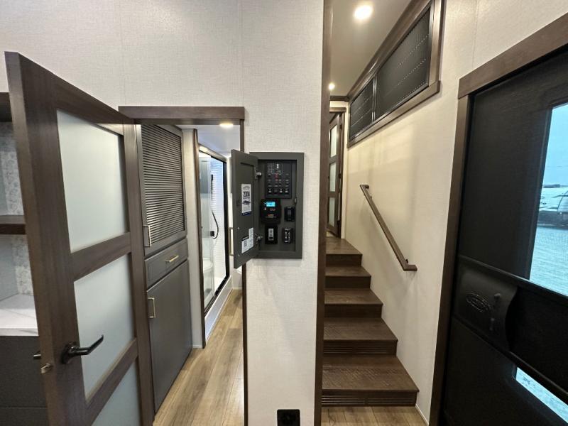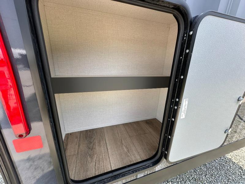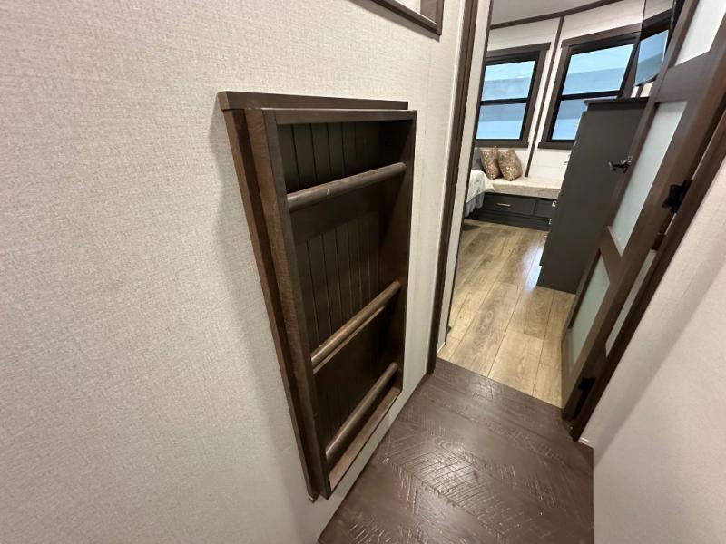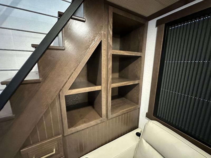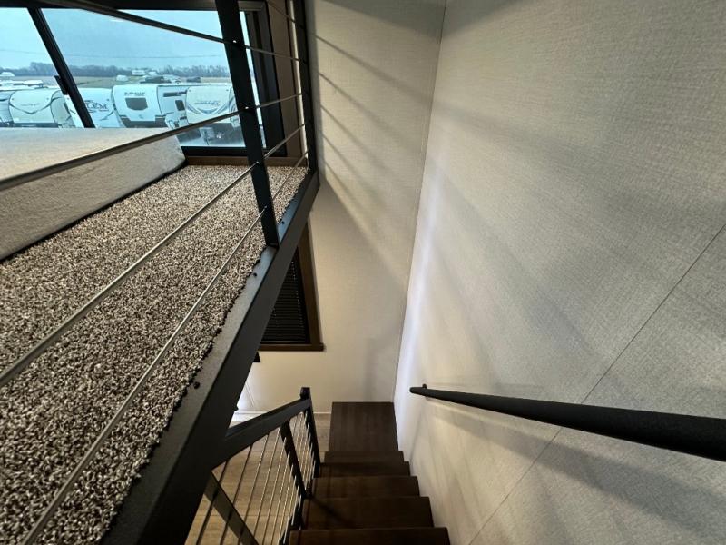 It will be so easy to enjoy extended stays in this destination fifth wheel! There is a large slide out in the main living area, a counter peninsula for more counter space, and a flip-down bar top to dine at. You'll find a comfy place to relax on the sectional sofa with a trundle bed underneath for added sleeping space. There is a loft area above the living room that includes two bunk mats and loft windows so this space seems larger, and the second loft is found above the spacious full bath. Speaking of the bath, you'll find a spacious shower and sink plus washer and dryer prep if you want the option to make laundry day easier. The front private bedroom features a king bed slide out, a front bench seat, a large wardrobe, and a dresser with a TV above to watch movies in bed.