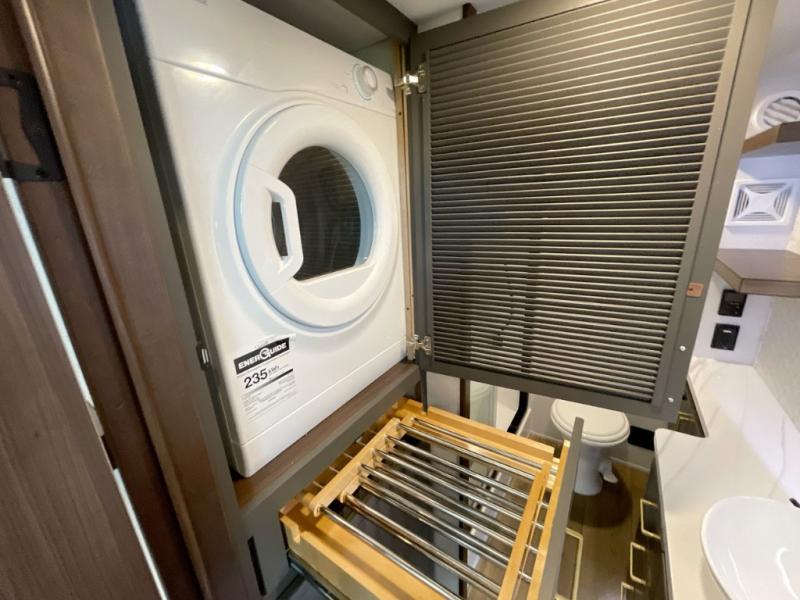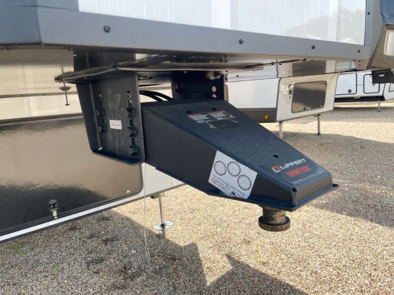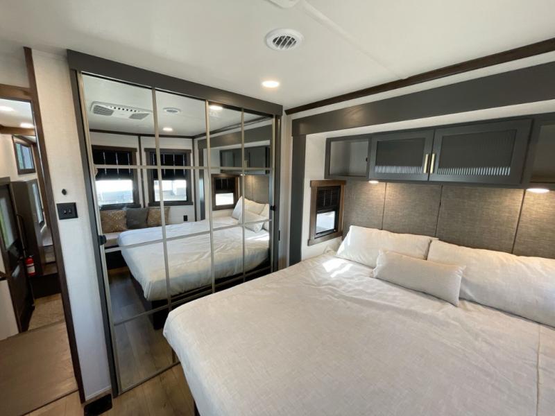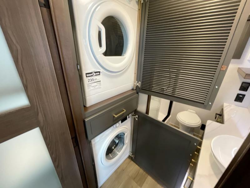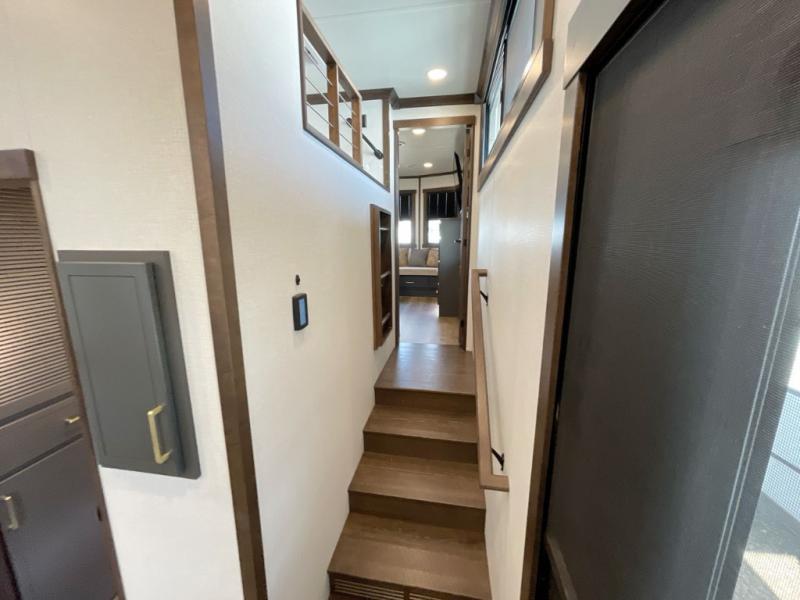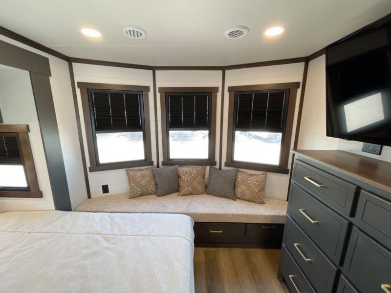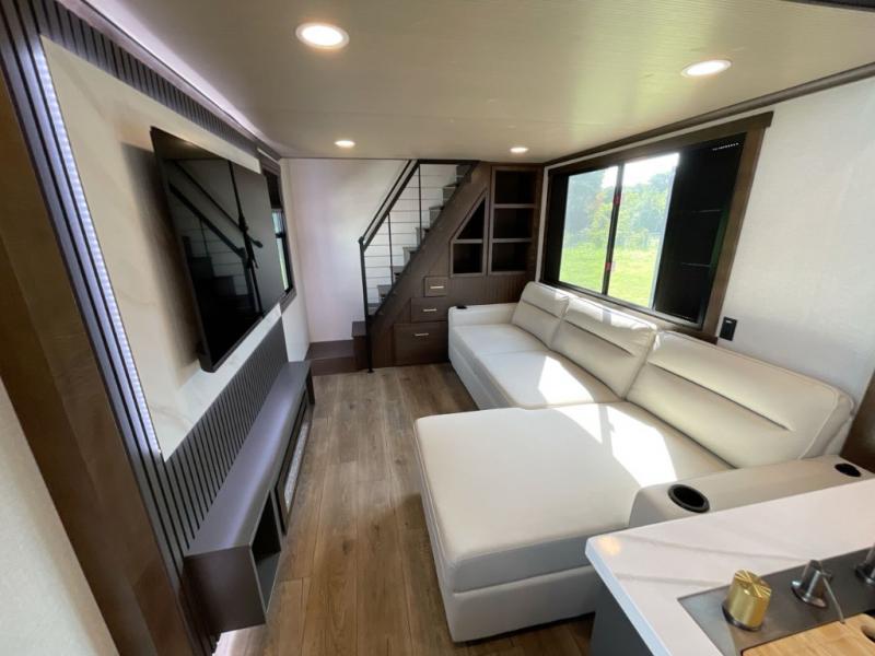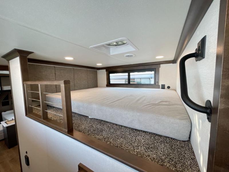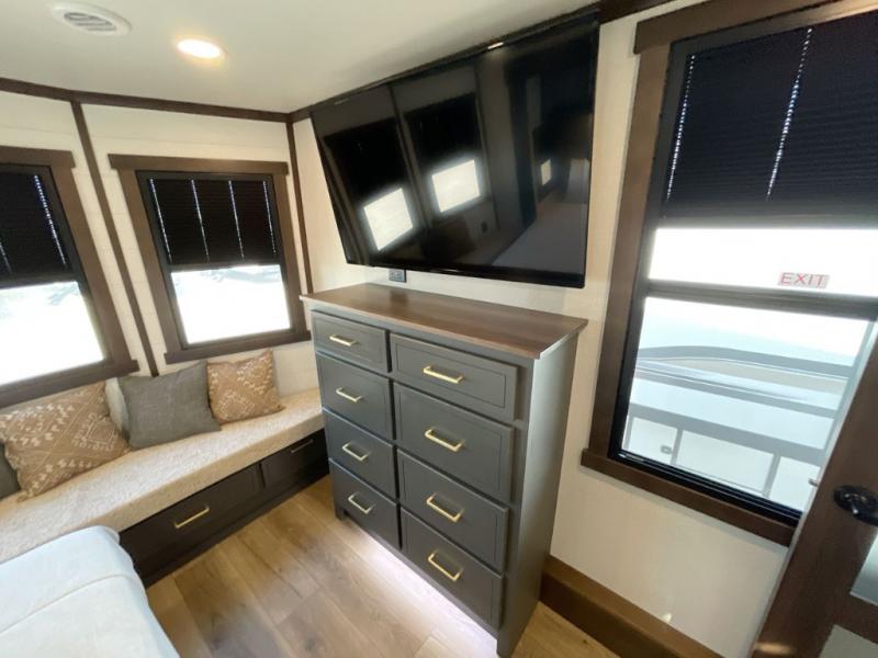 It will be so easy to enjoy extended stays in this destination fifth wheel! There is a large slide out in the main living area, a counter peninsula for more counter space, and a flip-down bar top to dine at. You'll find a comfy place to relax on the sectional sofa with a trundle bed underneath for added sleeping space. There is a loft area above the living room that includes two bunk mats and loft windows so this space seems larger, and the second loft is found above the spacious full bath. Speaking of the bath, you'll find a spacious shower and sink plus washer and dryer prep if you want the option to make laundry day easier. The front private bedroom features a king bed slide out, a front bench seat, a large wardrobe, and a dresser with a TV above to watch movies in bed.