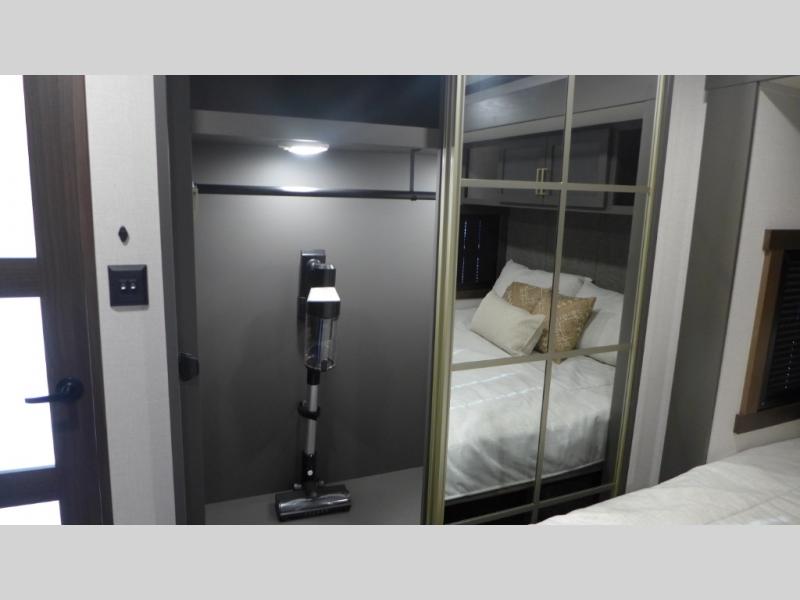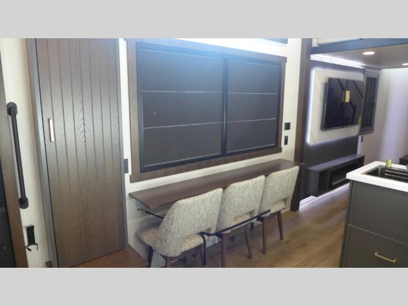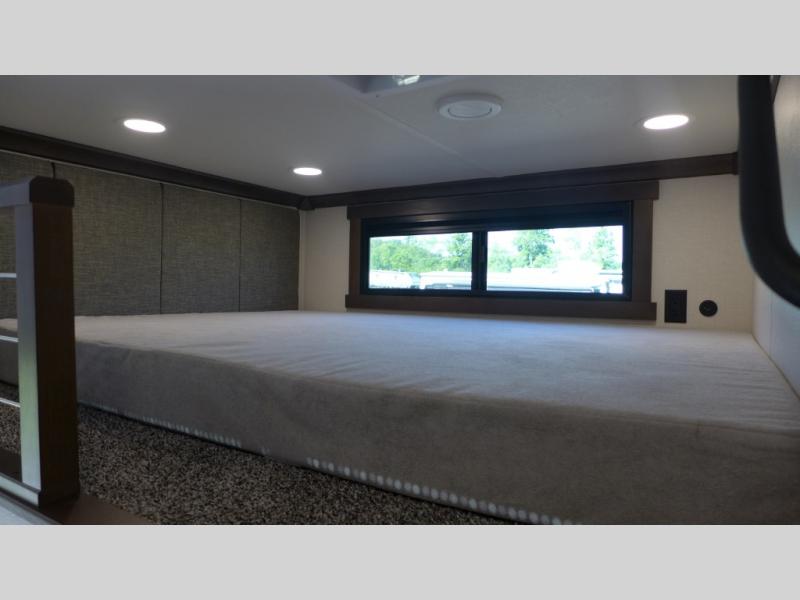 This spacious fifth wheel is perfect for families and friends! The rear living area is a cozy retreat, featuring a comfortable sectional sofa, a TV, and a warm fireplace. The loft above offers additional sleeping space for kids or guests, with two bunk mats providing a comfortable spot to rest. The kitchen is fully equipped with a pantry, overhead cabinets, and a flip-down bar top, perfect for beverage prep. The full bathroom features a linen closet and a loft above with a bunk mat, providing additional sleeping space for kids or guests. The front main bedroom is a peaceful retreat, featuring a king bed, closet, and overhead cabinets, making it easy to rest and recharge energy for the next day.
