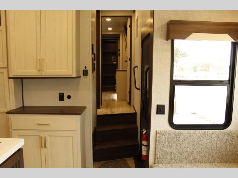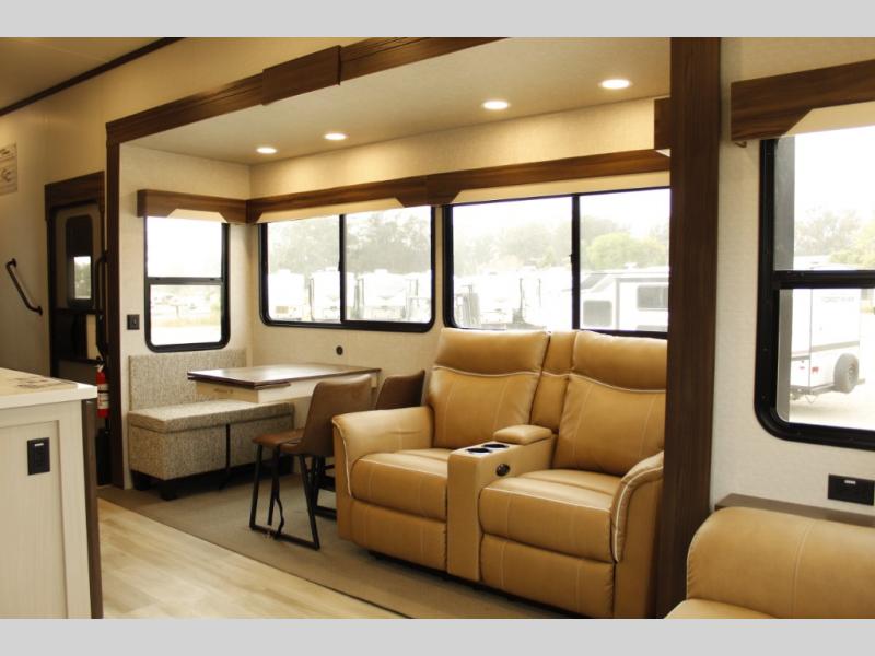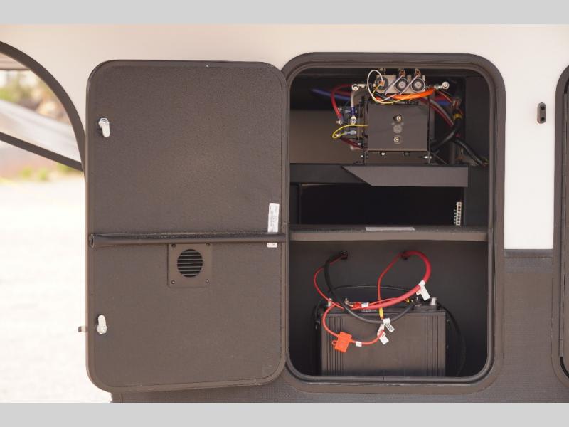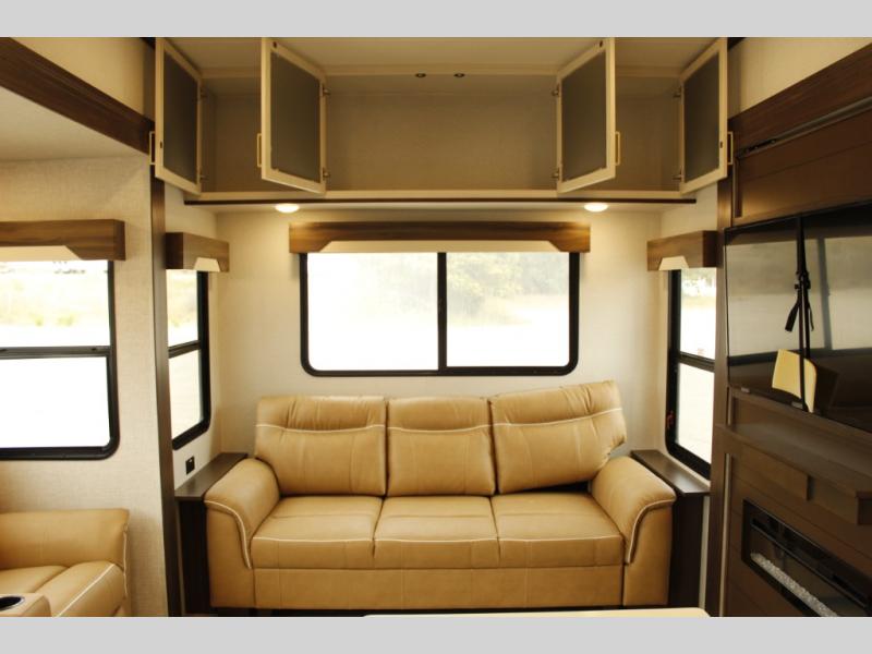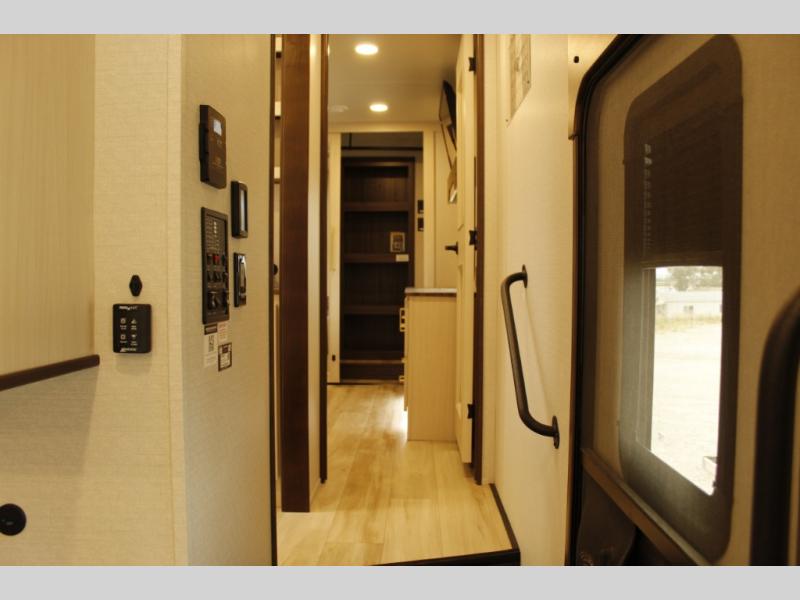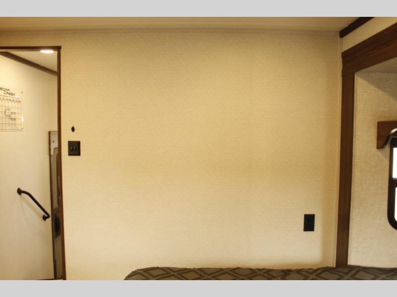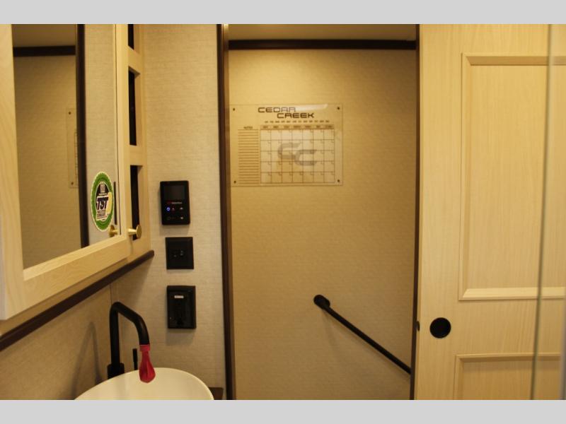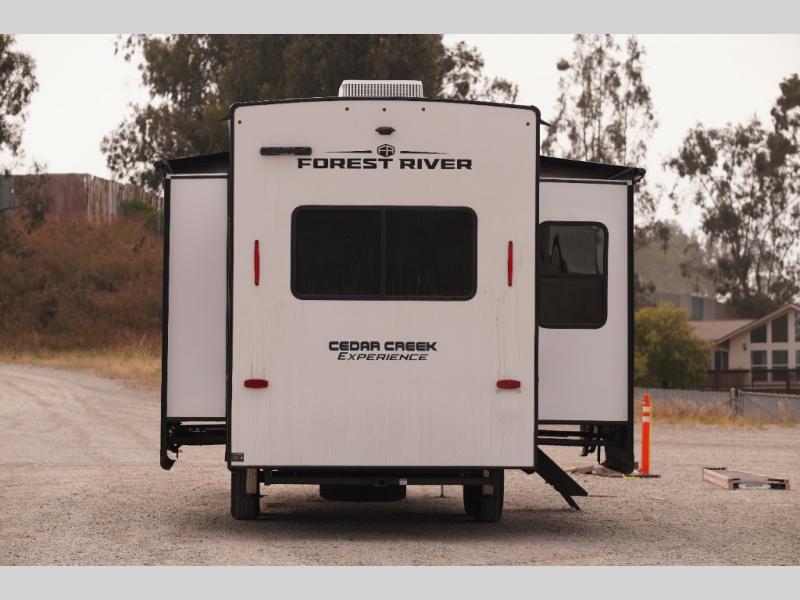 With any Cedar Creek Experience fifth wheel by Forest River, you will bet met with luxury features both inside and out! The True Gelcoat exterior is the best of the best in exteriors and the 3M bonded sidewalls will hold up over years of use. There is also a new 101'' wide-body frame, a Road Warrior suspension, plus a TST tire pressure monitoring system to make towing that much easier. You will find a hidden front storage compartment, along with a 4' x 6' ABS, ribbed, removable underbelly panels, and 6-point hydraulic leveling system, plus many more exterior conveniences. The interior will have you feeling like you haven't left home with vinyl floor coverings, power theater seating with USB ports, a cozy fireplace, vinyl floor covering and the list of comforts goes on! Each model is also pre-wired for satellite to the roof, and you're sure to never go bored with a Smart TV in the bedroom!