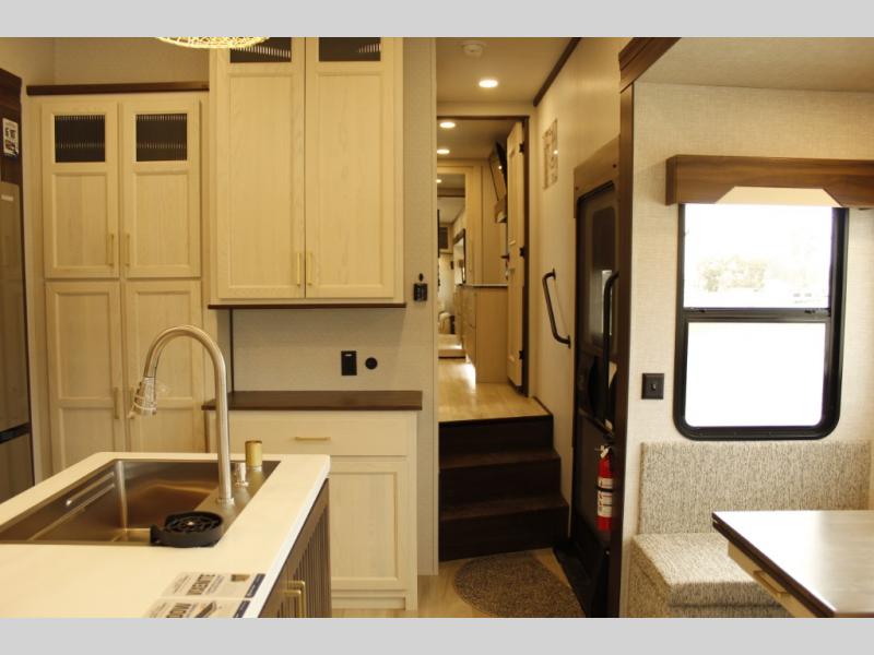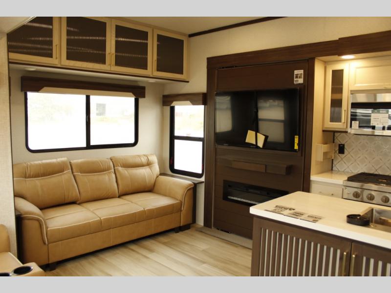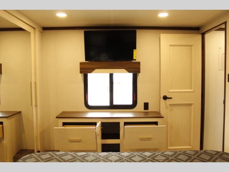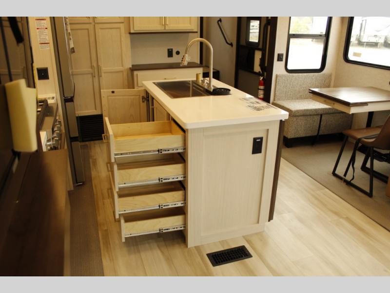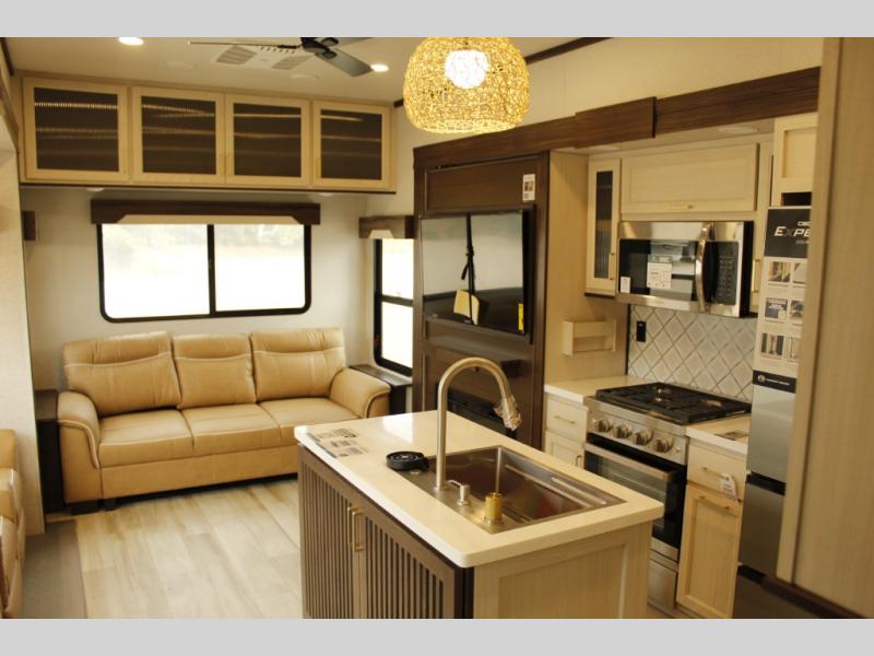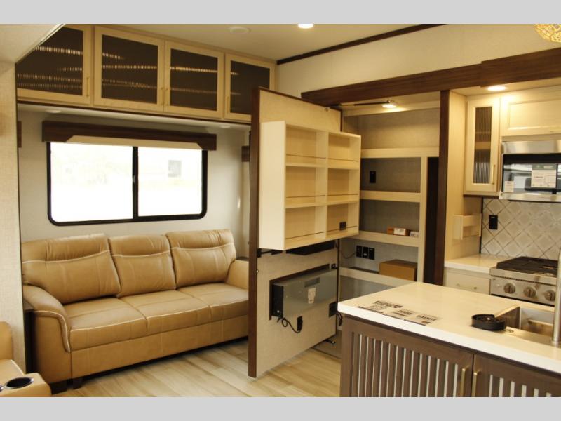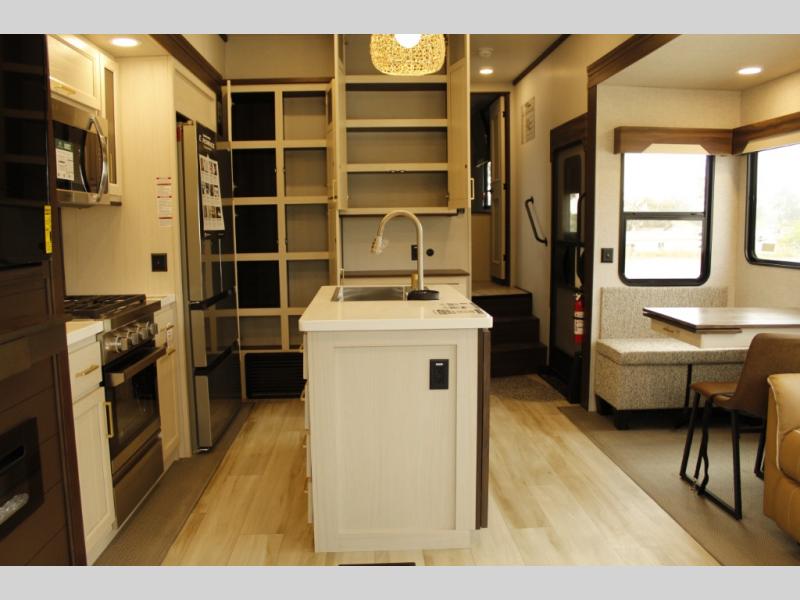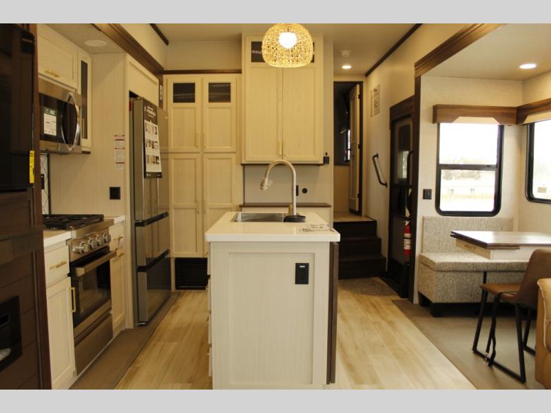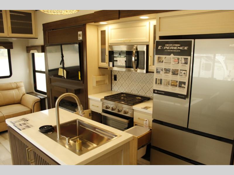 You will love this Cedar Creek Experience fifth wheel! The front bedroom is spacious with a king bed and a wardrobe that keeps on going, with room for hanging garments, shelves, and washer/dryer prep. There's also a standalone dresser with a TV above so you can watch some shows before bed. The bathroom also offers space efficiency with a sliding glass door, and the roomy shower even has a seat for your convenience while bathing. The rear of this unit feels wide open with a lovely living area and kitchen. The kitchen rivals the one at home, with a three-burner cooktop, microwave, and 18 cu. ft. 12V refrigerator with an ice maker. And check out the Murphy pantry that is hidden behind the entertainment center! You'll have tons of storage space with overhead cabinets and a pantry. The kitchen island with a spacious sink is the perfect final touch. After you eat you can relax and watch TV on the power theater seats or the hide-a-bed sofa. There is also a wall mounted dining table and extension with an ottoman for more seating space!