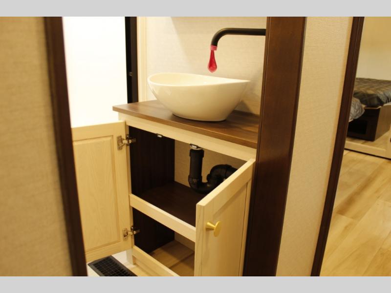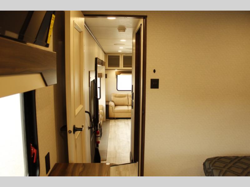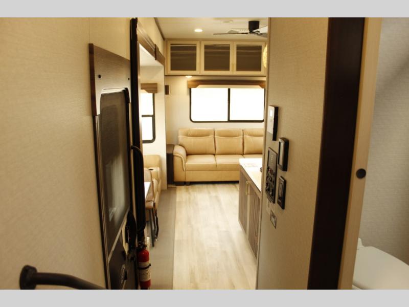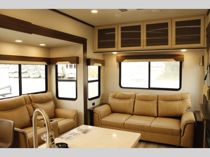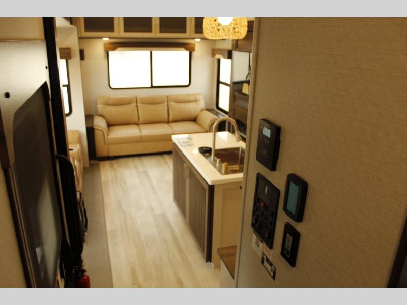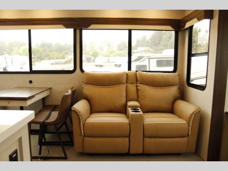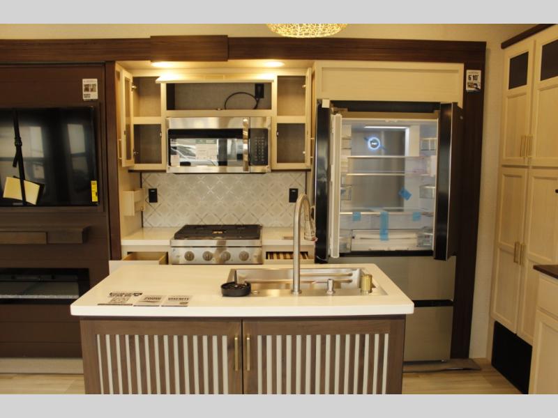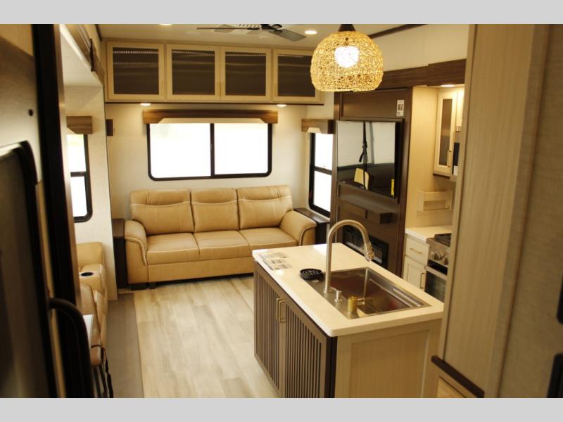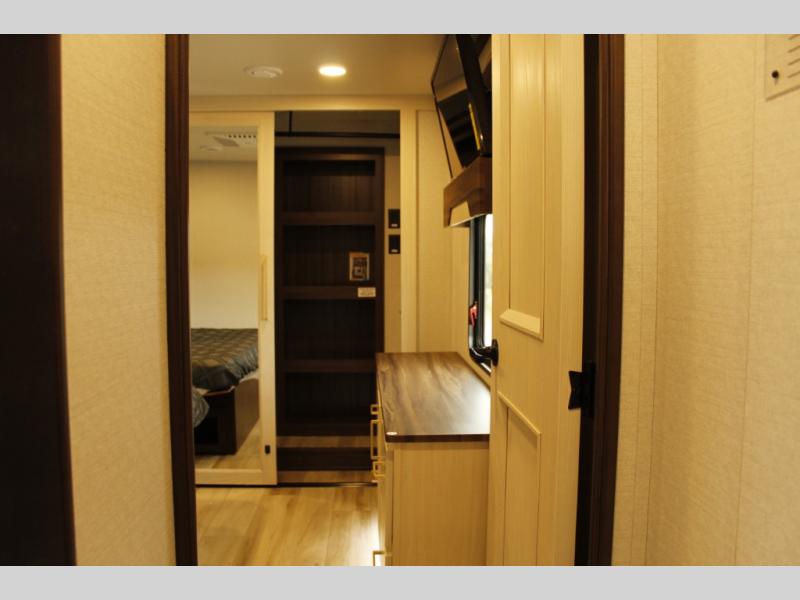 You will love this Cedar Creek Experience fifth wheel! The front bedroom is spacious with a king bed and a wardrobe that keeps on going, with room for hanging garments, shelves, and washer/dryer prep. There's also a standalone dresser with a TV above so you can watch some shows before bed. The bathroom also offers space efficiency with a sliding glass door, and the roomy shower even has a seat for your convenience while bathing. The rear of this unit feels wide open with a lovely living area and kitchen. The kitchen rivals the one at home, with a three-burner cooktop, microwave, and 18 cu. ft. 12V refrigerator with an ice maker. And check out the Murphy pantry that is hidden behind the entertainment center! You'll have tons of storage space with overhead cabinets and a pantry. The kitchen island with a spacious sink is the perfect final touch. After you eat you can relax and watch TV on the power theater seats or the hide-a-bed sofa. There is also a wall mounted dining table and extension with an ottoman for more seating space!