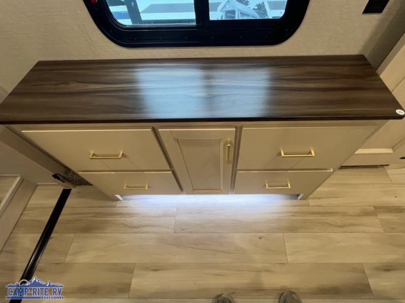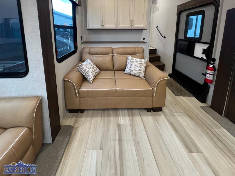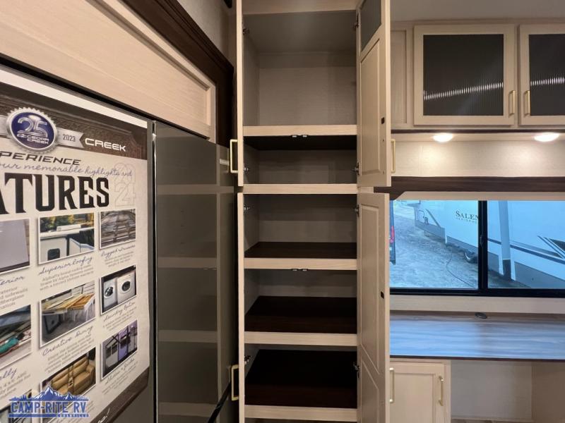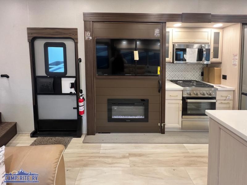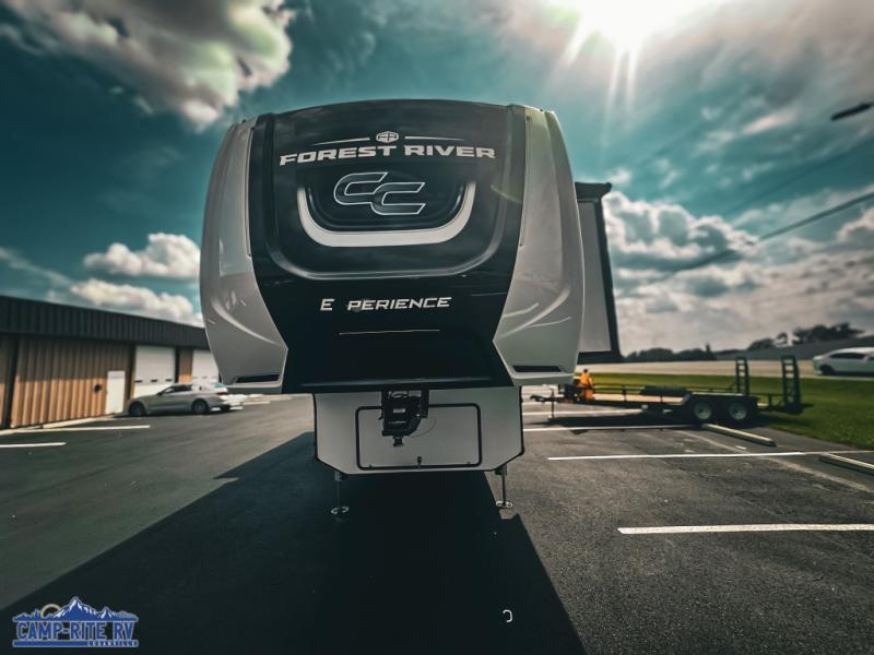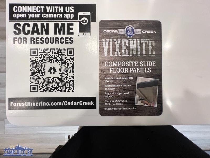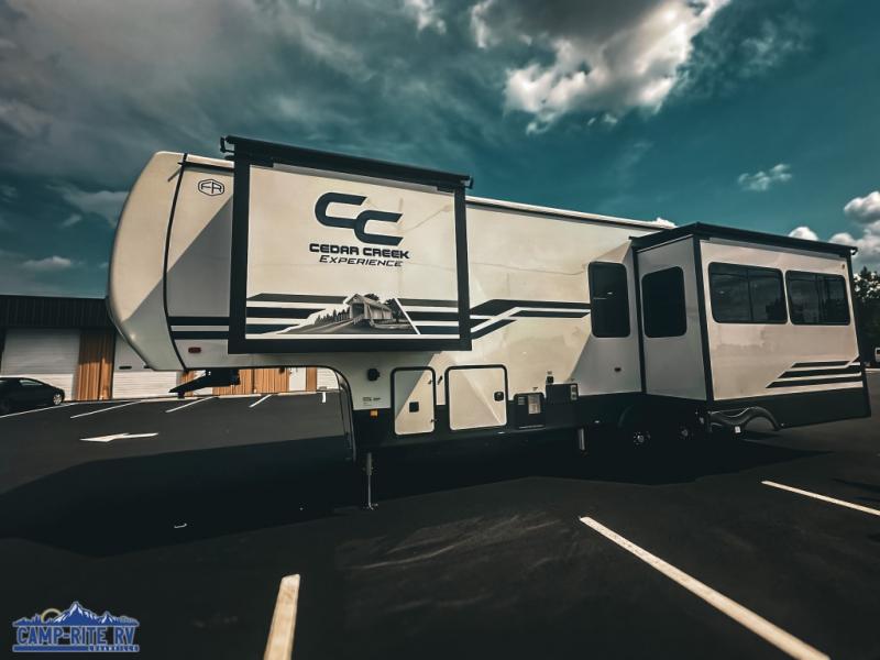 With any Cedar Creek Experience fifth wheel by Forest River, you will bet met with luxury features both inside and out! The True Gelcoat exterior is the best of the best in exteriors and the 3M bonded sidewalls will hold up over years of use. There is also a new 101'' wide-body frame, a Road Warrior suspension, plus a TST tire pressure monitoring system to make towing that much easier. You will find a hidden front storage compartment, along with a 4' x 6' ABS, ribbed, removable underbelly panels, and 6-point hydraulic leveling system, plus many more exterior conveniences. The interior will have you feeling like you haven't left home with vinyl floor coverings, power theater seating with USB ports, a cozy fireplace, vinyl floor covering and the list of comforts goes on! Each model is also pre-wired for satellite to the roof, and you're sure to never go bored with a Smart TV in the bedroom!
