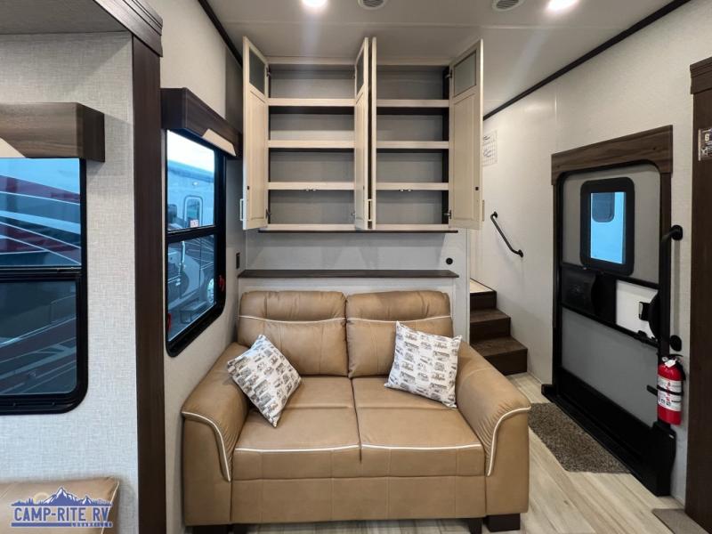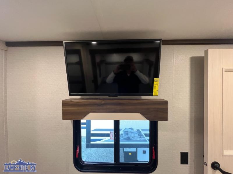 Get ready to work and play in this Cedar Creek Experience fifth wheel! The living area features a desk area with overhead storage so you can set up a dedicated work space and get things done while you're away. Of course you'll spend most of your time relaxing and having fun. The 15' power awning will allow you to set up an exterior space as well, to relax or set up some outdoor yard games. Inside you will love the front bedroom with king bed, the well-equipped kitchen, and the living area with both power theater seats and a hide-a-bed sofa for lounging. Three slide outs give you lots of floor space and a roomy feel for everything you might want to do, like watch a movie on the Smart TV or relax by the fireplace!