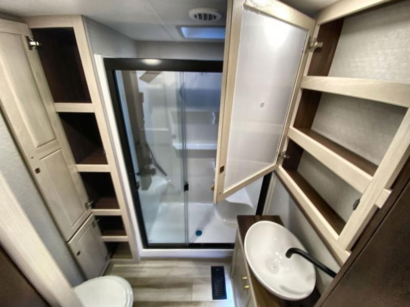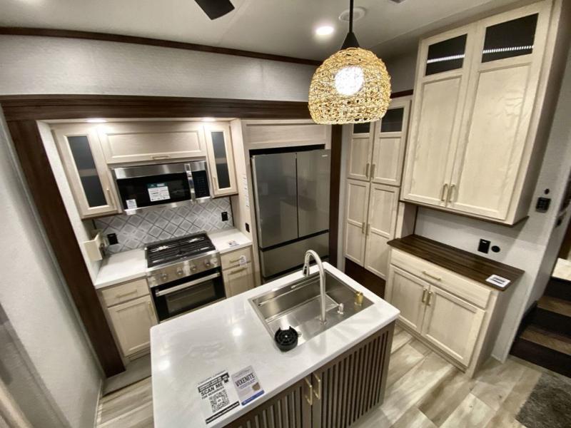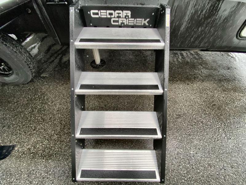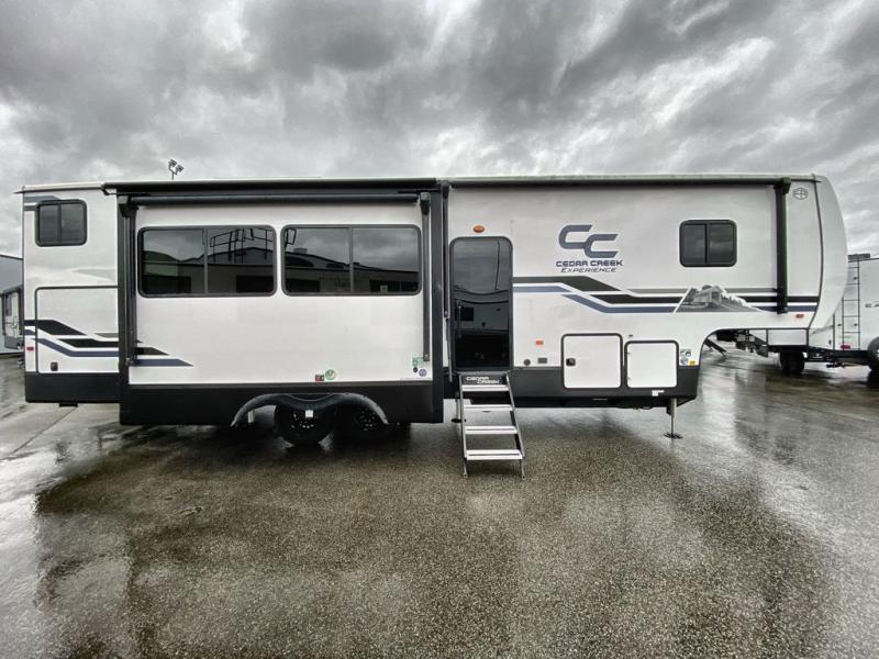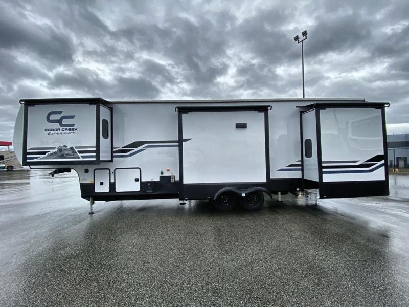 With any Cedar Creek Experience fifth wheel by Forest River, you will bet met with luxury features both inside and out! The True Gelcoat exterior is the best of the best in exteriors and the 3M bonded sidewalls will hold up over years of use. There is also a new 101'' wide-body frame, a Road Warrior suspension, plus a TST tire pressure monitoring system to make towing that much easier. You will find a hidden front storage compartment, along with a 4' x 6' ABS, ribbed, removable underbelly panels, and 6-point hydraulic leveling system, plus many more exterior conveniences. The interior will have you feeling like you haven't left home with vinyl floor coverings, power theater seating with USB ports, a cozy fireplace, vinyl floor covering and the list of comforts goes on! Each model is also pre-wired for satellite to the roof, and you're sure to never go bored with a Smart TV in the bedroom!