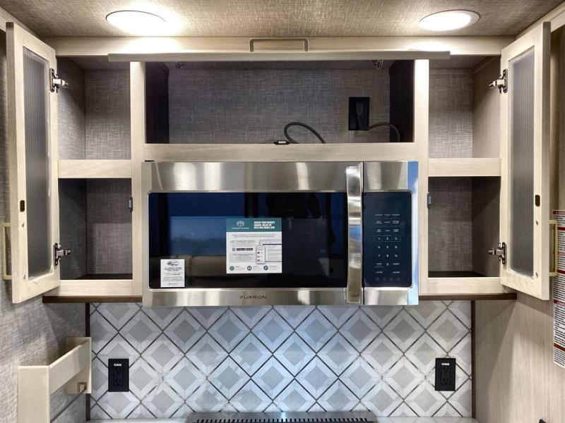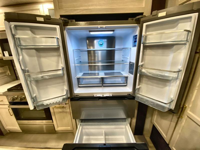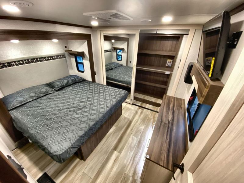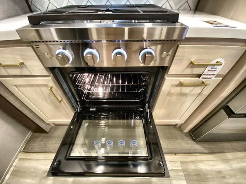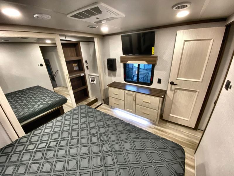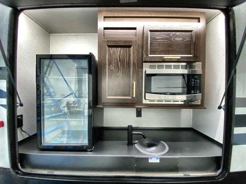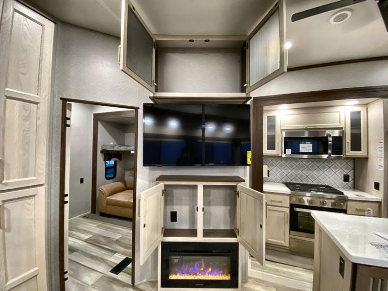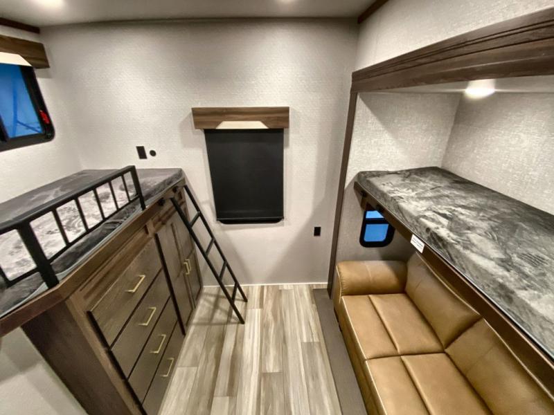If you have a large group, this Cedar Creek Experience fifth wheel is for you. A rear bunkhouse offers tons of flexibility, with an upper bunk above a sofa on one side and a TV/drawer unit on the other. At the opposite end you have a private front bedroom with king bed, dresser, TV, and a sliding door closet that includes shelving and washer/dryer prep. A central kitchen is as nice as the one at home, with an 18 cu. ft. 12V refrigerator with an ice maker, a three burner cooktop, and a stainless steel 30" over-the-range microwave. There is also a center island with a large sink for easy clean up. You'll love to relax by the fireplace on the power theater seats, where you can watch either the TV or the fireplace - or both! Outside you'll find even more amenities including a 15' awning plus an outdoor refrigerator and microwave!