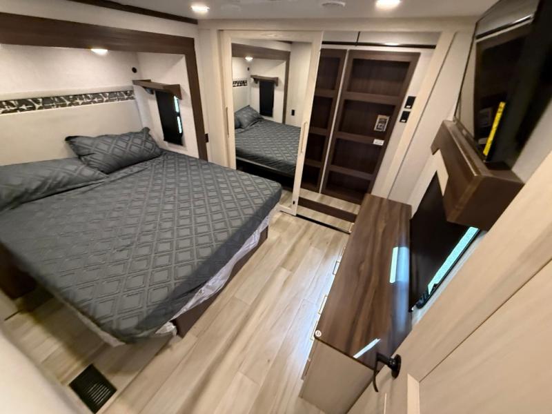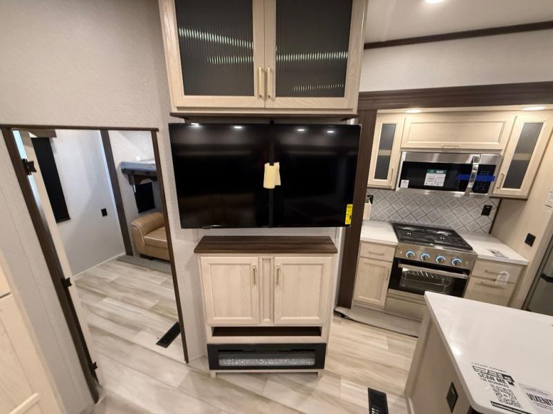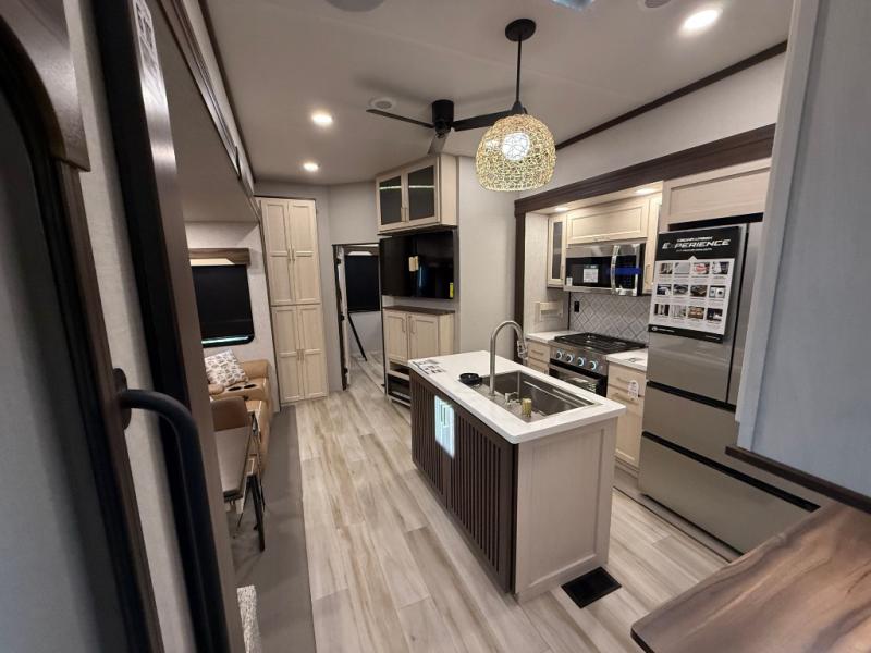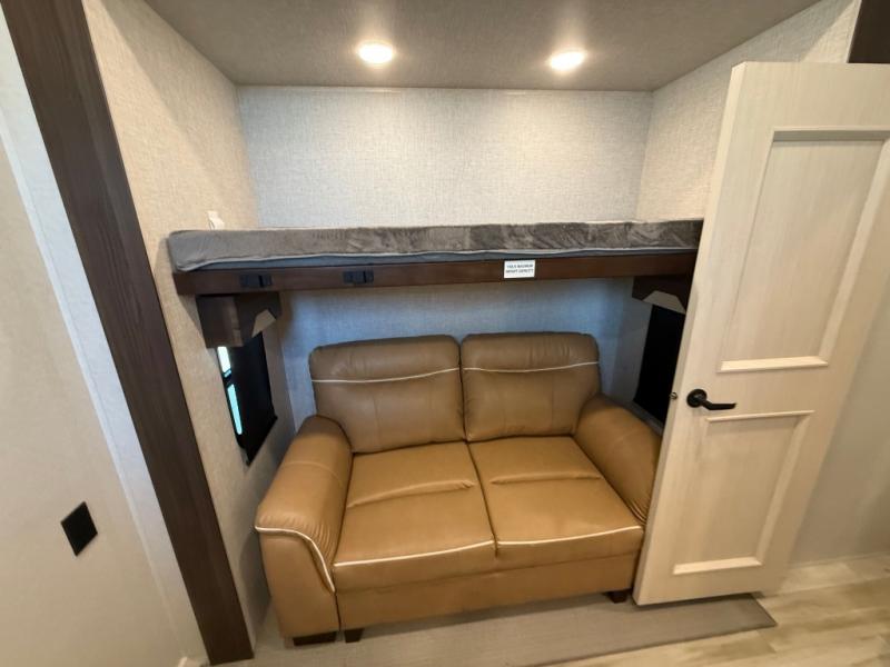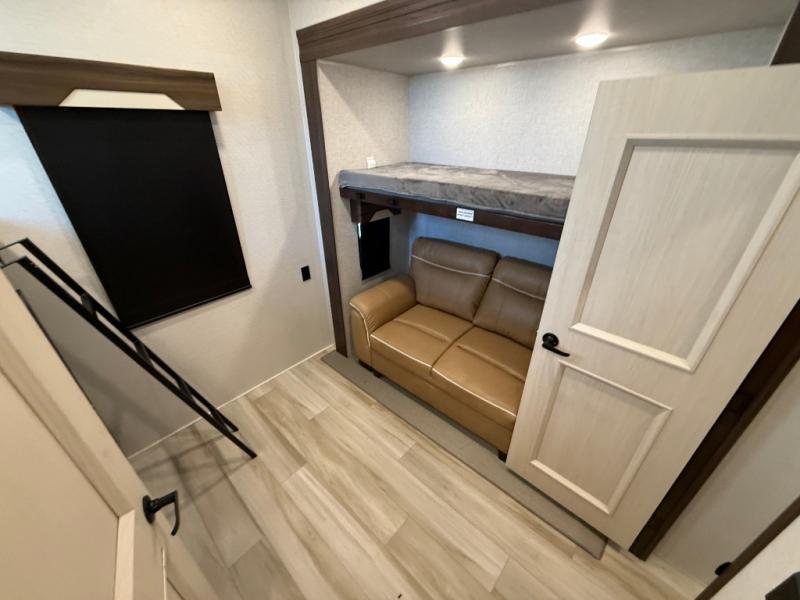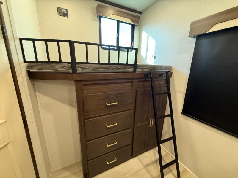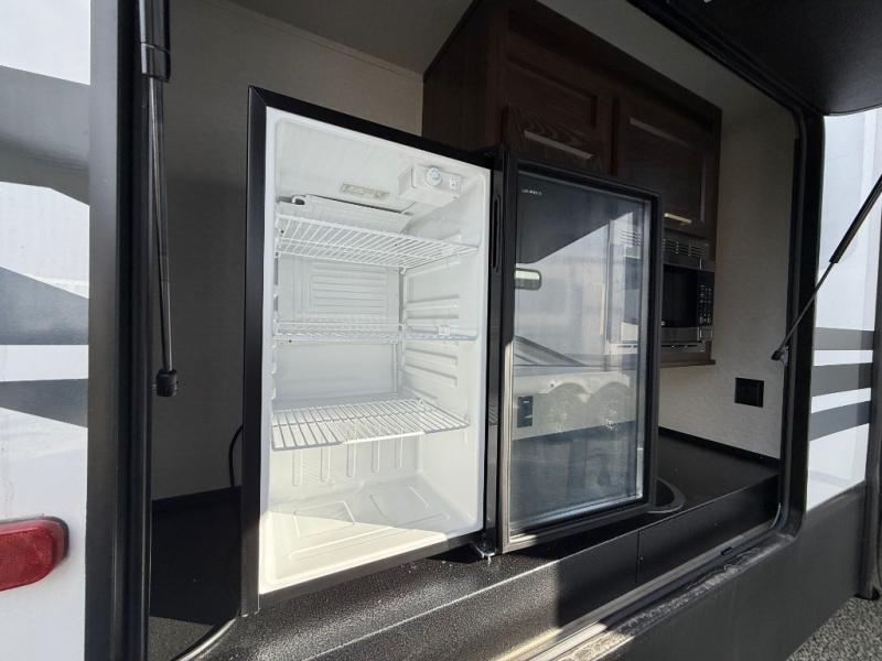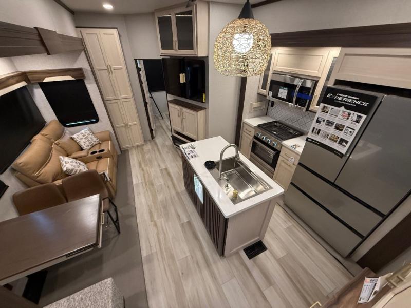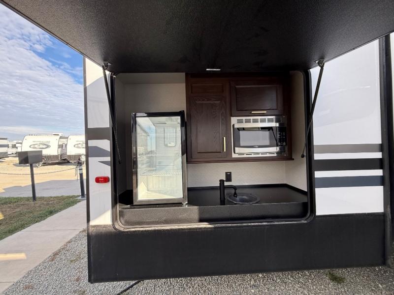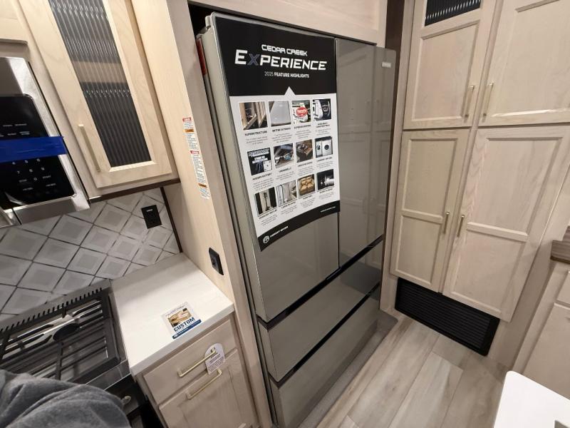 If you have a large group, this Cedar Creek Experience fifth wheel is for you. A rear bunkhouse offers tons of flexibility, with an upper bunk above a sofa on one side and a TV/drawer unit on the other. At the opposite end you have a private front bedroom with king bed, dresser, TV, and a sliding door closet that includes shelving and washer/dryer prep. A central kitchen is as nice as the one at home, with an 18 cu. ft. 12V refrigerator with an ice maker, a three burner cooktop, and a stainless steel 30" over-the-range microwave. There is also a center island with a large sink for easy clean up. You'll love to relax by the fireplace on the power theater seats, where you can watch either the TV or the fireplace - or both! Outside you'll find even more amenities including a 15' awning plus an outdoor refrigerator and microwave!