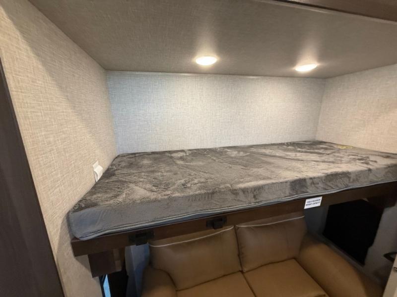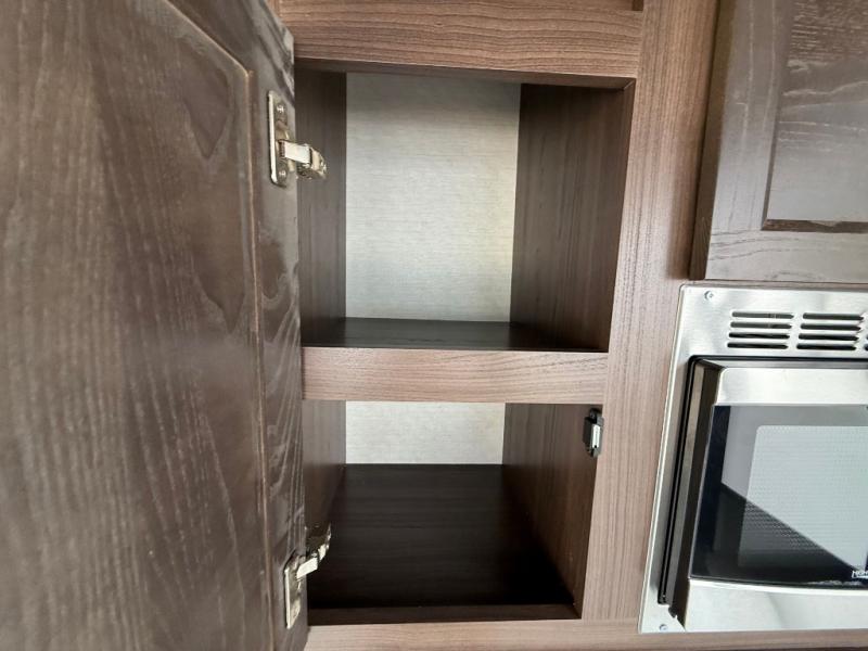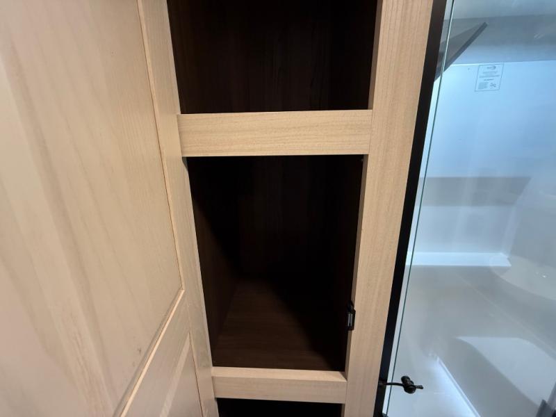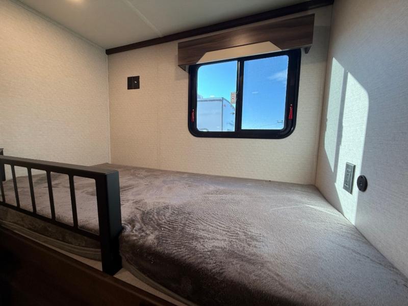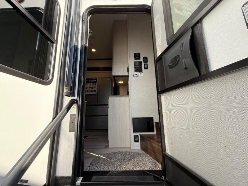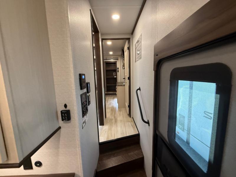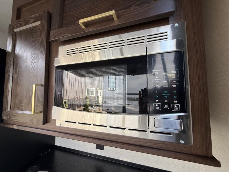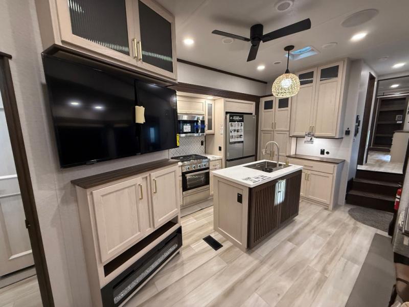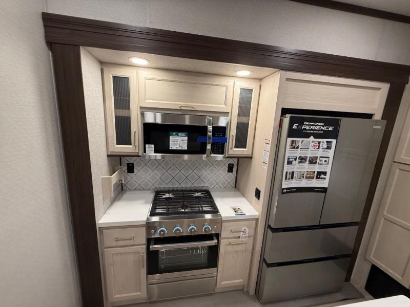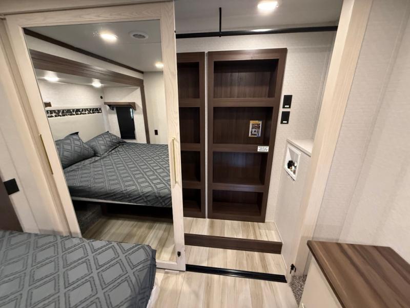 If you have a large group, this Cedar Creek Experience fifth wheel is for you. A rear bunkhouse offers tons of flexibility, with an upper bunk above a sofa on one side and a TV/drawer unit on the other. At the opposite end you have a private front bedroom with king bed, dresser, TV, and a sliding door closet that includes shelving and washer/dryer prep. A central kitchen is as nice as the one at home, with an 18 cu. ft. 12V refrigerator with an ice maker, a three burner cooktop, and a stainless steel 30" over-the-range microwave. There is also a center island with a large sink for easy clean up. You'll love to relax by the fireplace on the power theater seats, where you can watch either the TV or the fireplace - or both! Outside you'll find even more amenities including a 15' awning plus an outdoor refrigerator and microwave!