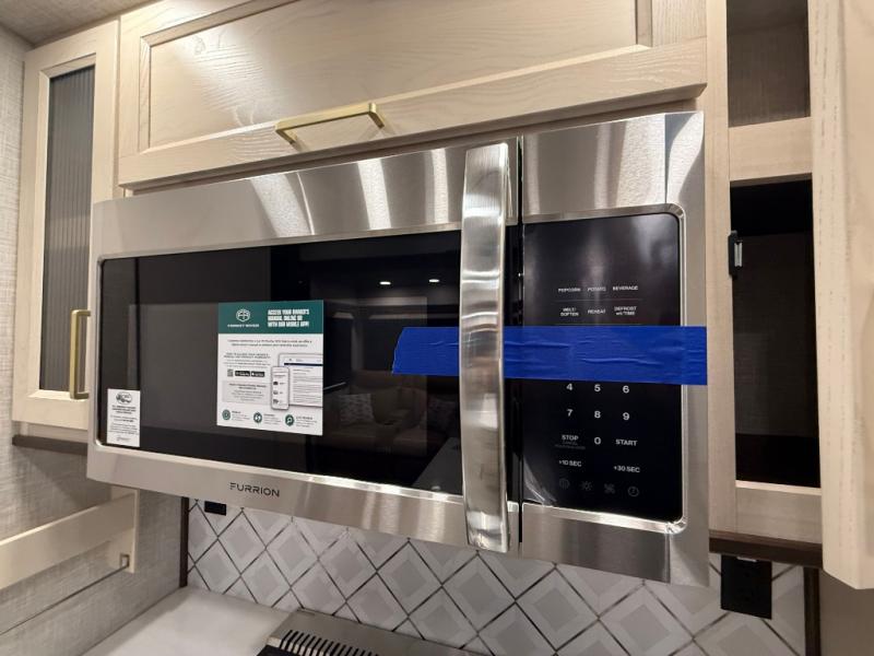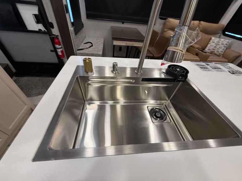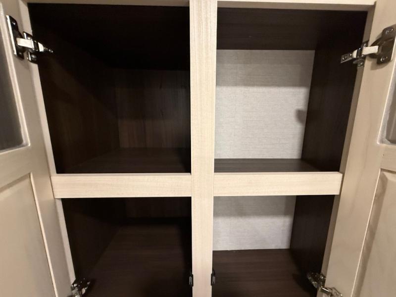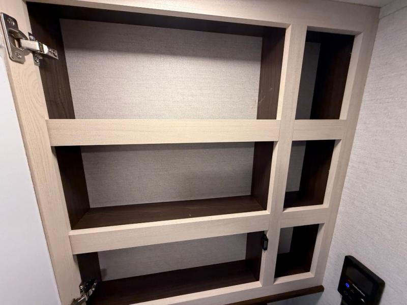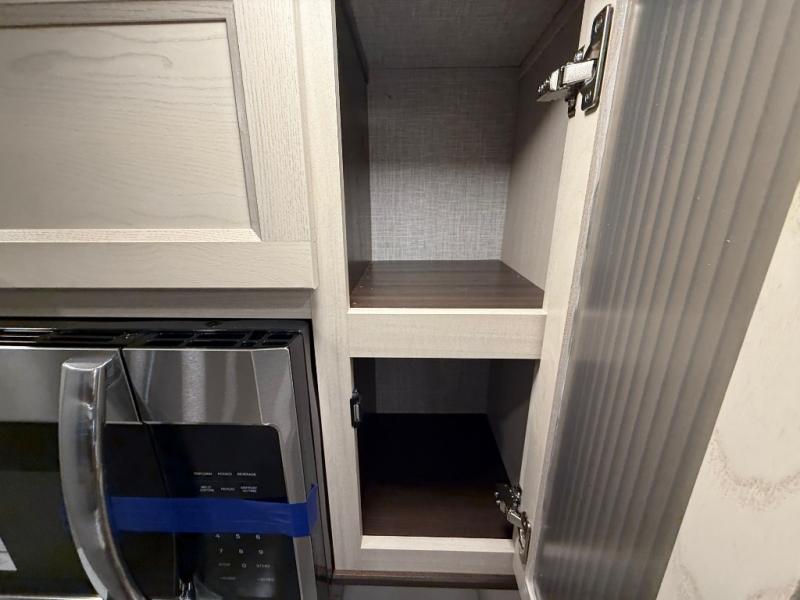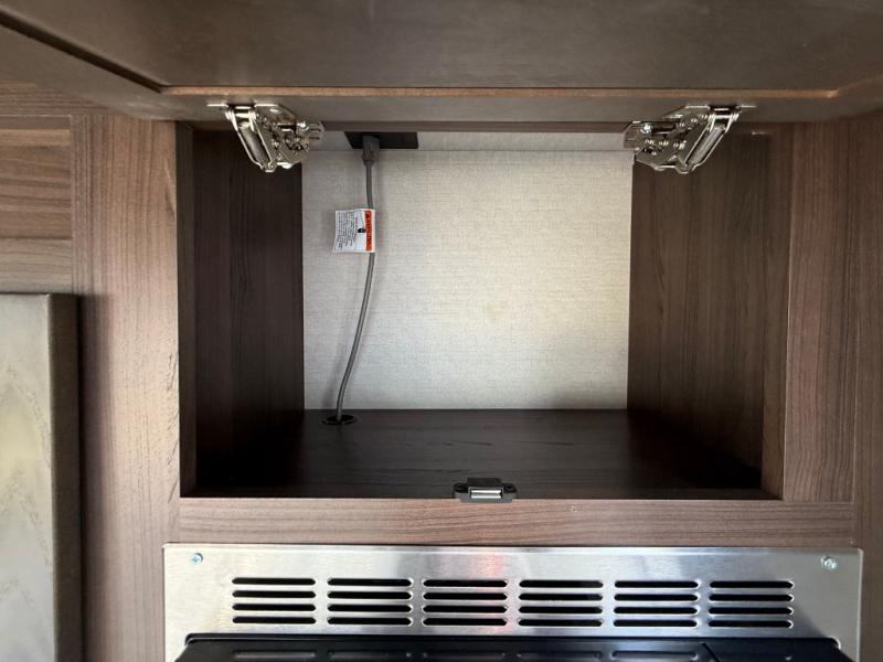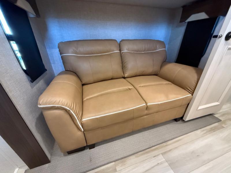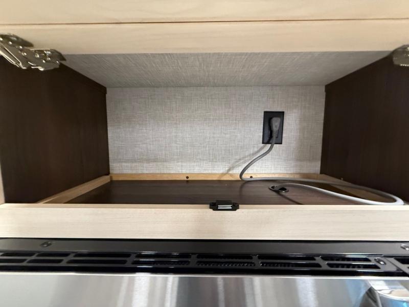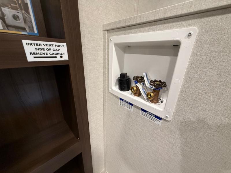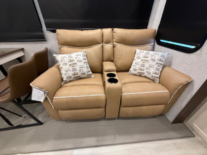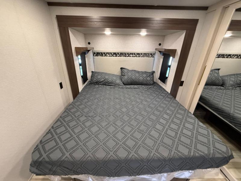 If you have a large group, this Cedar Creek Experience fifth wheel is for you. A rear bunkhouse offers tons of flexibility, with an upper bunk above a sofa on one side and a TV/drawer unit on the other. At the opposite end you have a private front bedroom with king bed, dresser, TV, and a sliding door closet that includes shelving and washer/dryer prep. A central kitchen is as nice as the one at home, with an 18 cu. ft. 12V refrigerator with an ice maker, a three burner cooktop, and a stainless steel 30" over-the-range microwave. There is also a center island with a large sink for easy clean up. You'll love to relax by the fireplace on the power theater seats, where you can watch either the TV or the fireplace - or both! Outside you'll find even more amenities including a 15' awning plus an outdoor refrigerator and microwave!