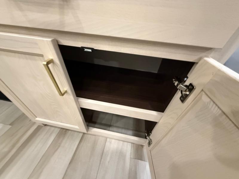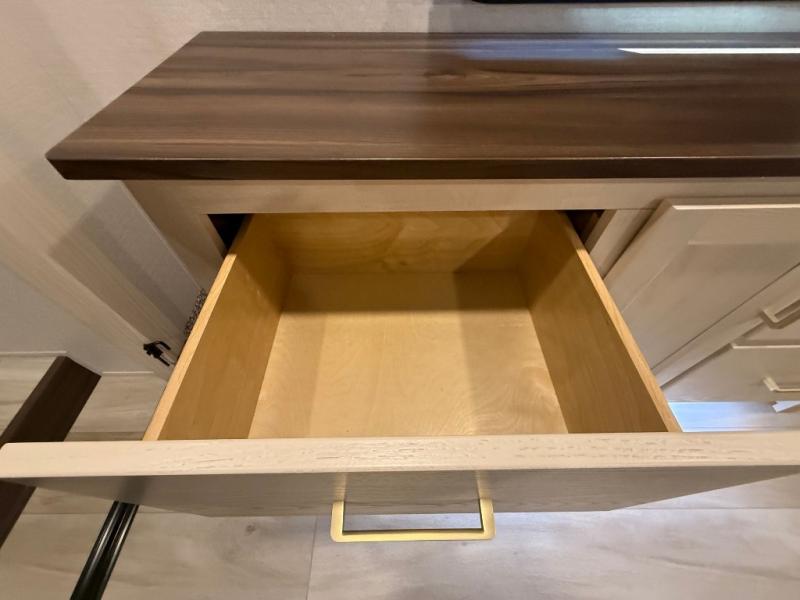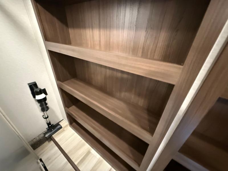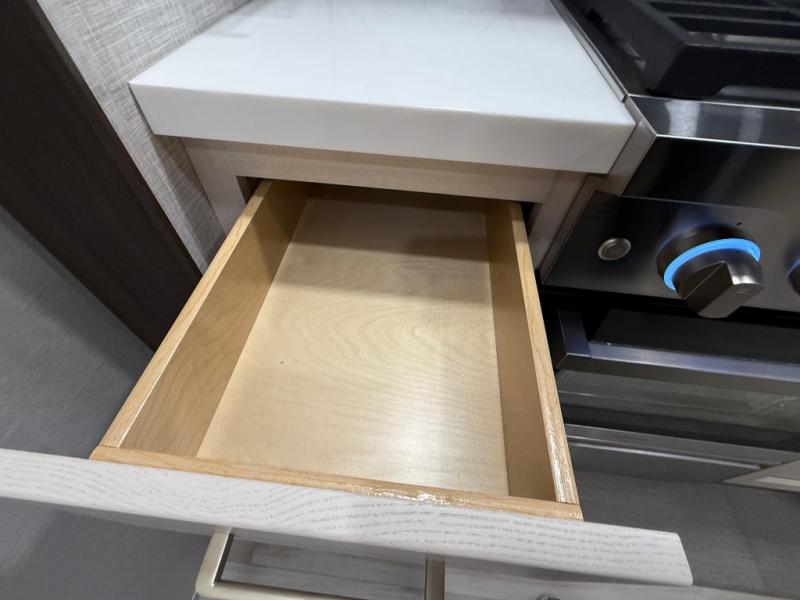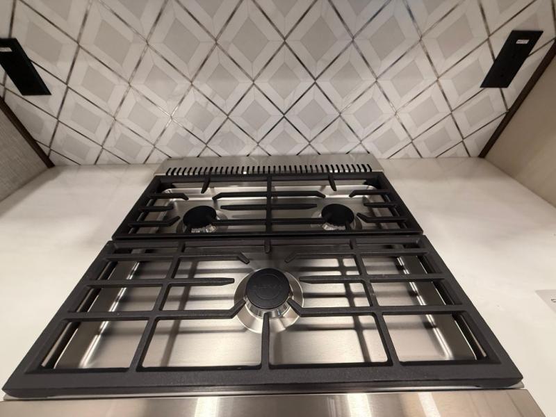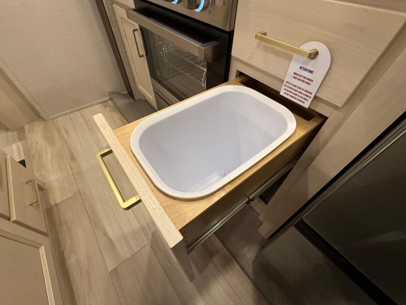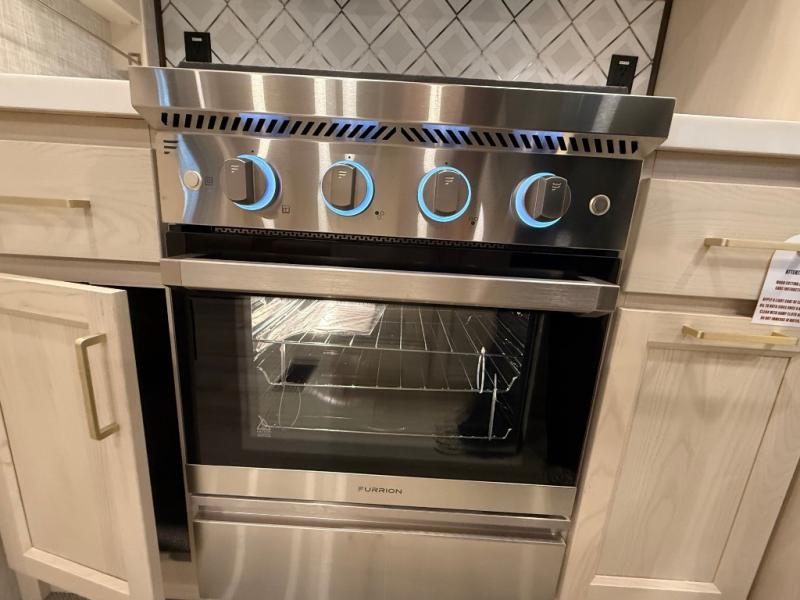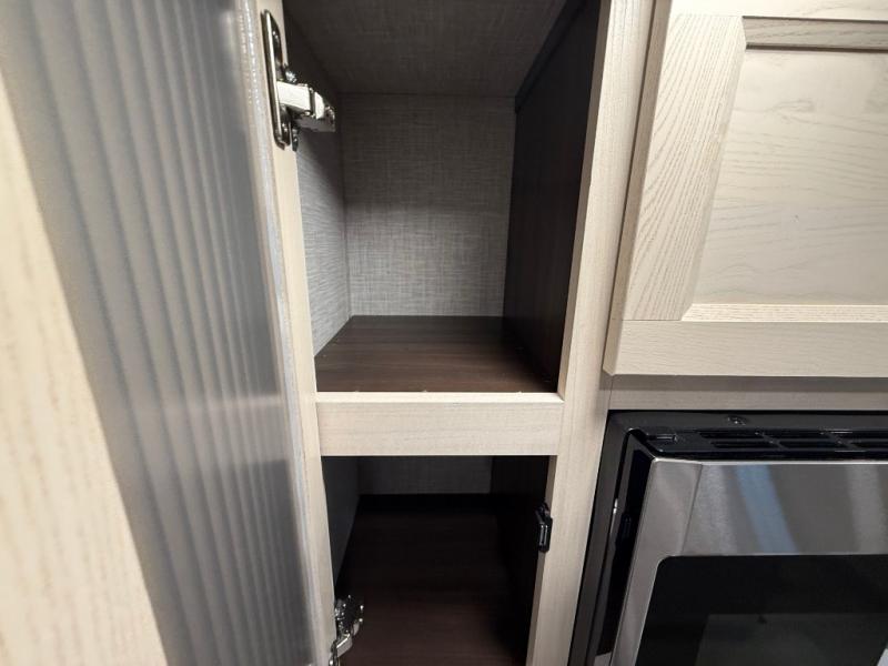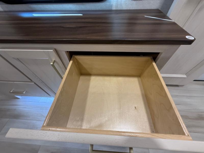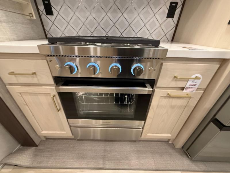 If you have a large group, this Cedar Creek Experience fifth wheel is for you. A rear bunkhouse offers tons of flexibility, with an upper bunk above a sofa on one side and a TV/drawer unit on the other. At the opposite end you have a private front bedroom with king bed, dresser, TV, and a sliding door closet that includes shelving and washer/dryer prep. A central kitchen is as nice as the one at home, with an 18 cu. ft. 12V refrigerator with an ice maker, a three burner cooktop, and a stainless steel 30" over-the-range microwave. There is also a center island with a large sink for easy clean up. You'll love to relax by the fireplace on the power theater seats, where you can watch either the TV or the fireplace - or both! Outside you'll find even more amenities including a 15' awning plus an outdoor refrigerator and microwave!