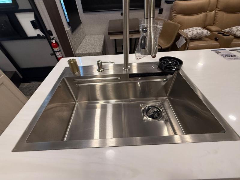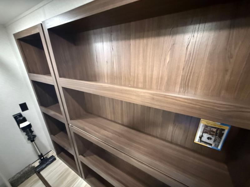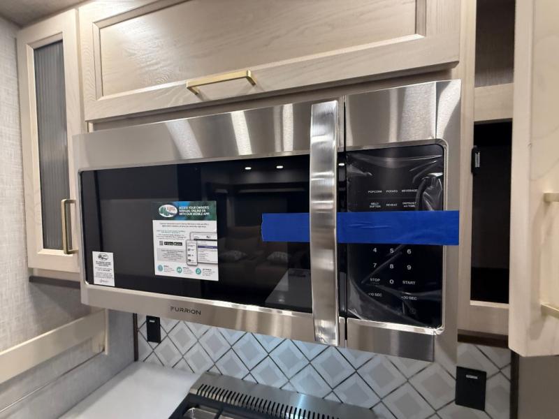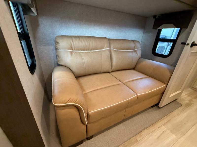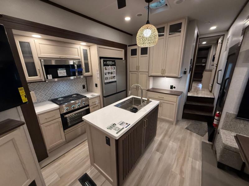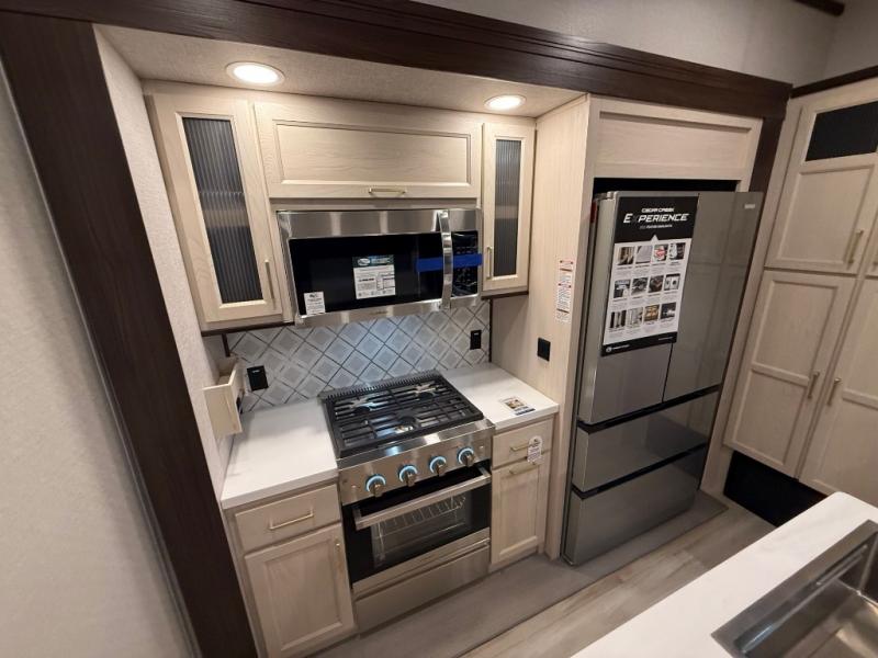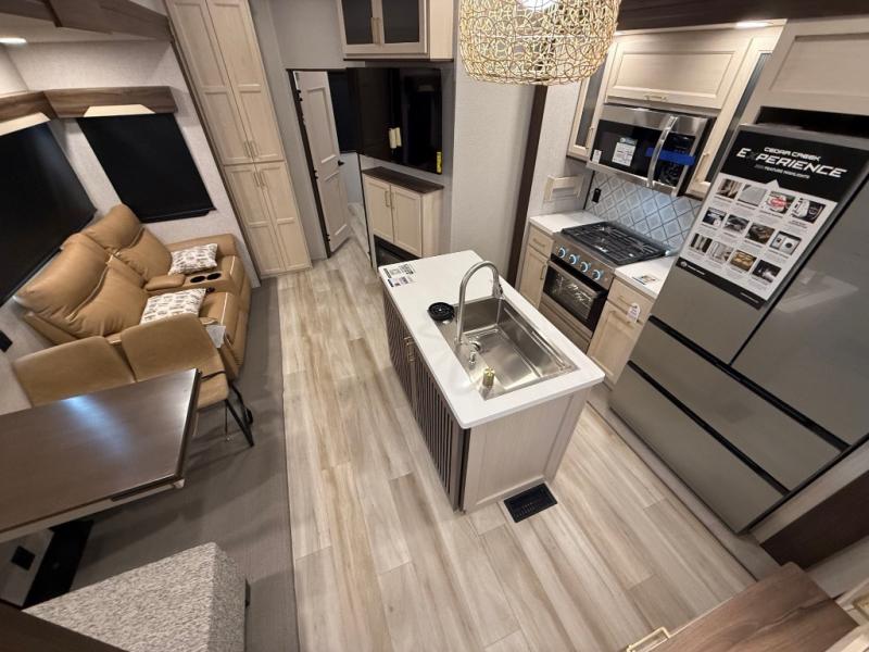 If you have a large group, this Cedar Creek Experience fifth wheel is for you. A rear bunkhouse offers tons of flexibility, with an upper bunk above a sofa on one side and a TV/drawer unit on the other. At the opposite end you have a private front bedroom with king bed, dresser, TV, and a sliding door closet that includes shelving and washer/dryer prep. A central kitchen is as nice as the one at home, with an 18 cu. ft. 12V refrigerator with an ice maker, a three burner cooktop, and a stainless steel 30" over-the-range microwave. There is also a center island with a large sink for easy clean up. You'll love to relax by the fireplace on the power theater seats, where you can watch either the TV or the fireplace - or both! Outside you'll find even more amenities including a 15' awning plus an outdoor refrigerator and microwave!
