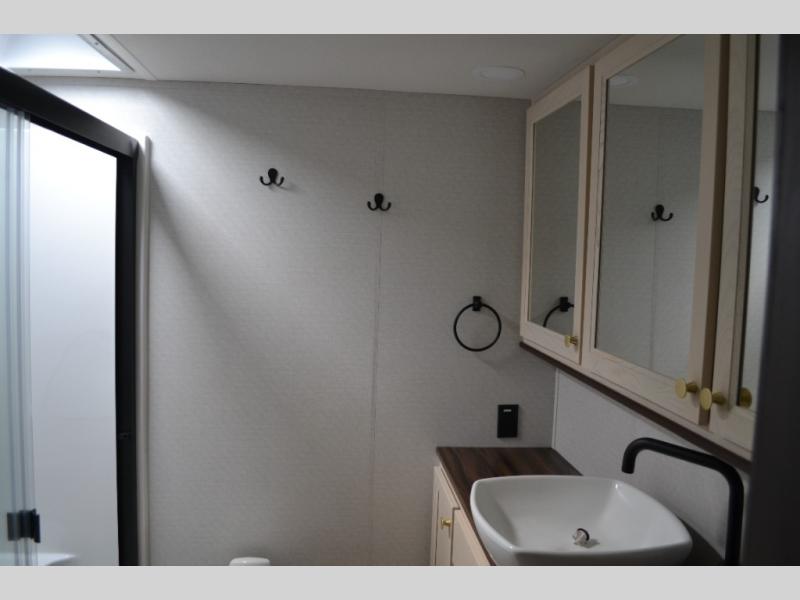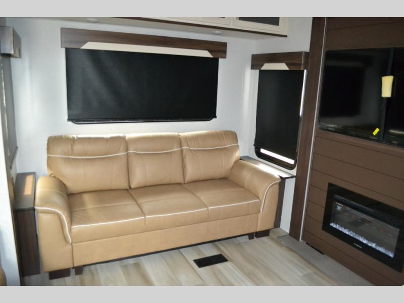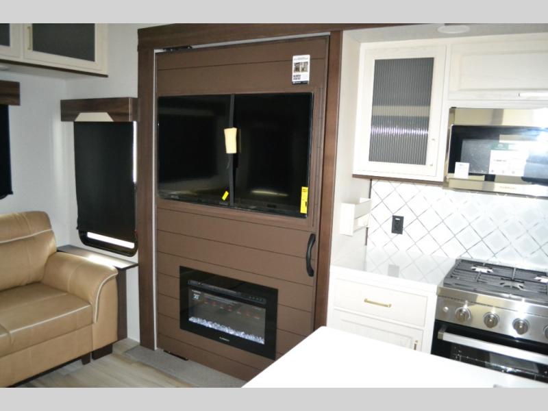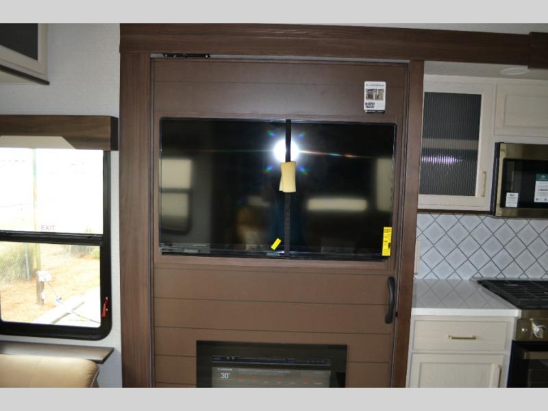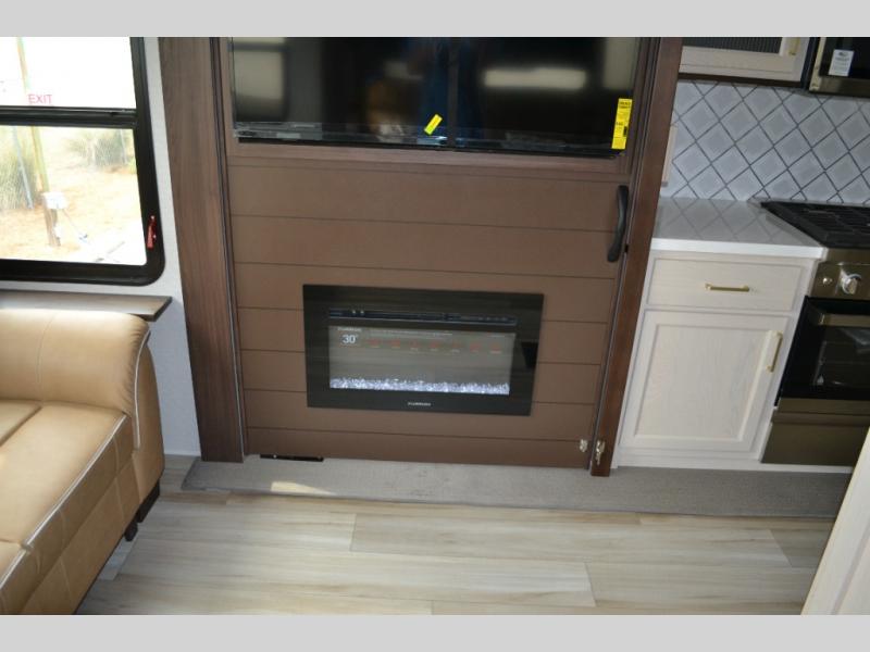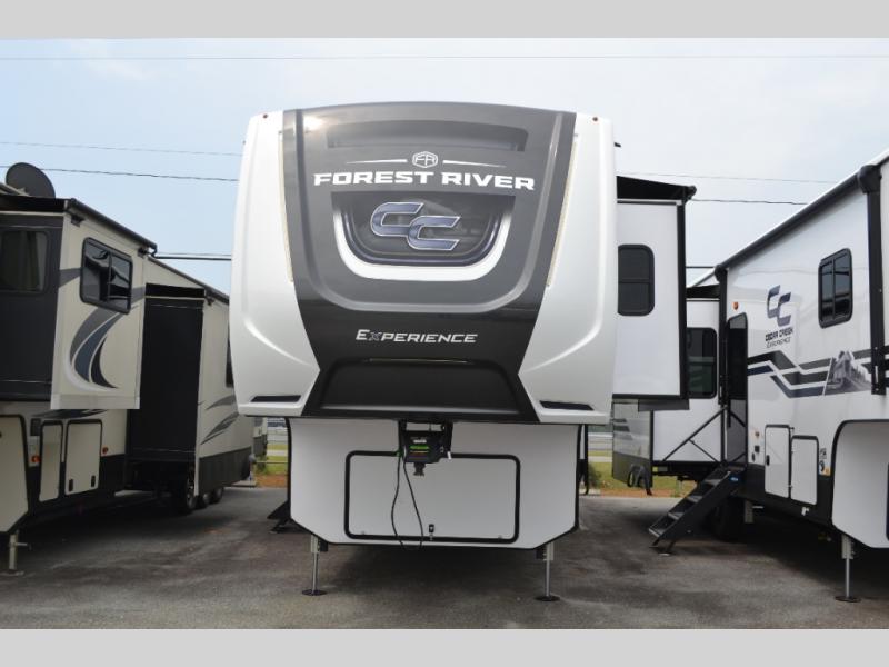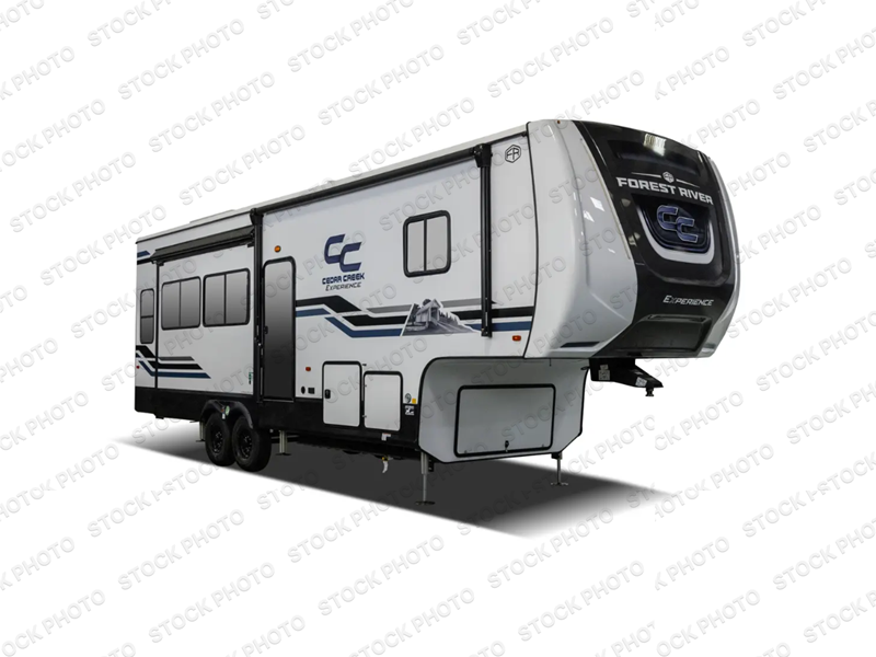 With any Cedar Creek Experience fifth wheel by Forest River, you will bet met with luxury features both inside and out! The True Gelcoat exterior is the best of the best in exteriors and the 3M bonded sidewalls will hold up over years of use. There is also a new 101'' wide-body frame, a Road Warrior suspension, plus a TST tire pressure monitoring system to make towing that much easier. You will find a hidden front storage compartment, along with a 4' x 6' ABS, ribbed, removable underbelly panels, and 6-point hydraulic leveling system, plus many more exterior conveniences. The interior will have you feeling like you haven't left home with vinyl floor coverings, power theater seating with USB ports, a cozy fireplace, vinyl floor covering and the list of comforts goes on! Each model is also pre-wired for satellite to the roof, and you're sure to never go bored with a Smart TV in the bedroom!