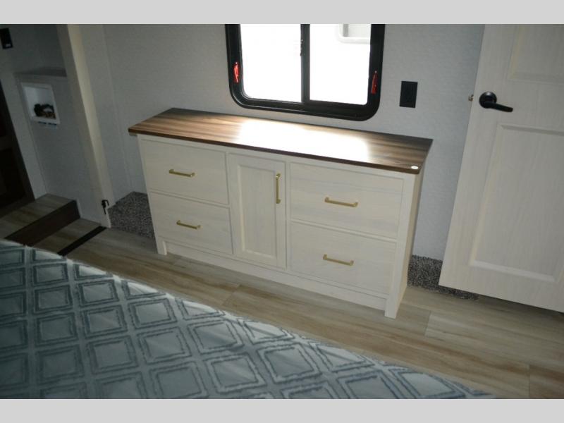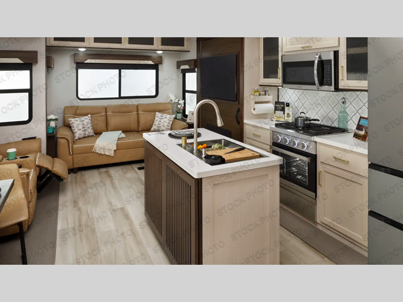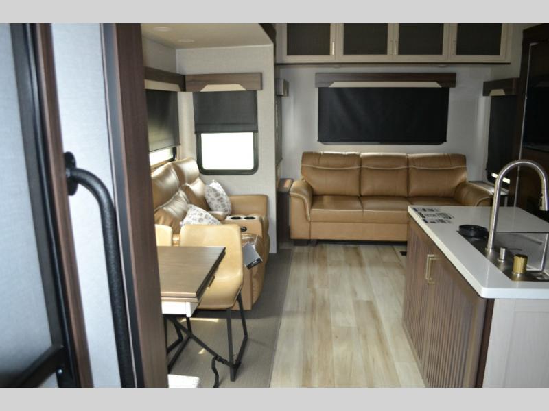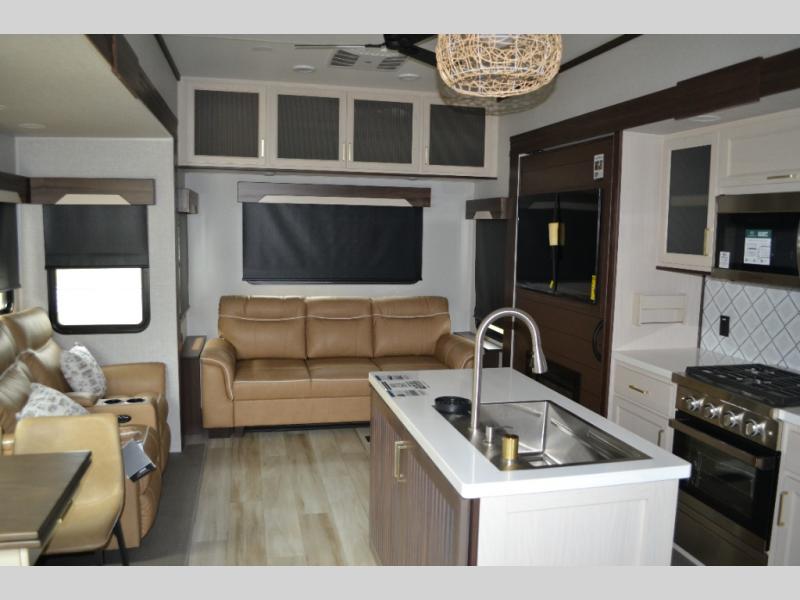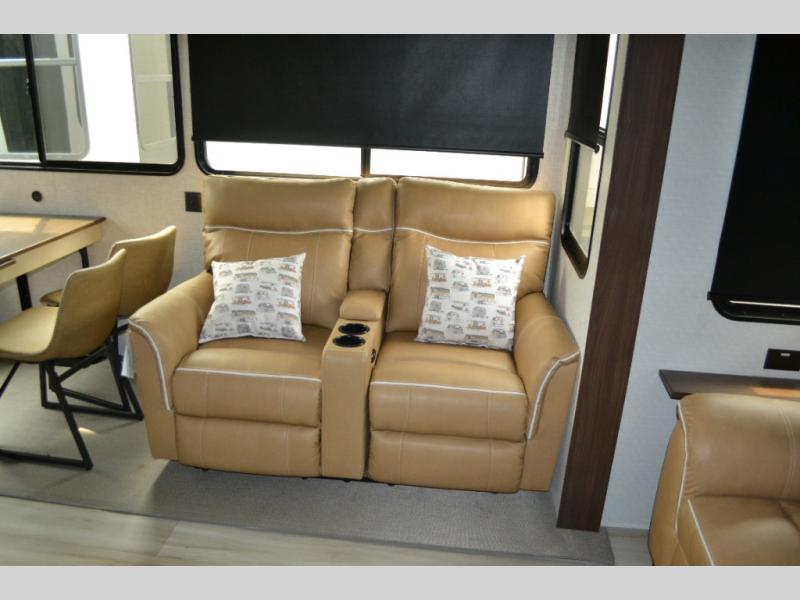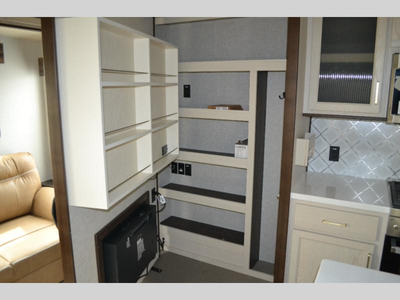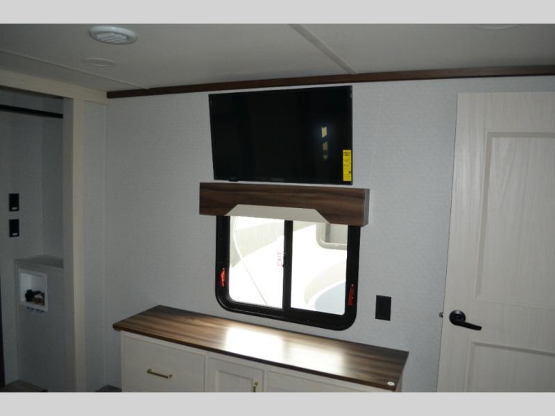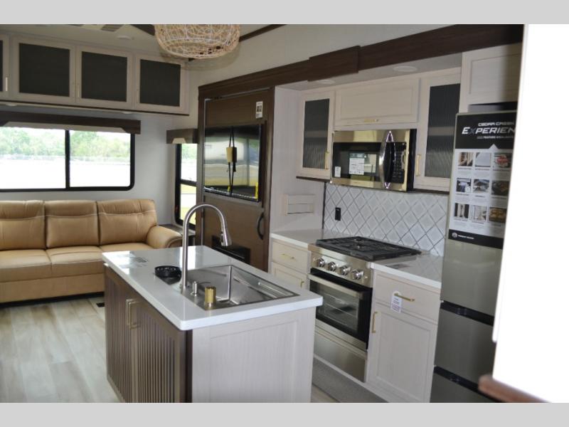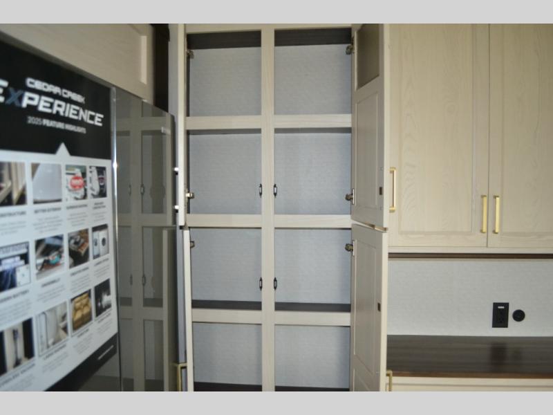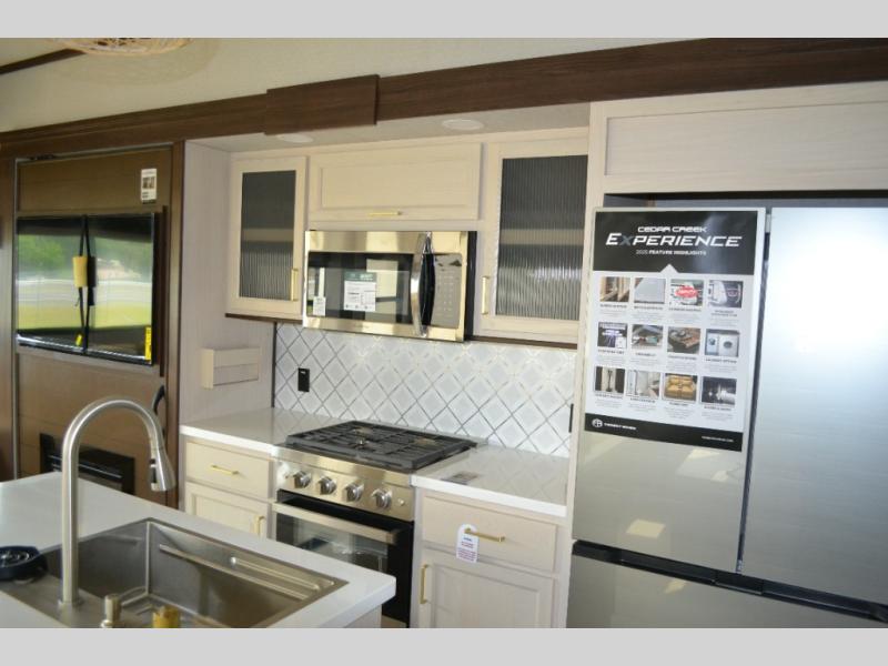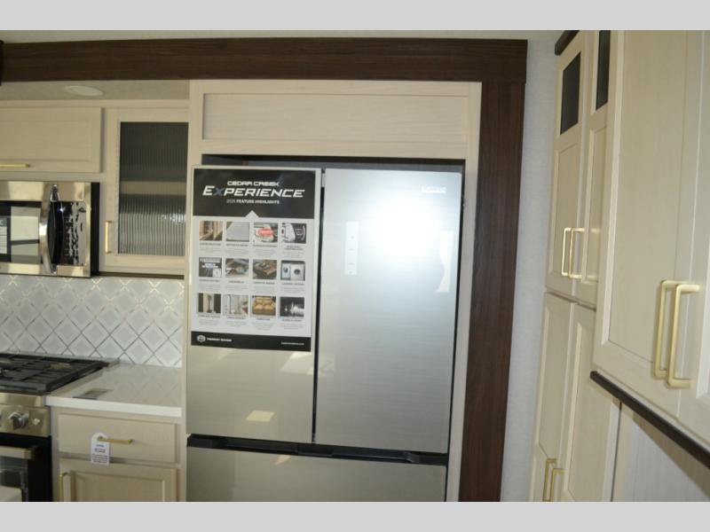 You will love this Cedar Creek Experience fifth wheel! The front bedroom is spacious with a king bed and a spacious front wardrobe, with room for hanging garments, shelves, and washer/dryer prep. There's also a standalone dresser with a TV above so you can watch some shows before bed. The bathroom also offers space efficiency with a sliding glass door, and the roomy shower even has a seat for your convenience while bathing. The rear of this unit feels wide open with a lovely living area and kitchen. The kitchen rivals the one at home, with a three-burner cooktop, microwave, and 18 cu. ft. 12V refrigerator with an ice maker. And check out the Murphy pantry that is hidden behind the entertainment center! You'll have tons of storage space with overhead cabinets and a pantry. The kitchen island with a spacious sink is the perfect final touch. After you eat you can relax and watch TV on the power theater seats or the hide-a-bed sofa. There is also a wall mounted dining table and extension with an ottoman for more seating space!