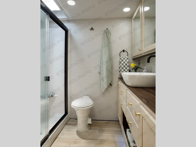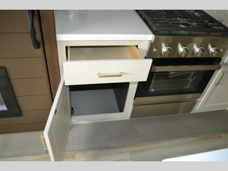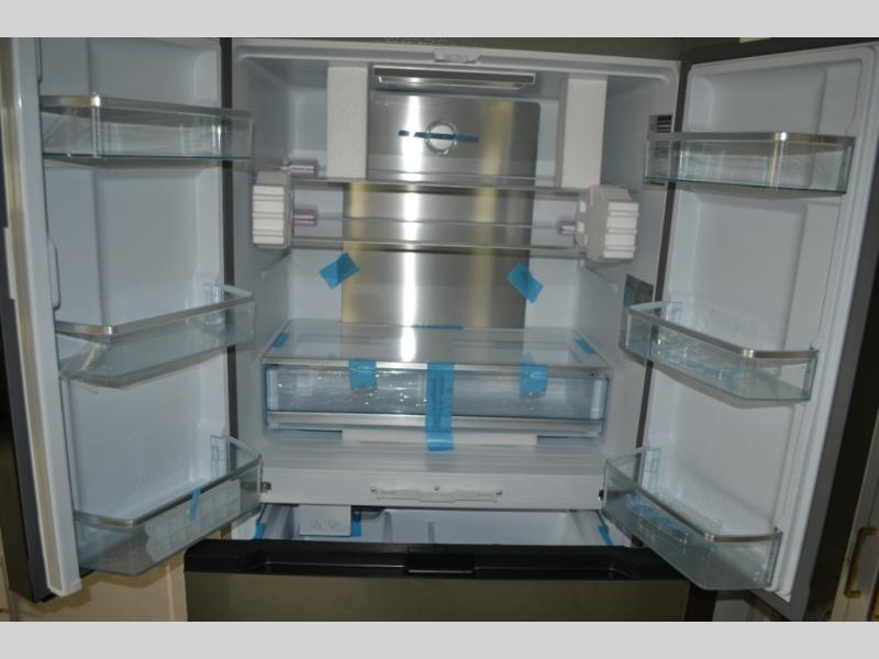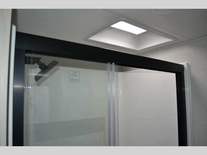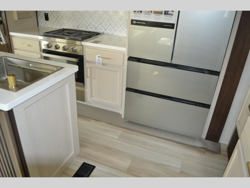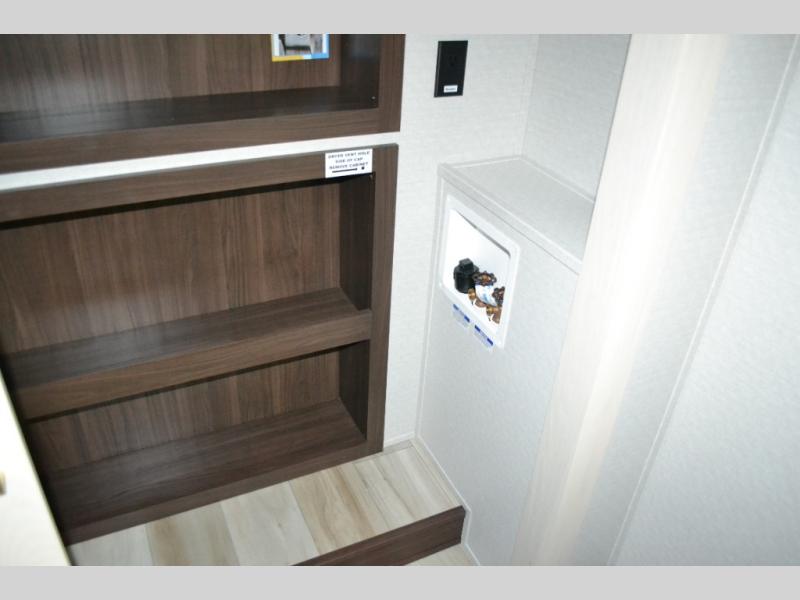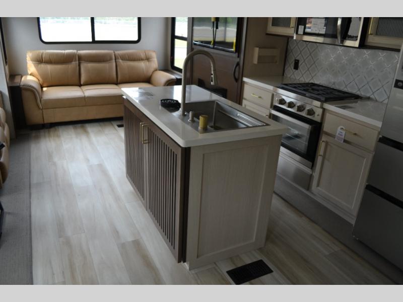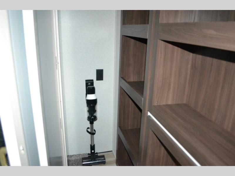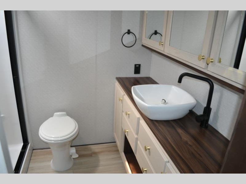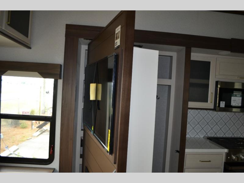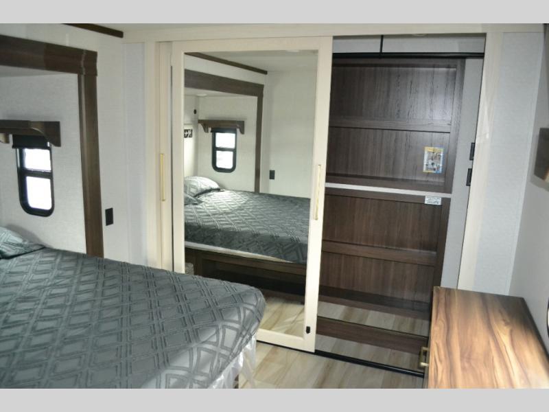 You will love this Cedar Creek Experience fifth wheel! The front bedroom is spacious with a king bed and a spacious front wardrobe, with room for hanging garments, shelves, and washer/dryer prep. There's also a standalone dresser with a TV above so you can watch some shows before bed. The bathroom also offers space efficiency with a sliding glass door, and the roomy shower even has a seat for your convenience while bathing. The rear of this unit feels wide open with a lovely living area and kitchen. The kitchen rivals the one at home, with a three-burner cooktop, microwave, and 18 cu. ft. 12V refrigerator with an ice maker. And check out the Murphy pantry that is hidden behind the entertainment center! You'll have tons of storage space with overhead cabinets and a pantry. The kitchen island with a spacious sink is the perfect final touch. After you eat you can relax and watch TV on the power theater seats or the hide-a-bed sofa. There is also a wall mounted dining table and extension with an ottoman for more seating space!
