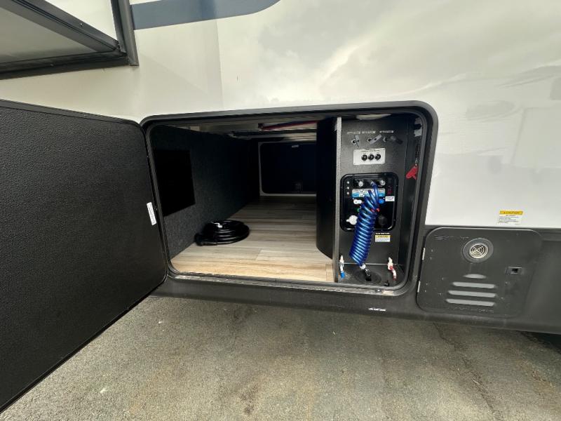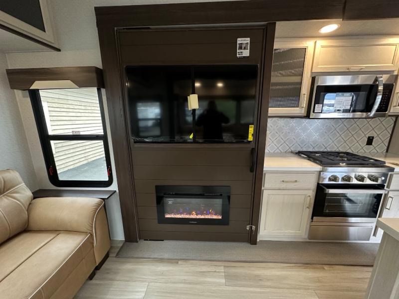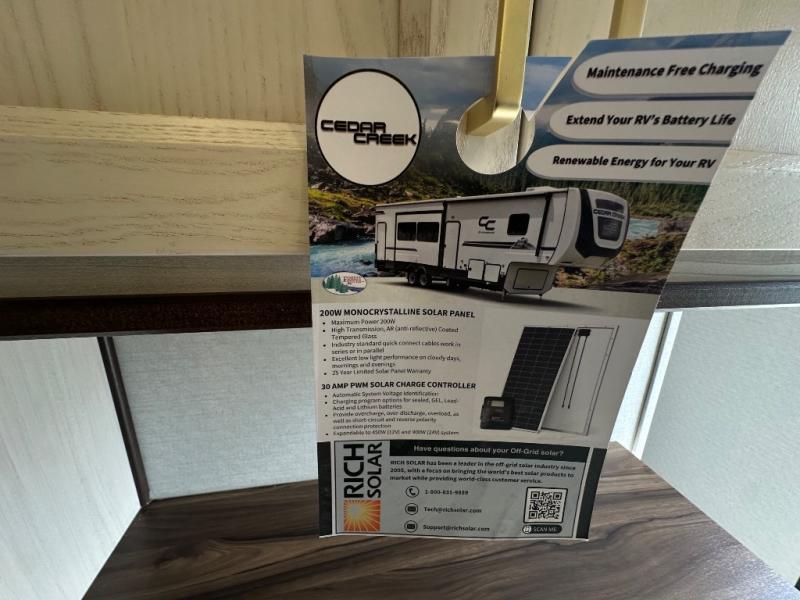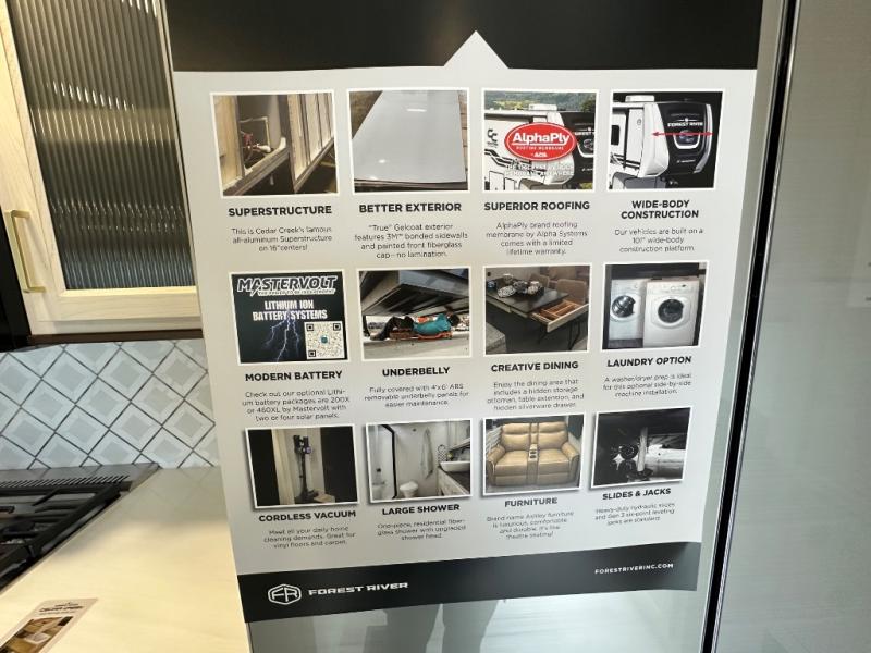 With any Cedar Creek Experience fifth wheel by Forest River, you will bet met with luxury features both inside and out! The True Gelcoat exterior is the best of the best in exteriors and the 3M bonded sidewalls will hold up over years of use. There is also a new 101'' wide-body frame, a Road Warrior suspension, plus a TST tire pressure monitoring system to make towing that much easier. You will find a hidden front storage compartment, along with a 4' x 6' ABS, ribbed, removable underbelly panels, and 6-point hydraulic leveling system, plus many more exterior conveniences. The interior will have you feeling like you haven't left home with vinyl floor coverings, power theater seating with USB ports, a cozy fireplace, vinyl floor covering and the list of comforts goes on! Each model is also pre-wired for satellite to the roof, and you're sure to never go bored with a Smart TV in the bedroom!