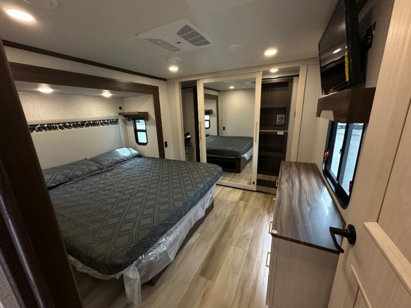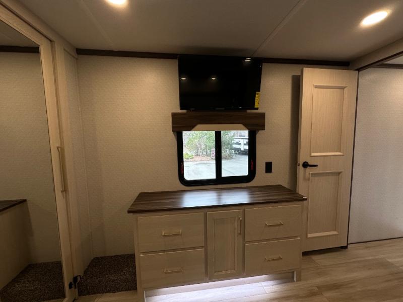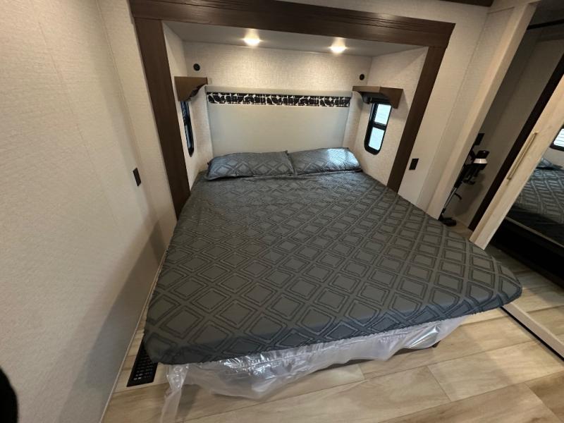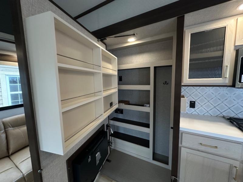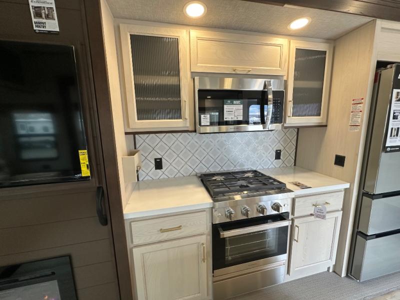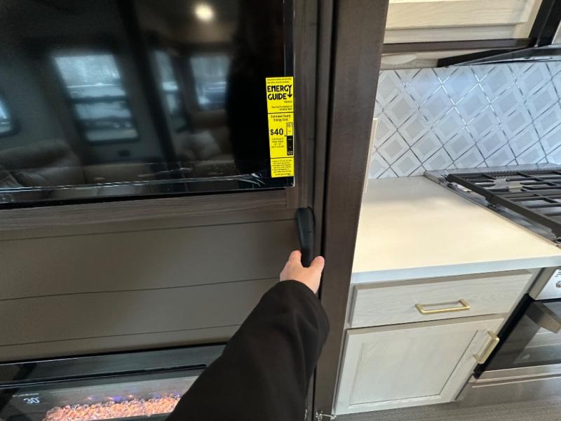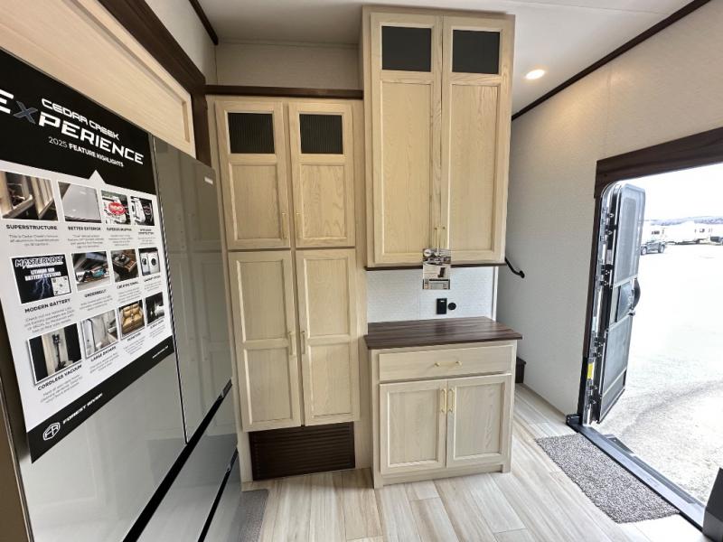 You will love this Cedar Creek Experience fifth wheel! The front bedroom is spacious with a king bed and a spacious front wardrobe, with room for hanging garments, shelves, and washer/dryer prep. There's also a standalone dresser with a TV above so you can watch some shows before bed. The bathroom also offers space efficiency with a sliding glass door, and the roomy shower even has a seat for your convenience while bathing. The rear of this unit feels wide open with a lovely living area and kitchen. The kitchen rivals the one at home, with a three-burner cooktop, microwave, and 18 cu. ft. 12V refrigerator with an ice maker. And check out the Murphy pantry that is hidden behind the entertainment center! You'll have tons of storage space with overhead cabinets and a pantry. The kitchen island with a spacious sink is the perfect final touch. After you eat you can relax and watch TV on the power theater seats or the hide-a-bed sofa. There is also a wall mounted dining table and extension with an ottoman for more seating space!