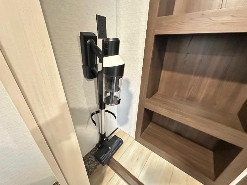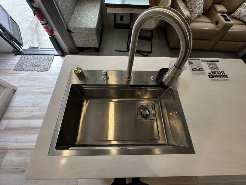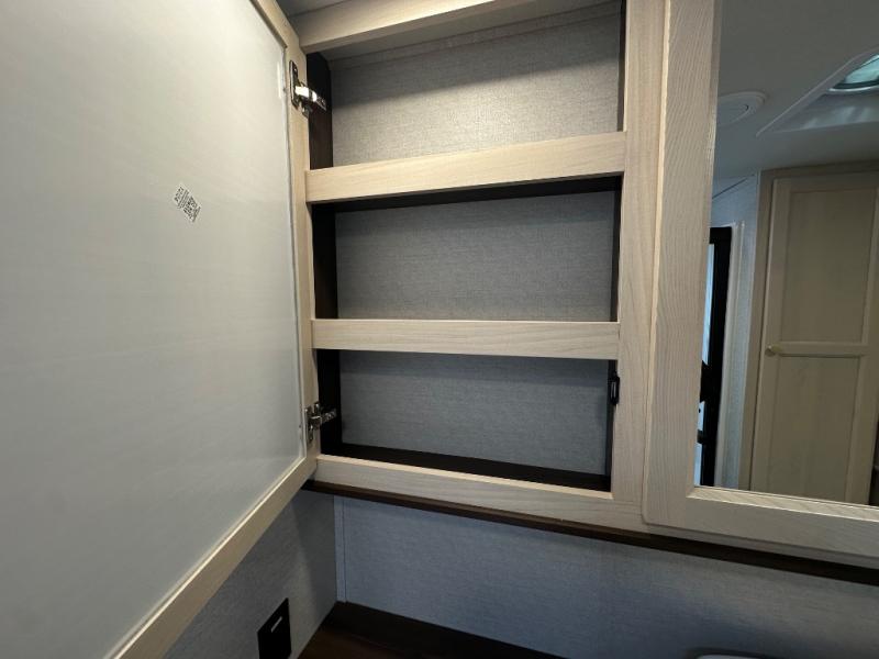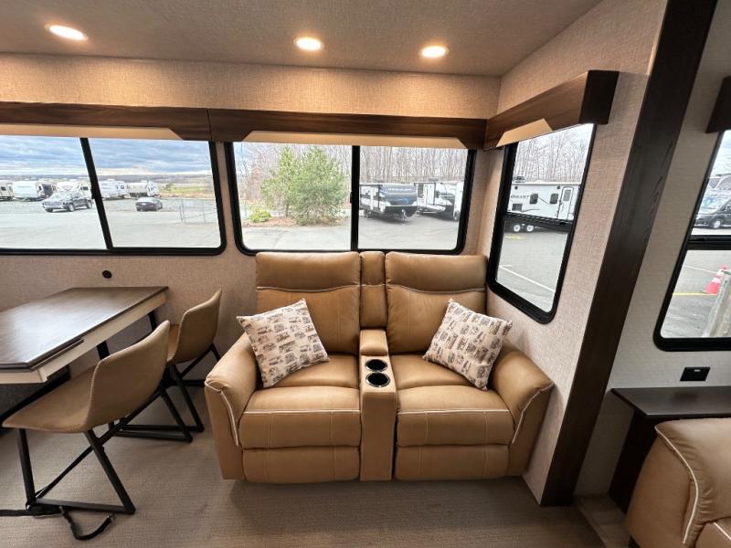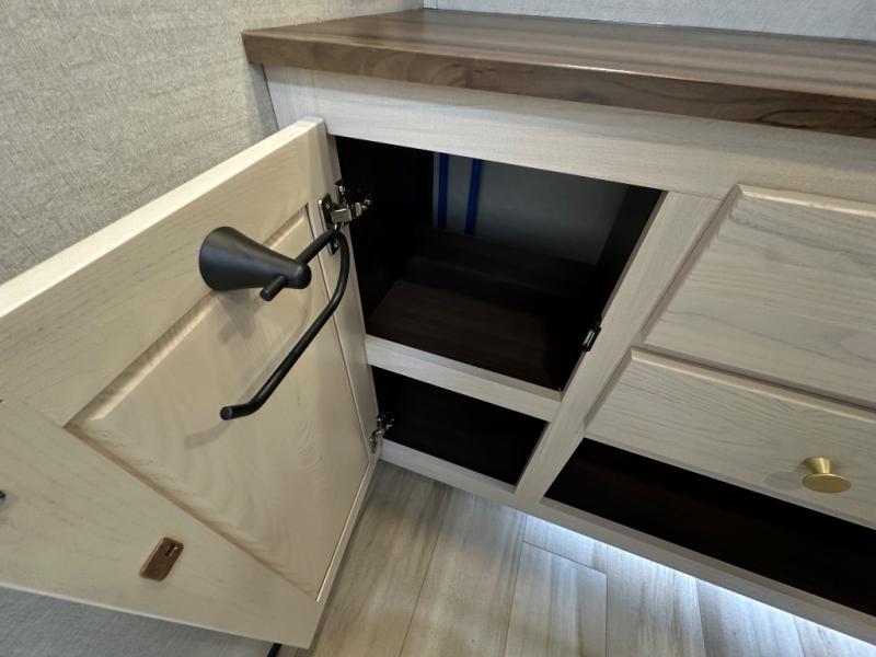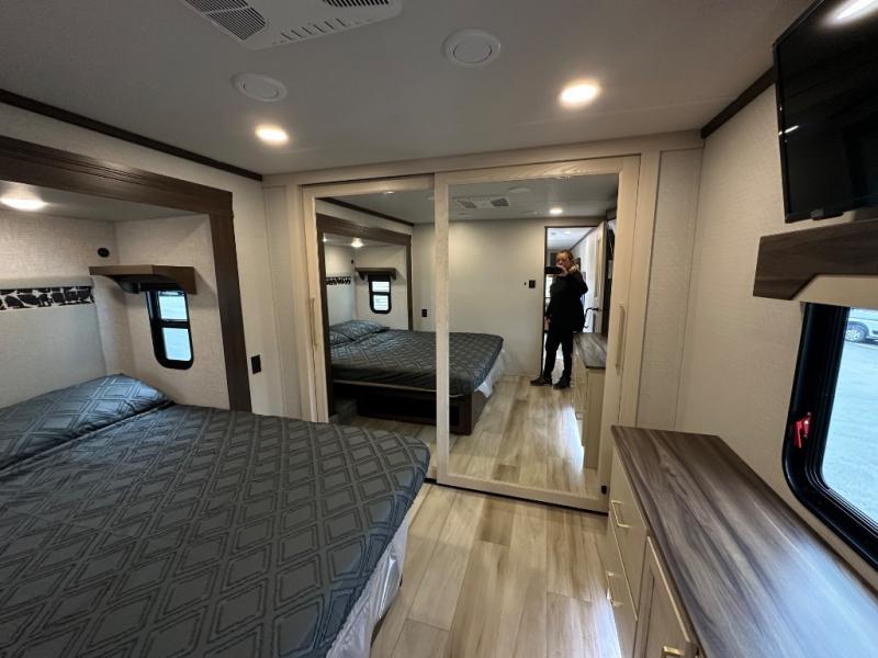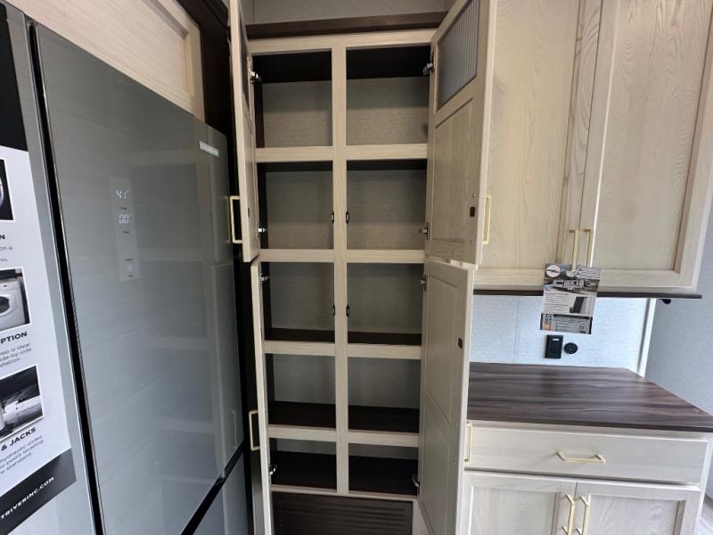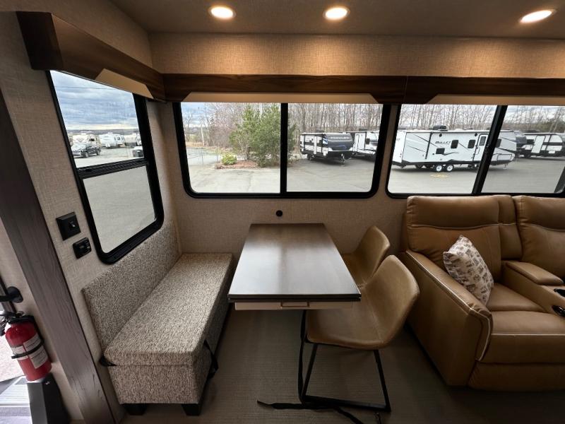 You will love this Cedar Creek Experience fifth wheel! The front bedroom is spacious with a king bed and a spacious front wardrobe, with room for hanging garments, shelves, and washer/dryer prep. There's also a standalone dresser with a TV above so you can watch some shows before bed. The bathroom also offers space efficiency with a sliding glass door, and the roomy shower even has a seat for your convenience while bathing. The rear of this unit feels wide open with a lovely living area and kitchen. The kitchen rivals the one at home, with a three-burner cooktop, microwave, and 18 cu. ft. 12V refrigerator with an ice maker. And check out the Murphy pantry that is hidden behind the entertainment center! You'll have tons of storage space with overhead cabinets and a pantry. The kitchen island with a spacious sink is the perfect final touch. After you eat you can relax and watch TV on the power theater seats or the hide-a-bed sofa. There is also a wall mounted dining table and extension with an ottoman for more seating space!