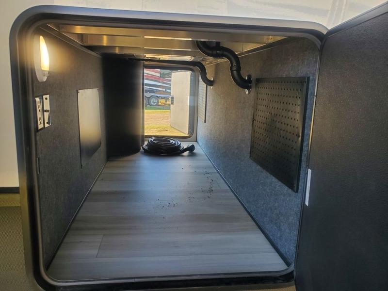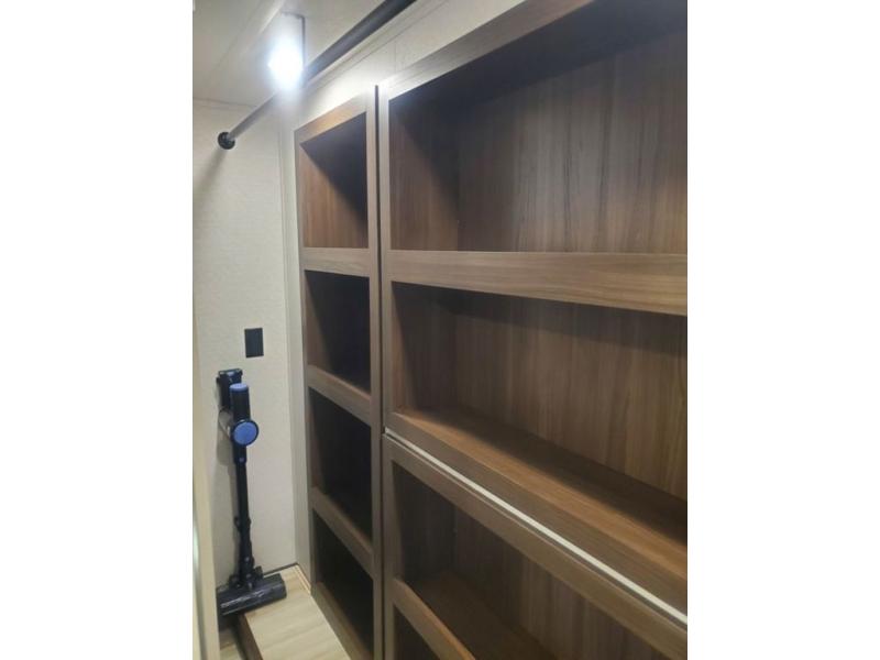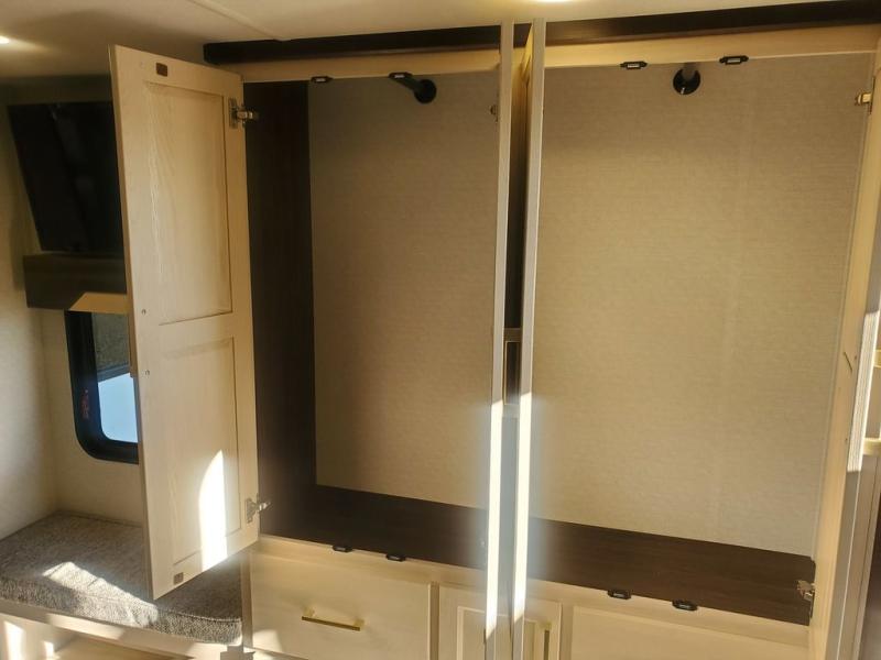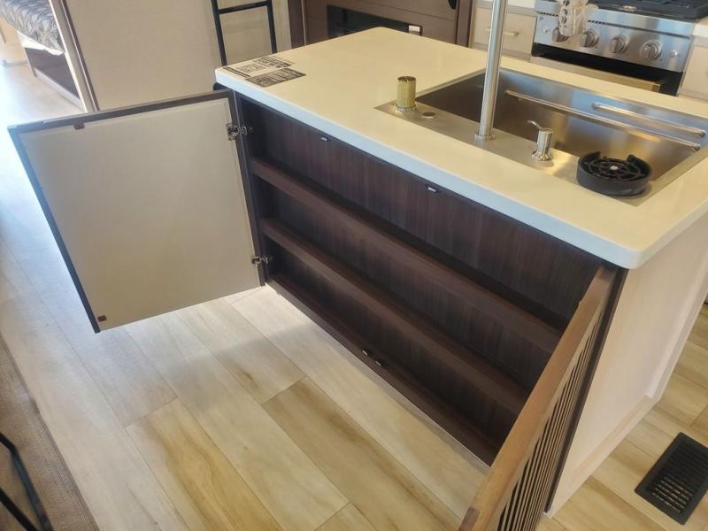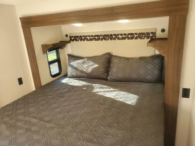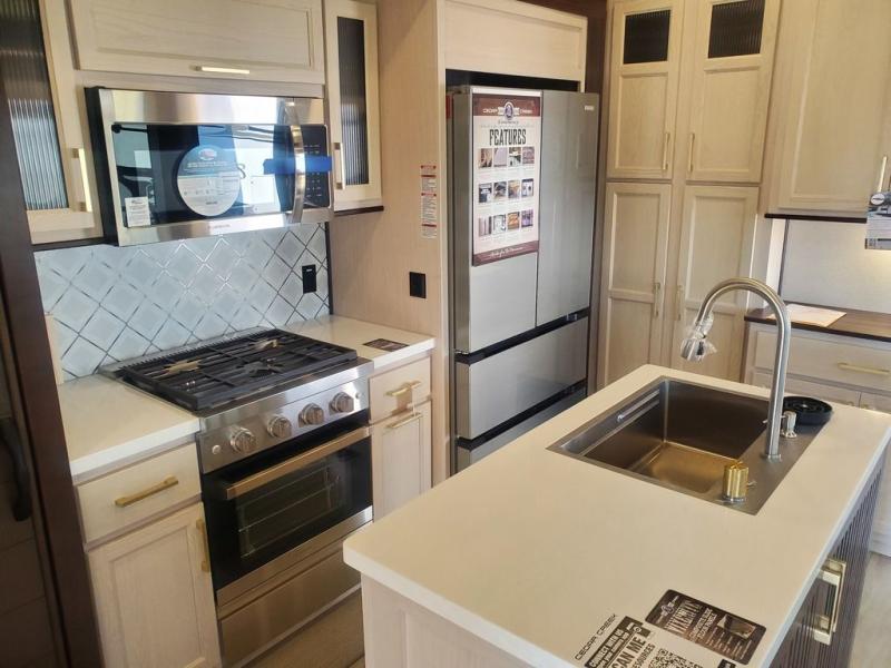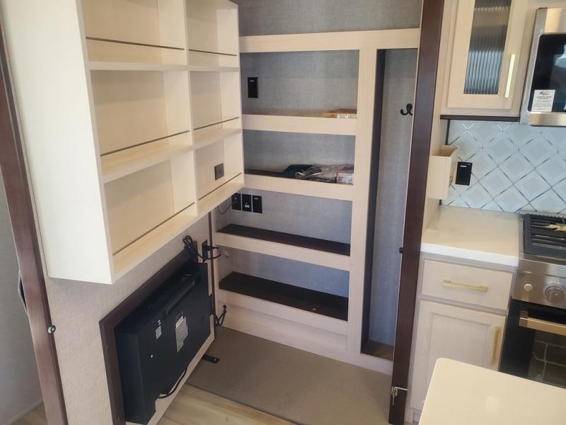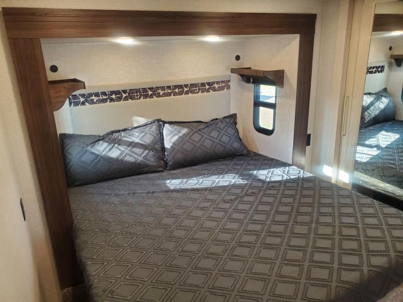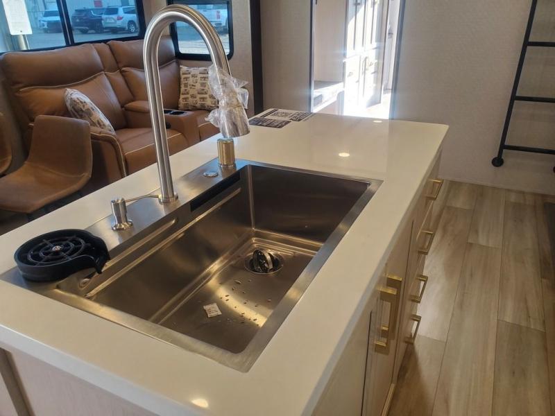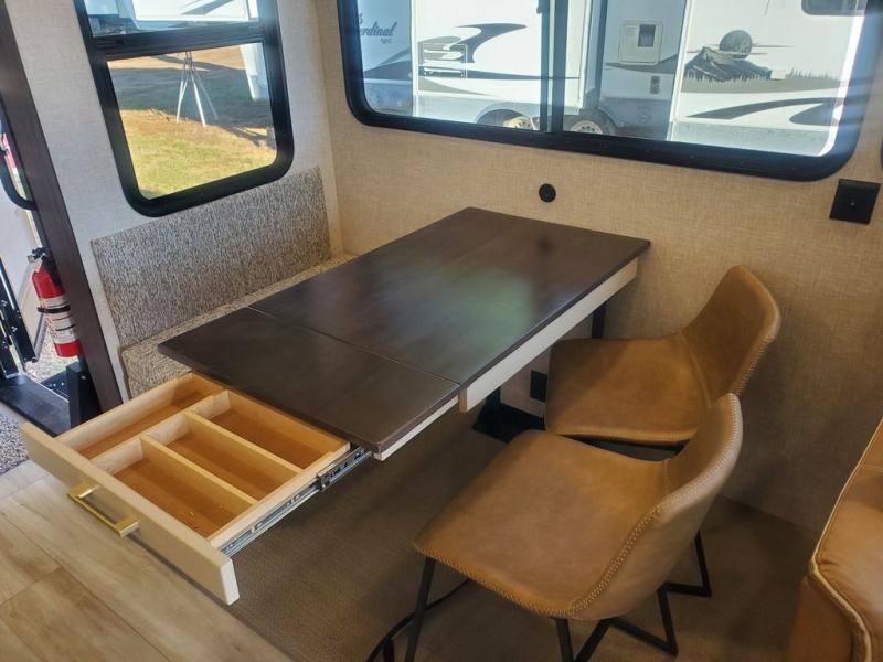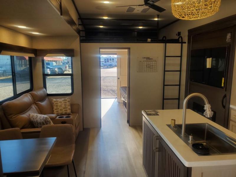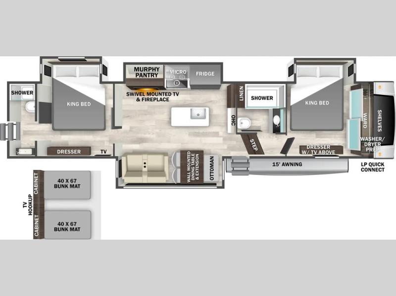 This is the perfect fifth wheel to camp with family or neighbor friends since there are two bedrooms, one of which is a master bedroom with a full rear bath. The second full bath is up front, and both bedrooms include a king bed slide out for added comfort. There is even a loft above the rear bedroom, complete with two bunk mats, two cabinets, and a TV hookup. Everyone can meet in the combined kitchen and living room to enjoy the swivel mounted TV and fireplace across from the theater seating. There is also a wall-mounted dining table with an extension and ottoman.