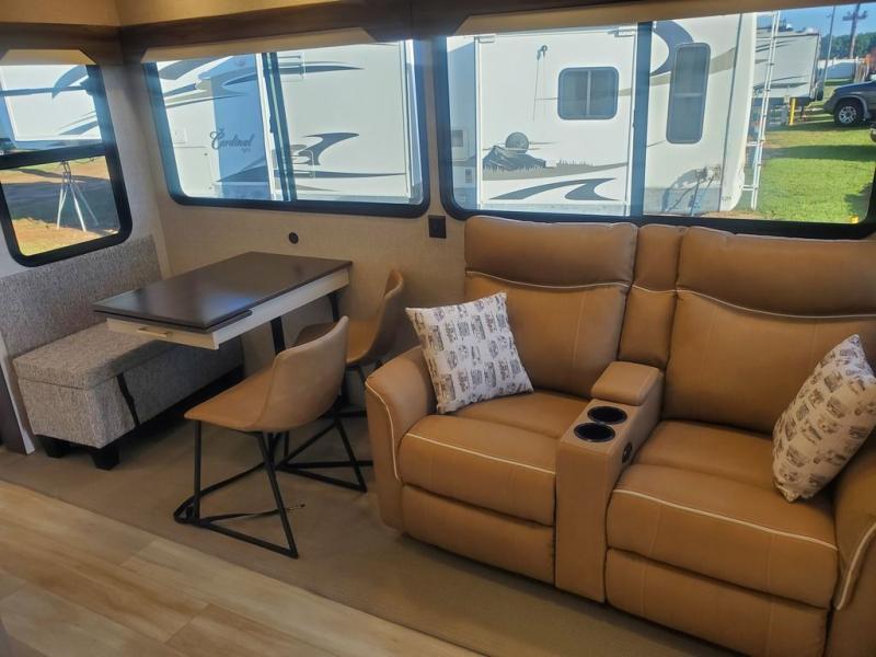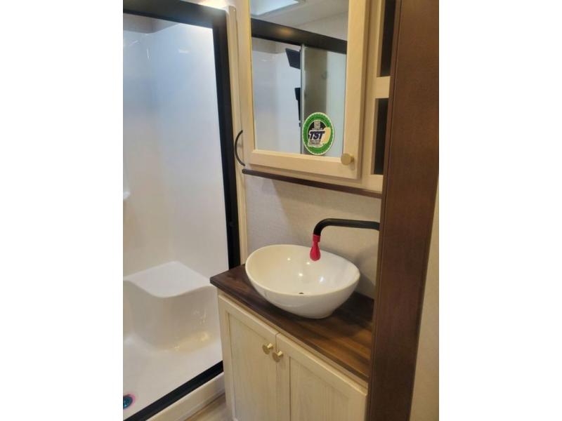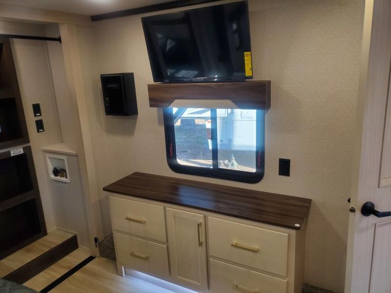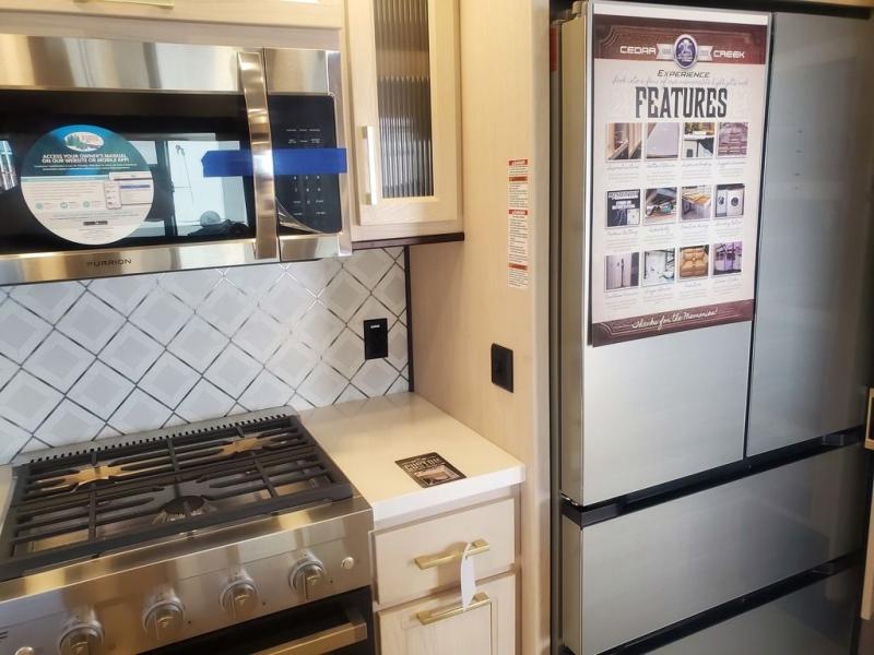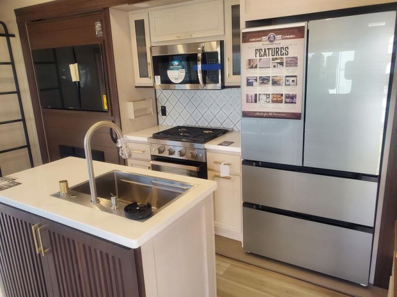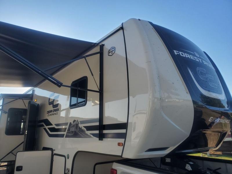 With any Cedar Creek Experience fifth wheel by Forest River, you will bet met with luxury features both inside and out! The True Gelcoat exterior is the best of the best in exteriors and the 3M bonded sidewalls will hold up over years of use. There is also a new 101'' wide-body frame, a Road Warrior suspension, plus a TST tire pressure monitoring system to make towing that much easier. You will find a hidden front storage compartment, along with a 4' x 6' ABS, ribbed, removable underbelly panels, and 6-point hydraulic leveling system, plus many more exterior conveniences. The interior will have you feeling like you haven't left home with vinyl floor coverings, power theater seating with USB ports, a cozy fireplace, vinyl floor covering and the list of comforts goes on! Each model is also pre-wired for satellite to the roof, and you're sure to never go bored with a Smart TV in the bedroom!