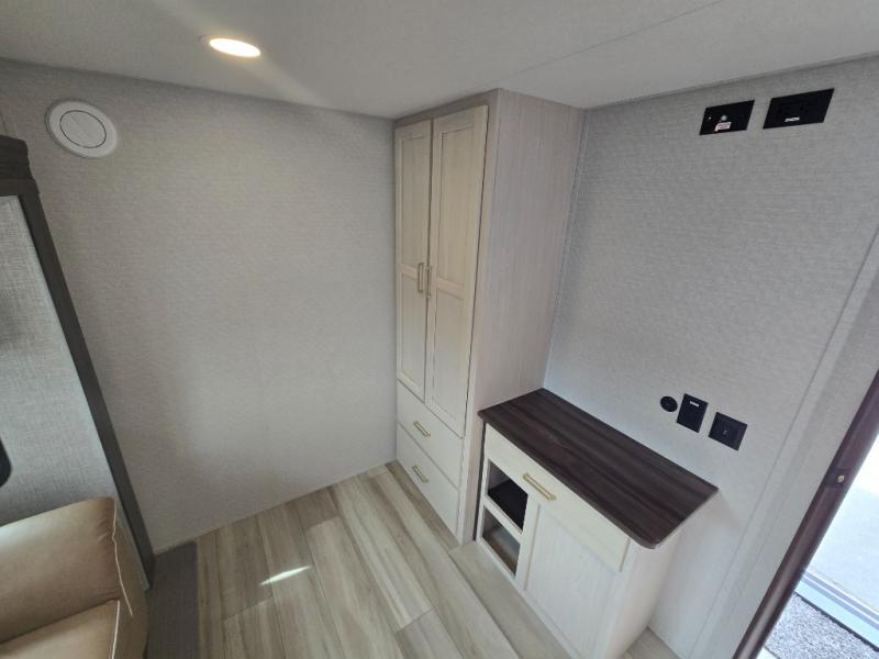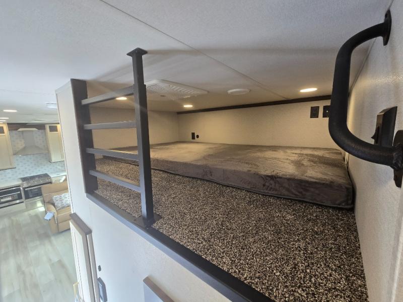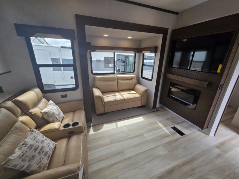A front kitchen with ample counter space, a middle den, and a front bedroom make this fifth wheel one to remember! The living area will be a favorite spot to visit together since there is a hide-a-bed sofa and theater seating, plus an entertainment center with a fireplace. There is also a free-standing dining table and a desk with a chair if you need to telecommute. Your guests will love the middle den with a hide-a-bed sofa and a closet for their things, plus there is a loft above this room for added sleeping or storage space. A spacious full bath includes a shower with a seat, and the king bed slide out in the front private bedroom is sure to bring a great night's rest.