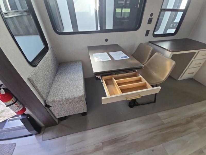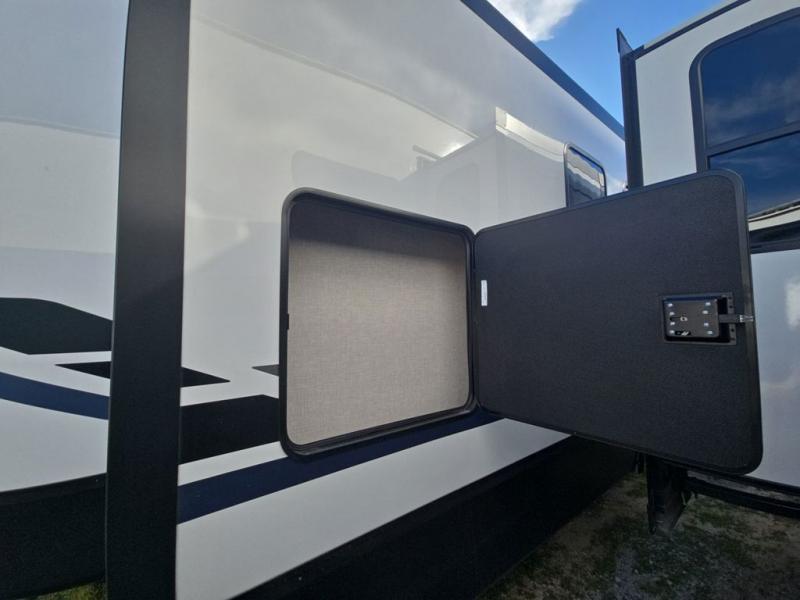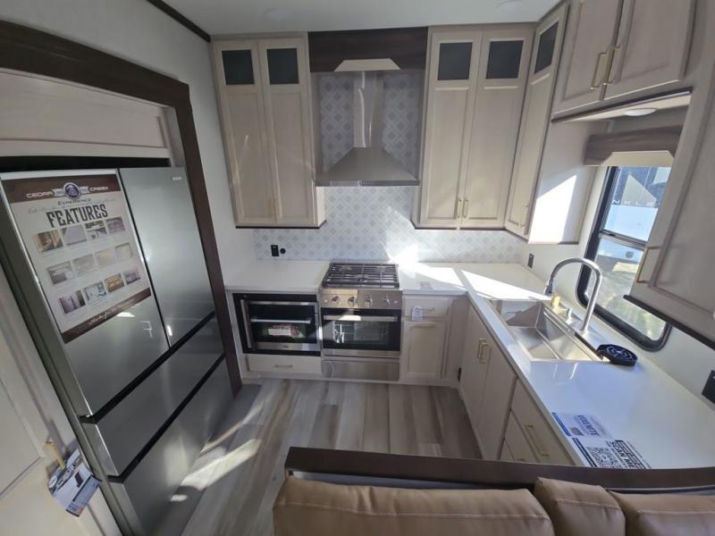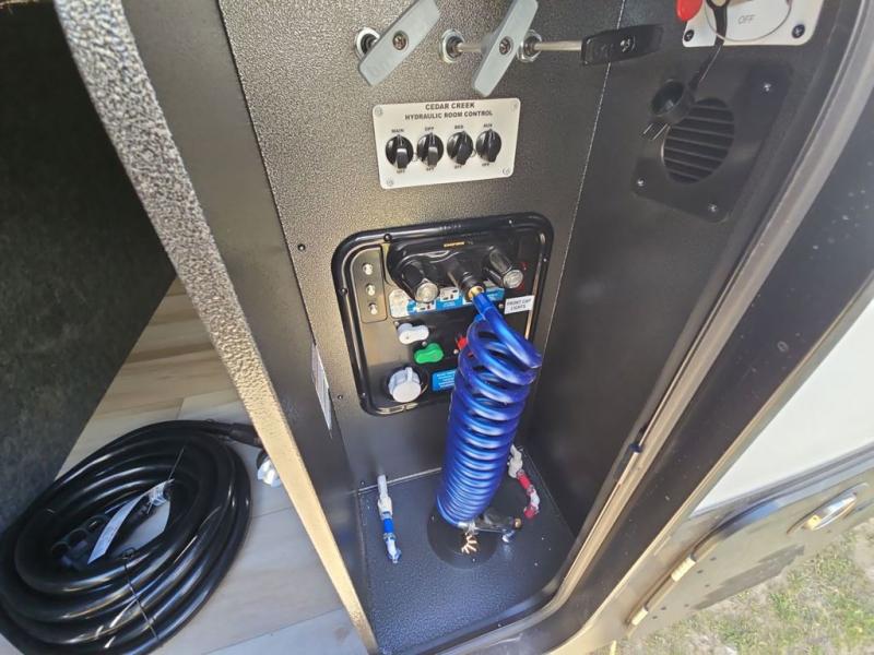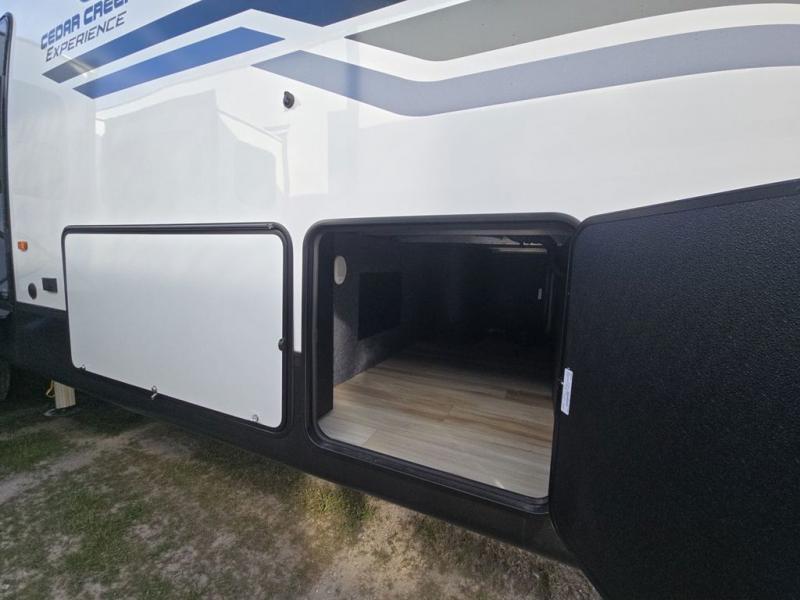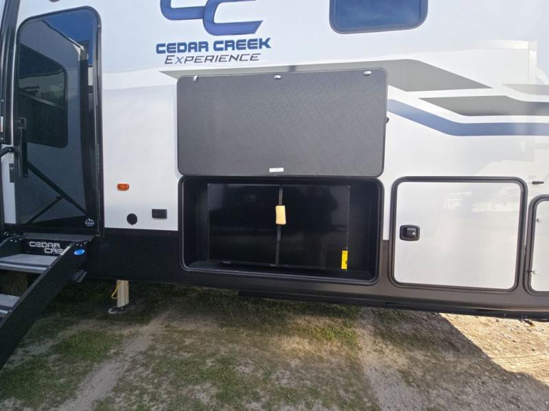 With any Cedar Creek Experience fifth wheel by Forest River, you will bet met with luxury features both inside and out! The True Gelcoat exterior is the best of the best in exteriors and the 3M bonded sidewalls will hold up over years of use. There is also a new 8' 5" wide-body frame, a Road Warrior suspension, plus a TST tire pressure monitoring system to make towing that much easier. You will find a "Rich Solar" 200 watt solar panel outside, along with a heated front storage compartment, a Nautilus P4 multi-function panel with an outside shower, black tank flush, and 12V battery disconnect, plus many more exterior conveniences. The interior will have you feeling like you haven't left home with vinyl floor coverings, power theater seating with USB ports, a cozy fireplace, luxurious bedding decor, and the list of comforts goes on! Each model is also pre-wired for satellite to the roof, and you're sure to never go bored with a Smart TV in the living room and bedroom!