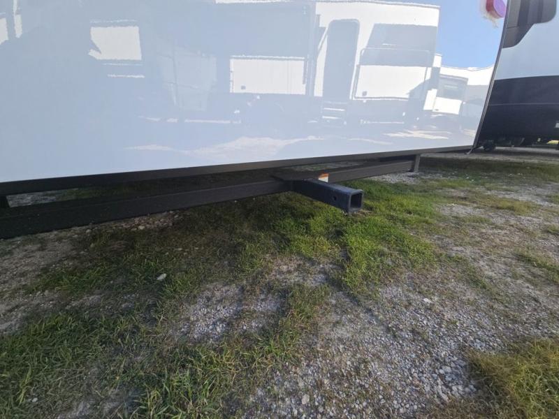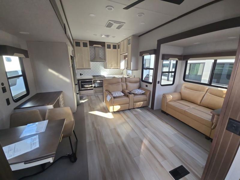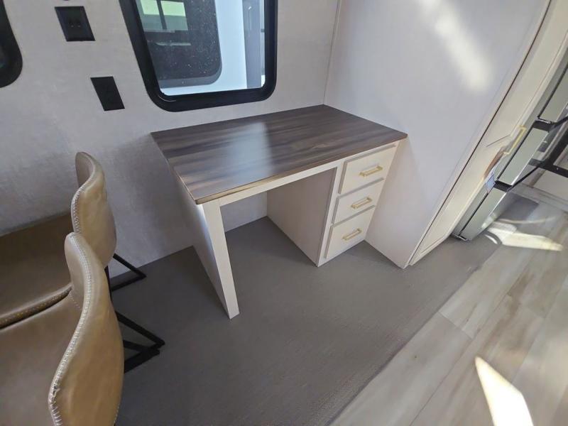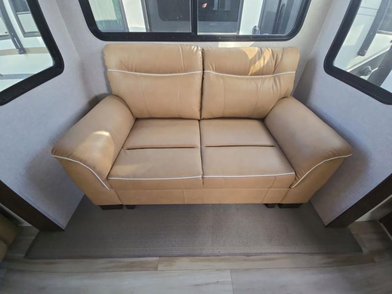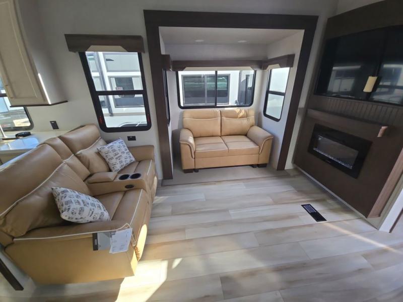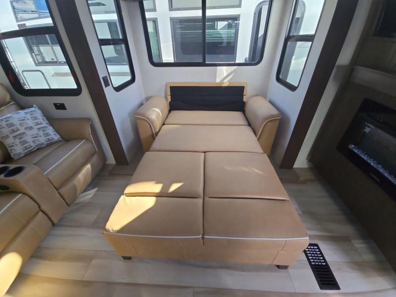 A front kitchen with ample counter space, a middle den, and a front bedroom make this fifth wheel one to remember! The living area will be a favorite spot to visit together since there is a hide-a-bed sofa and theater seating, plus an entertainment center with a fireplace. There is also a free-standing dining table and a desk with a chair if you need to telecommute. Your guests will love the middle den with a hide-a-bed sofa and a closet for their things, plus there is a loft above this room for added sleeping or storage space. A spacious full bath includes a shower with a seat, and the king bed slide out in the front private bedroom is sure to bring a great night's rest.