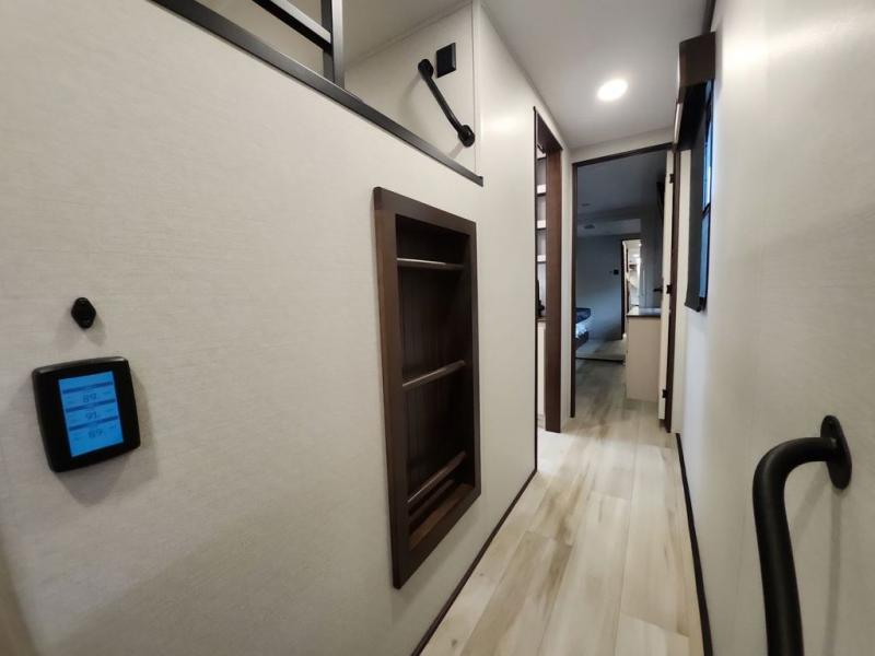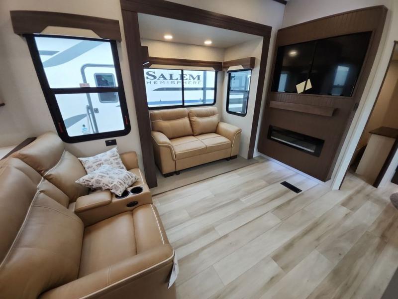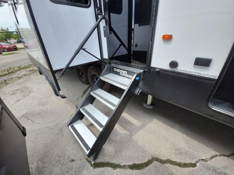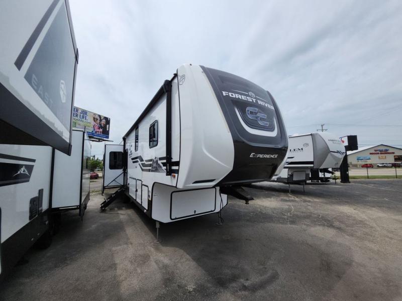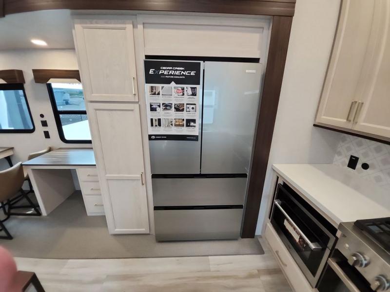 With any Cedar Creek Experience fifth wheel by Forest River, you will bet met with luxury features both inside and out! The True Gelcoat exterior is the best of the best in exteriors and the 3M bonded sidewalls will hold up over years of use. There is also a new 101'' wide-body frame, a Road Warrior suspension, plus a TST tire pressure monitoring system to make towing that much easier. You will find a hidden front storage compartment, along with a 4' x 6' ABS, ribbed, removable underbelly panels, and 6-point hydraulic leveling system, plus many more exterior conveniences. The interior will have you feeling like you haven't left home with vinyl floor coverings, power theater seating with USB ports, a cozy fireplace, vinyl floor covering and the list of comforts goes on! Each model is also pre-wired for satellite to the roof, and you're sure to never go bored with a Smart TV in the bedroom!