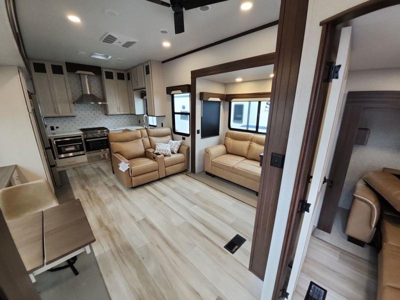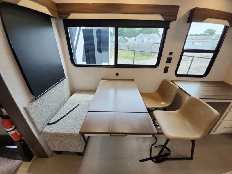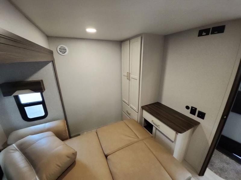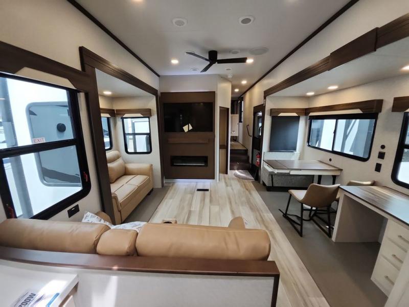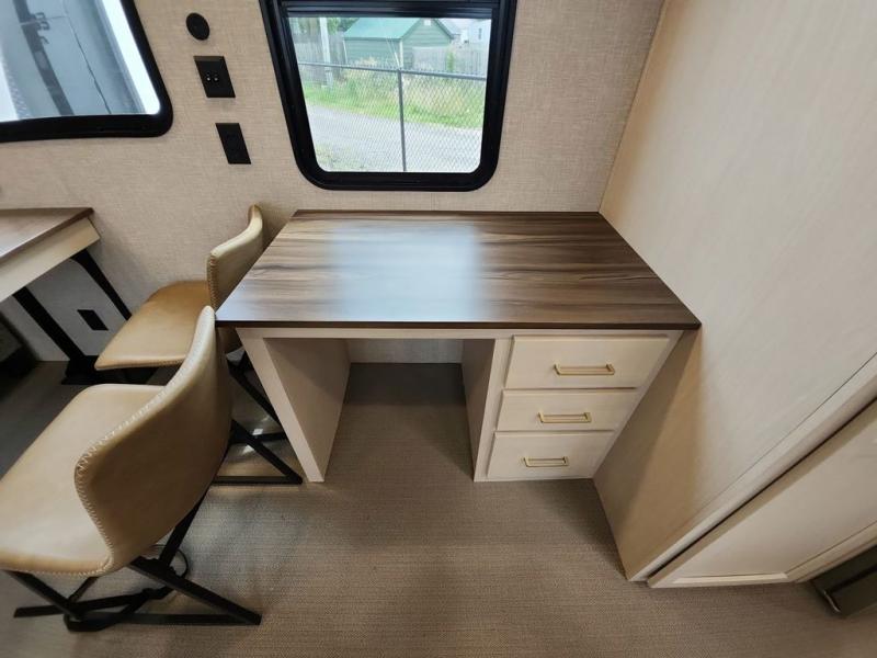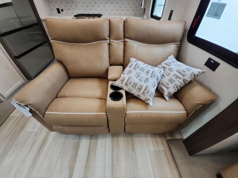 A front kitchen with ample counter space, a middle den, and a front bedroom make this fifth wheel one to remember! The living area will be a favorite spot to visit together since there is a hide-a-bed sofa and theater seating, plus an entertainment center with a fireplace. There is also a free-standing dining table and a desk with a chair if you need to telecommute. Your guests will love the middle den with a hide-a-bed sofa and a closet for their things, plus there is a loft above this room for added sleeping or storage space. A spacious full bath includes a shower with a seat, and the king bed slide out in the front private bedroom is sure to bring a great night's rest.