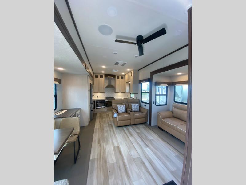 A front kitchen with ample counter space, a middle den, and a front bedroom make this fifth wheel one to remember! The living area will be a favorite spot to visit together since there is a hide-a-bed sofa and theater seating, plus an entertainment center with a fireplace. There is also a free-standing dining table and a desk with a chair if you need to telecommute. Your guests will love the middle den with a hide-a-bed sofa and a closet for their things, plus there is a loft above this room for added sleeping or storage space. A spacious full bath includes a shower with a seat, and the king bed slide out in the front private bedroom is sure to bring a great night's rest.