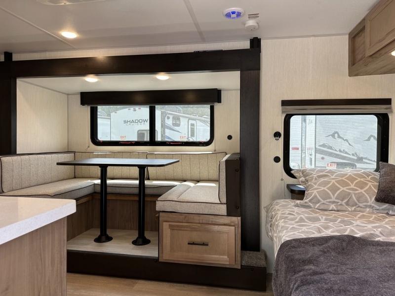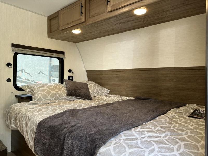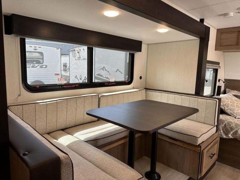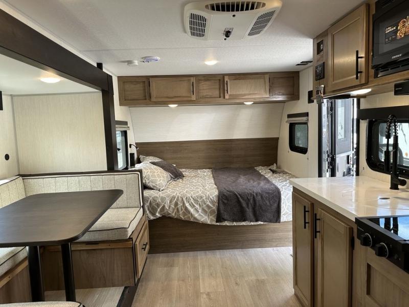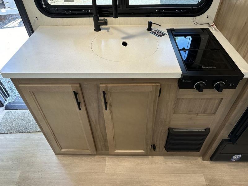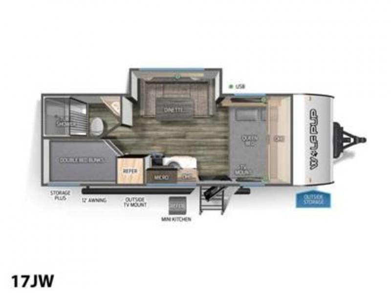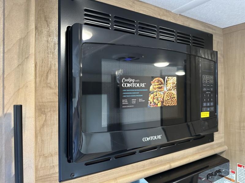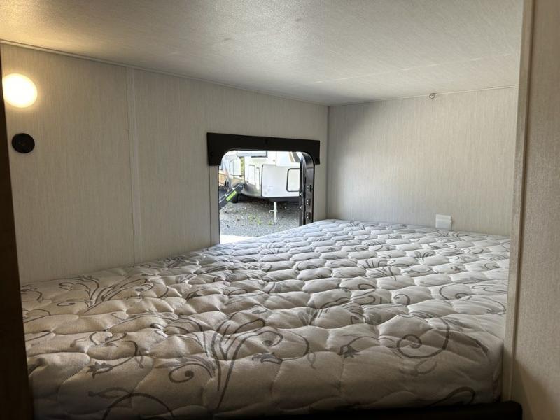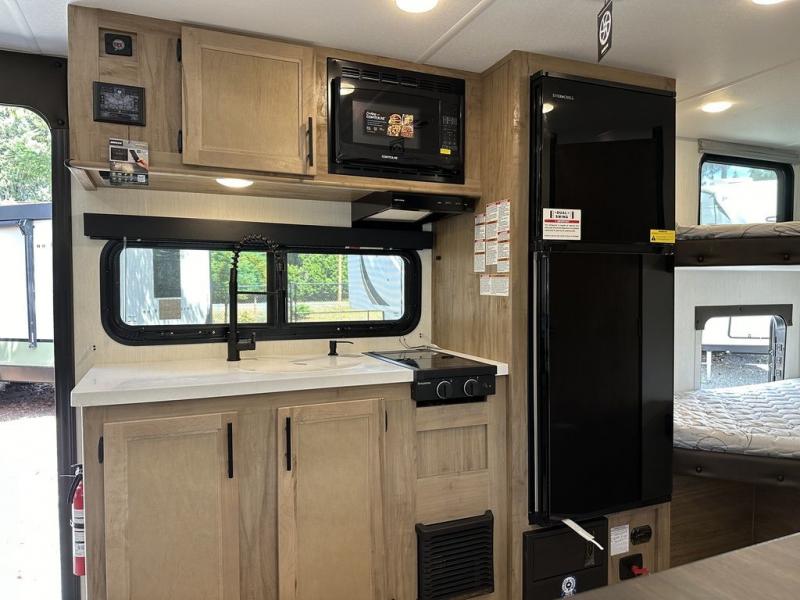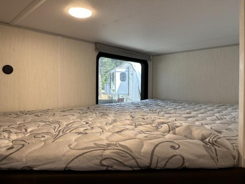 This family travel trailer is ready to head to the campground whenever you are! The kiddos can sleep on the set of double-size bed bunks and you can sleep on the front queen bed, plus the U-shaped dinette slide can also transform into an extra sleeping space when you aren't using it to enjoy a meal. You can prepare your delicious meals on the flushmount range or at the outside mini kitchen and stay protected by the power awning. The exterior not only has outside storage and an outside TV mount, but also features an outside storage plus door for access to the storage space underneath the bottom bunk bed. The rear corner bath allows everyone to stay clean and refreshed while you camp.
