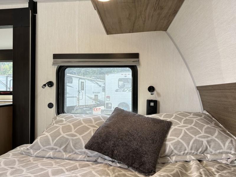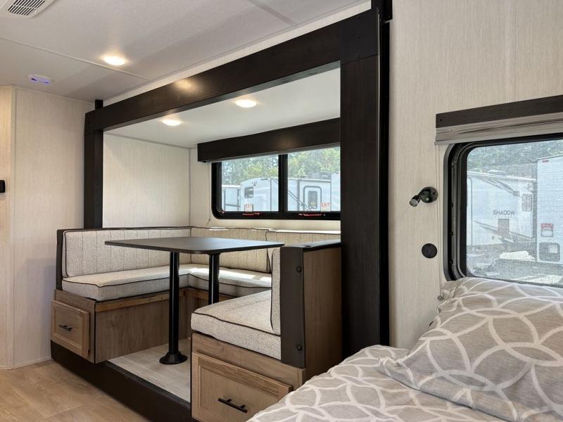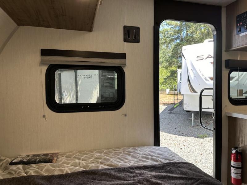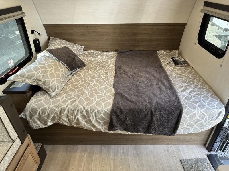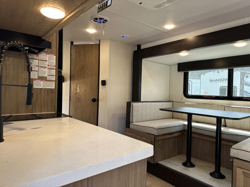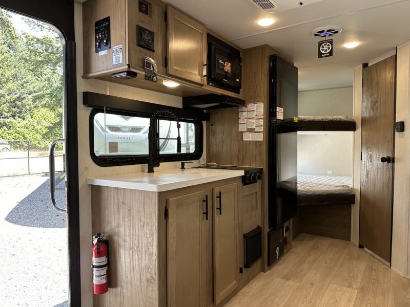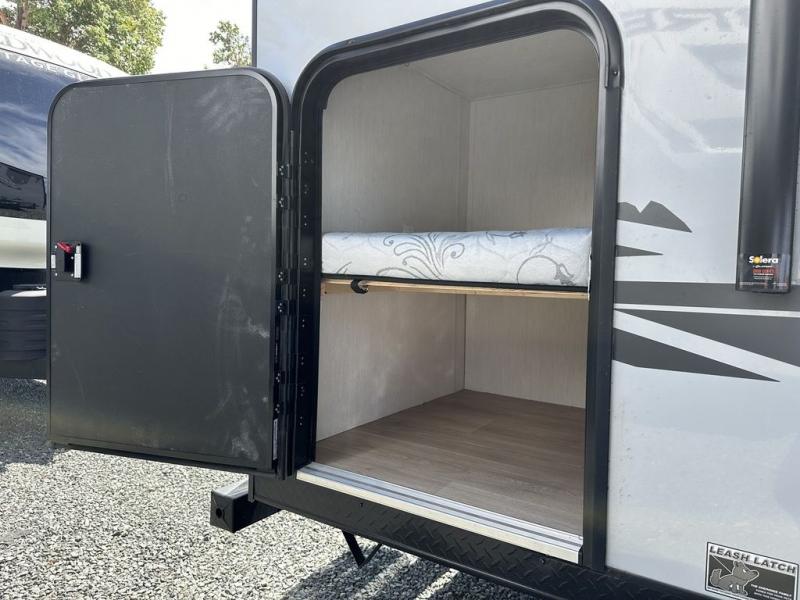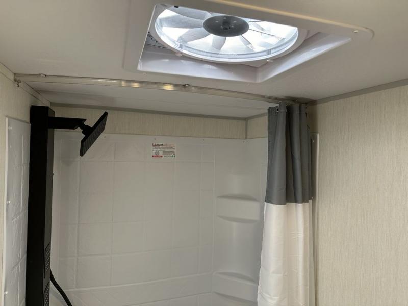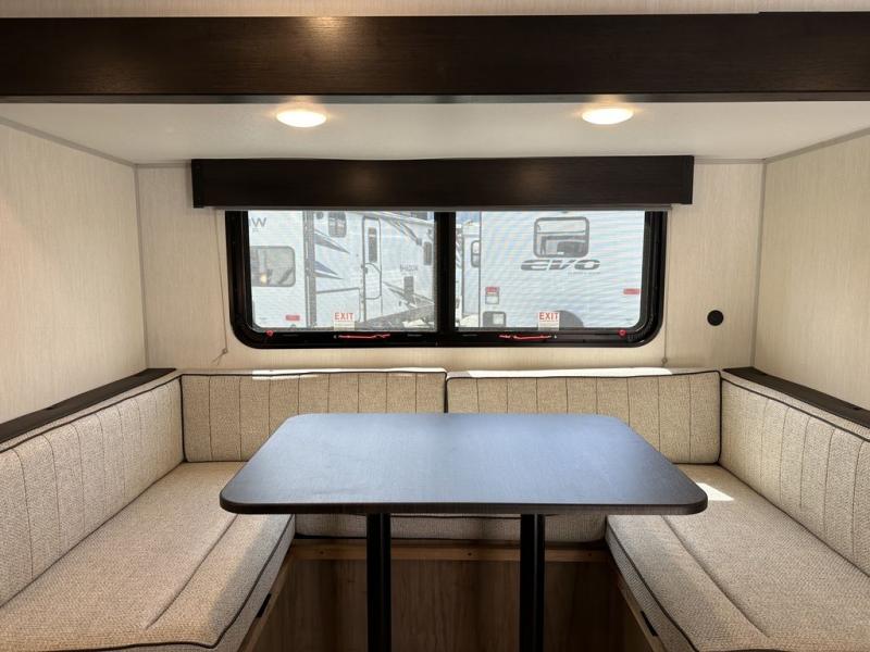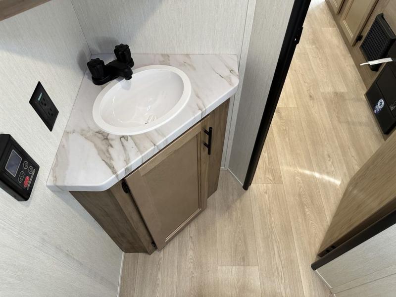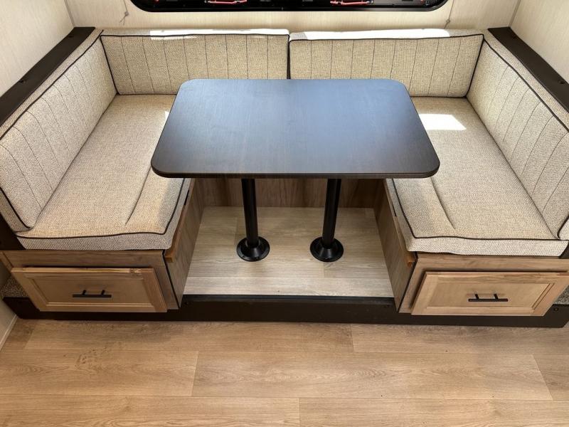 This family travel trailer is ready to head to the campground whenever you are! The kiddos can sleep on the set of double-size bed bunks and you can sleep on the front queen bed, plus the U-shaped dinette slide can also transform into an extra sleeping space when you aren't using it to enjoy a meal. You can prepare your delicious meals on the flushmount range or at the outside mini kitchen and stay protected by the power awning. The exterior not only has outside storage and an outside TV mount, but also features an outside storage plus door for access to the storage space underneath the bottom bunk bed. The rear corner bath allows everyone to stay clean and refreshed while you camp.