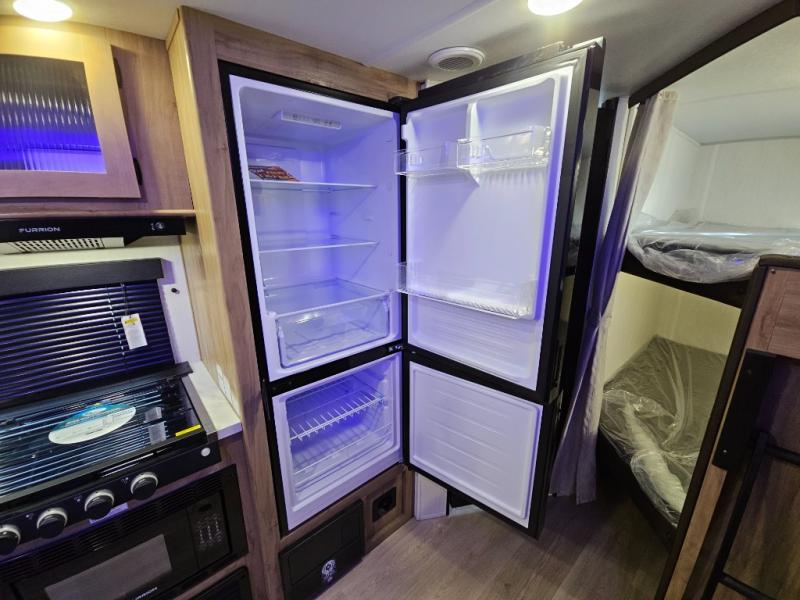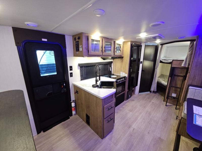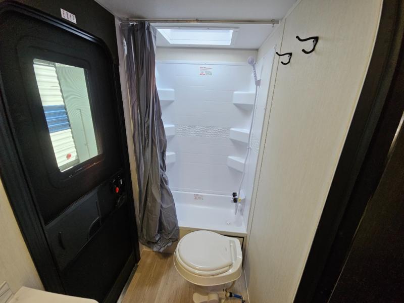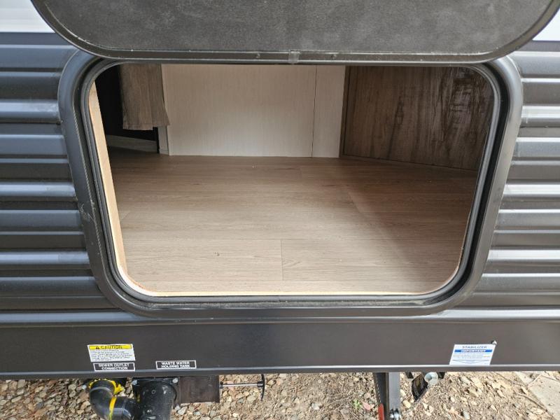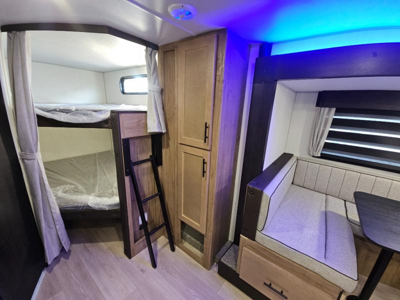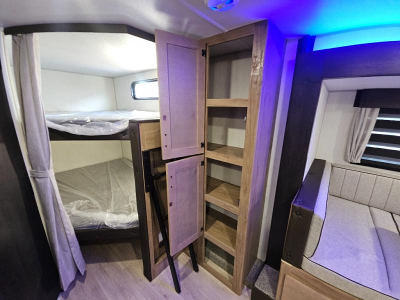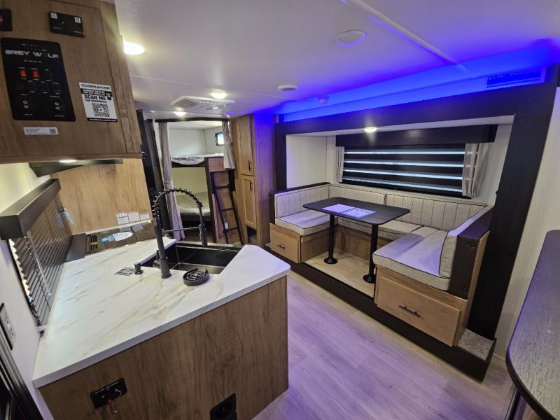 You will love the space provided in this dual entry Cherokee Grey Wolf travel trailer that has double-size bunks! The rear entry door leads right into the full bath allowing easy access from outside when you need to use the bathroom while you're enjoying the great outdoors. The large U-shaped dinette slide will not only seat everyone comfortably for a meal or a game, but since it also slides out, it opens up the interior even more to give you plenty of space for foot traffic. For all of your outdoor gear, you will find the outside storage compartments handy for stowing away your things when not in use. While the kids enjoy their bunk beds, you will enjoy a good night's rest in your RV king bed with wardrobes on either side up in the front private bedroom!