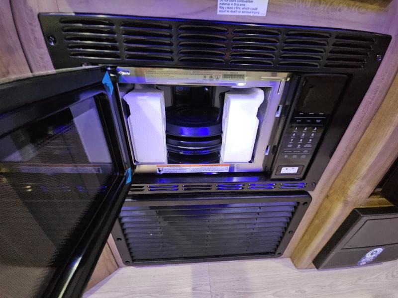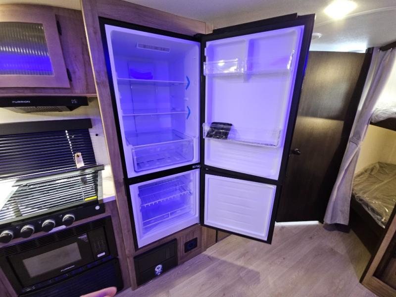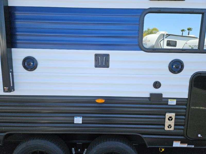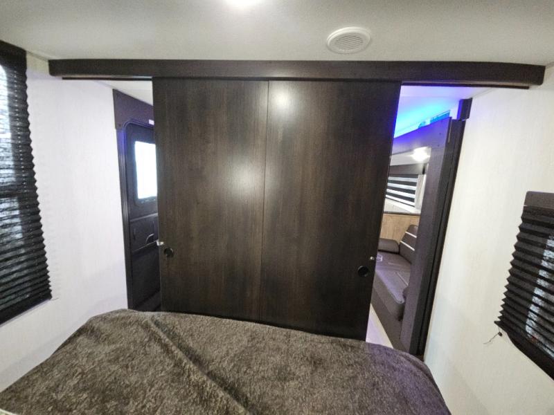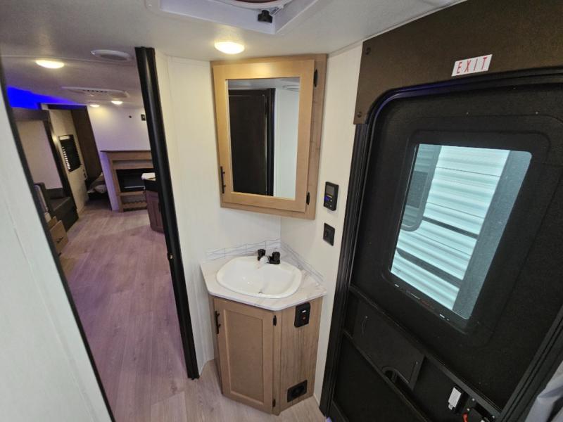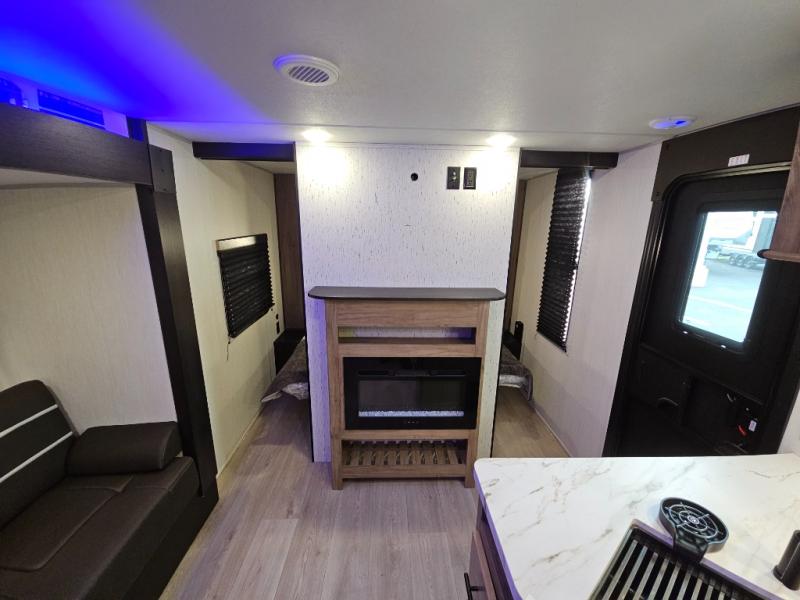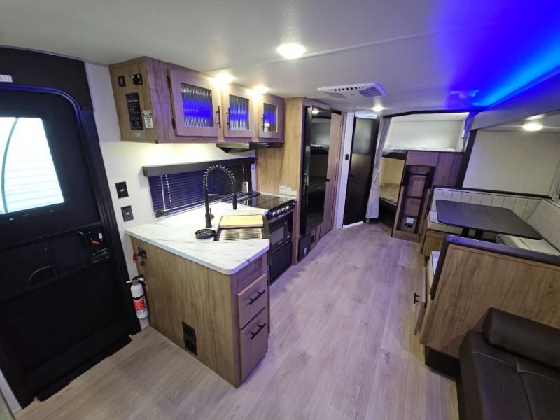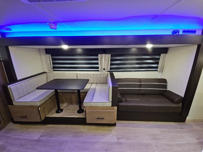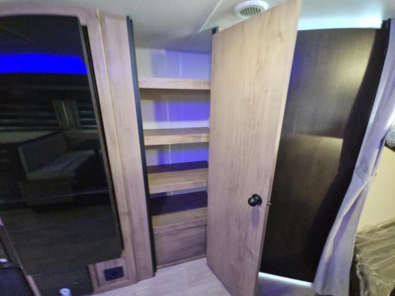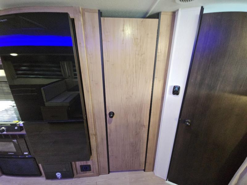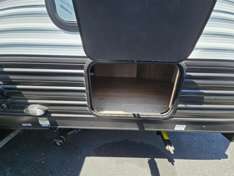 Come on inside this Cherokee Grey Wolf travel trailer and experience the convenience of a smooth flow of traffic in and out with two entry doors. The rear door leads into a full bath which is great for accessibility. Once inside, you will notice the large U-shaped dinette and the sofa which sit on the slide and create a spacious footprint for moving about, as well as great places to play games and socialize with your friends and family. A walk-in pantry provides plenty of storage allowing you to stock up on your favorite snacks and dry goods for your family adventure. At night, there is sleeping space for everyone between the double-size bunks and the RV king bed, plus the furniture.
