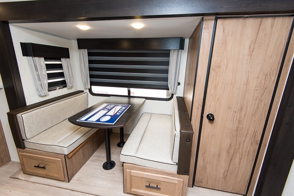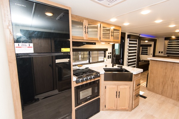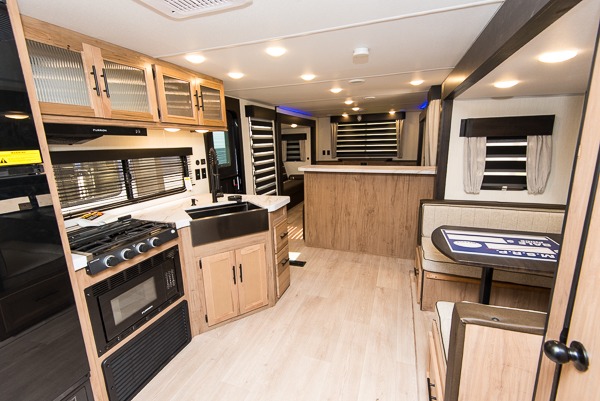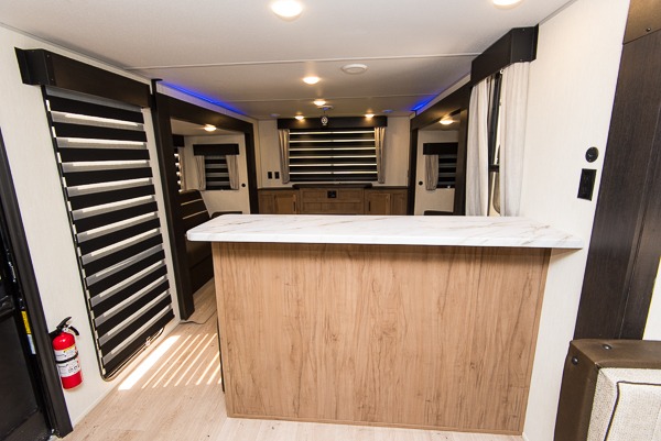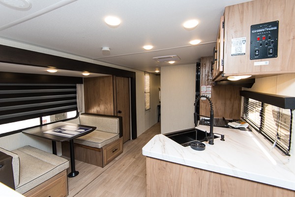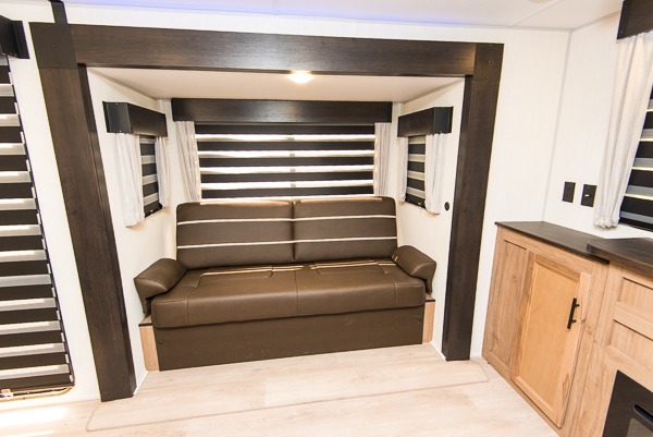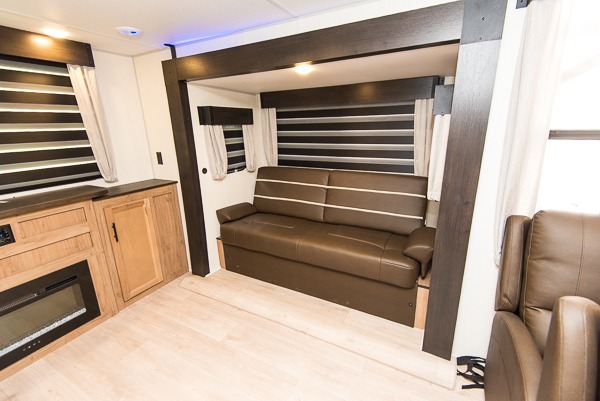 Affordable luxury and livability is what you will find in this travel trailer! The rear living area has opposing sofa slides, two recliners, a rear entertainment center with a fireplace, and panoramic windows for added natural lighting. There is even a bar top with two bar stools overlooking the living area so you can enjoy a meal and a movie. The booth dinette slide has a full door pantry next to it so you can quickly grab a snack during game night. Freshen up each morning in the full bathroom with the shower with a seat. The front private bedroom has a walk around queen bed for a good night's rest and a linen closet with an area prepped to add the optional washer and dryer. You even have an outside kitchen, a rear storage rack, outside storage areas, and an outside TV mount!