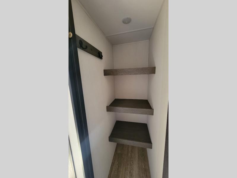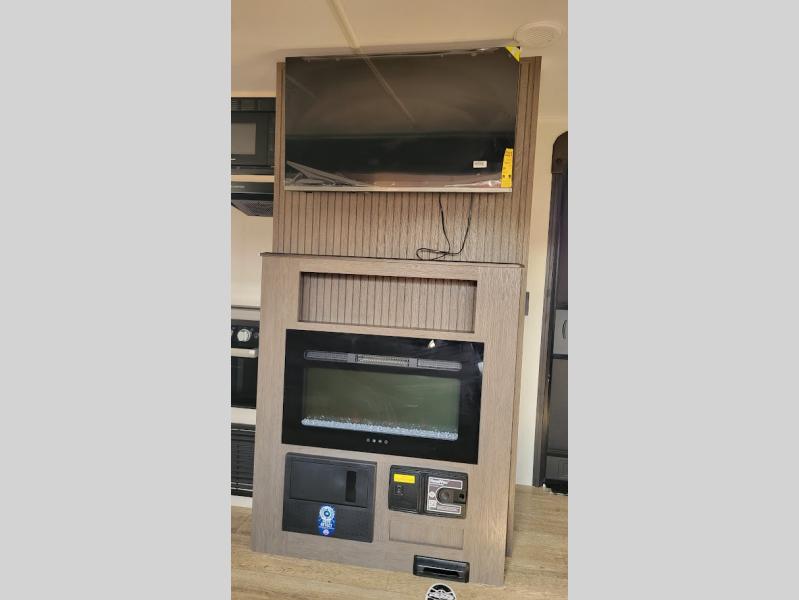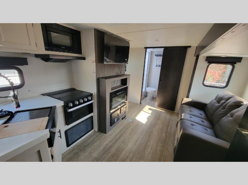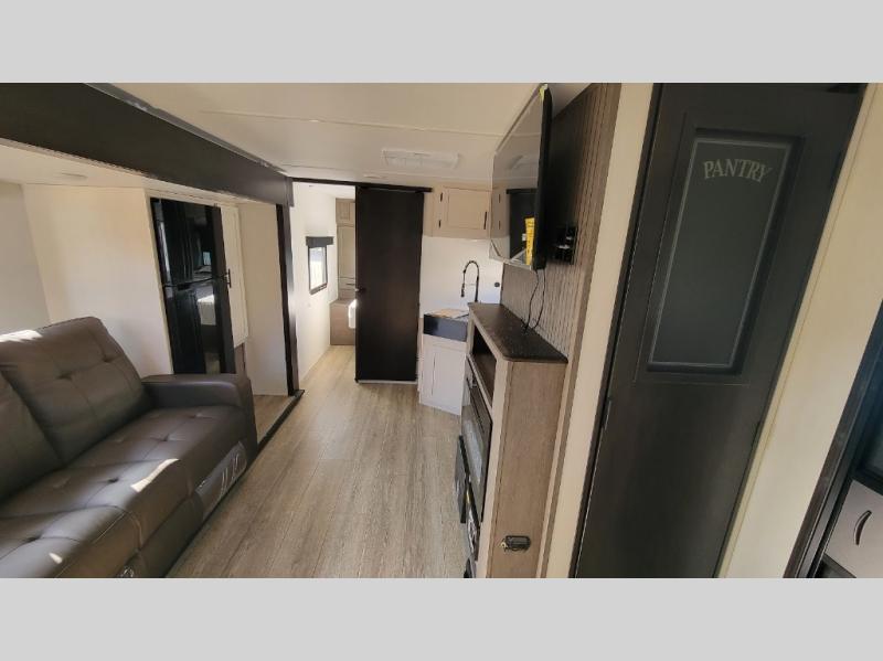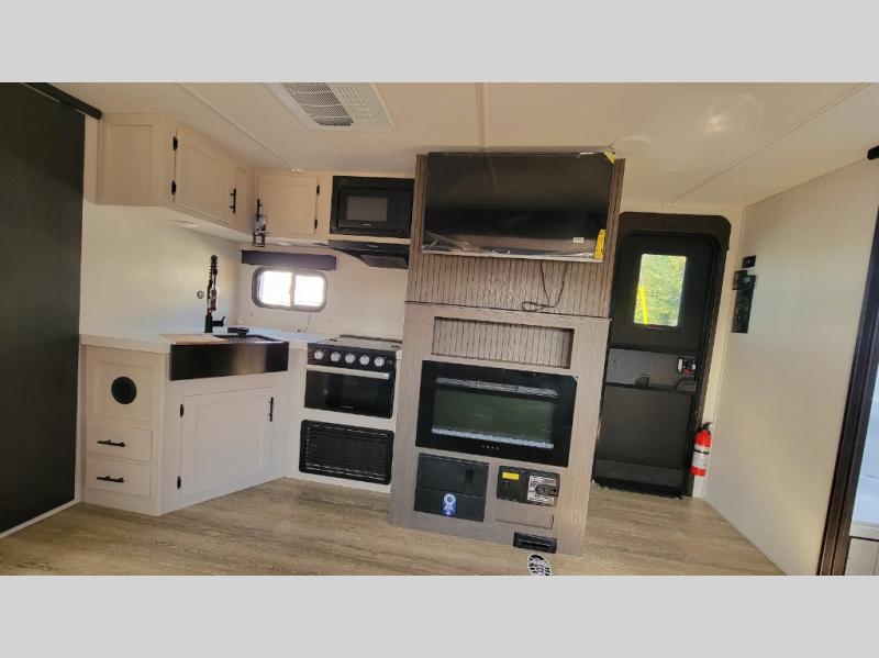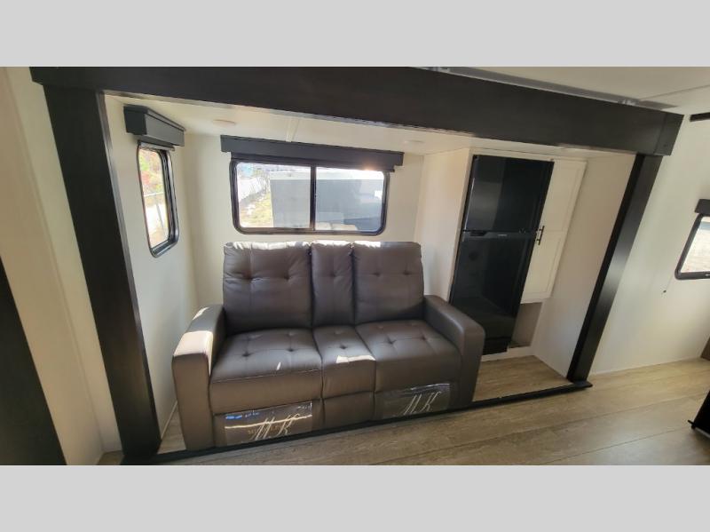 Looking for the perfect trailer for two with a spacious bathroom and bedroom? This Alpha Wolf provides a rear oversized bathroom complete with linen storage and a sliding door that saves space and looks great. The front bedroom includes a walk-around queen bed, dual wardrobes, a sliding door plus windows for natural lighting and great views. The main living and kitchen area is spacious as well with a large slide out that includes theater seating with a removable table across from the entertainment center with a fireplace, a 12V residential style refrigerator for lots of cold storage, and a pantry for your snacks and dry goods. You can decide to cook indoors on the three burner cooktop, or head outdoors to cook on the outside kitchen!