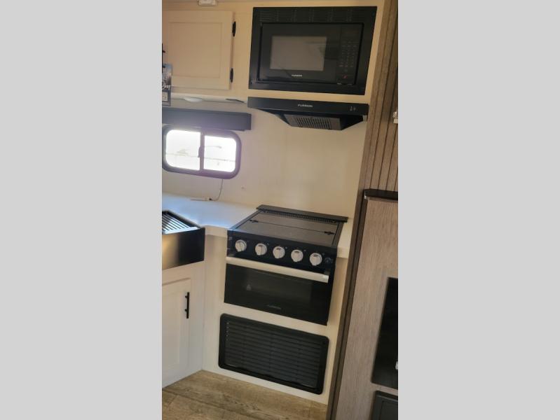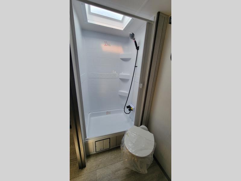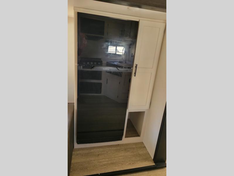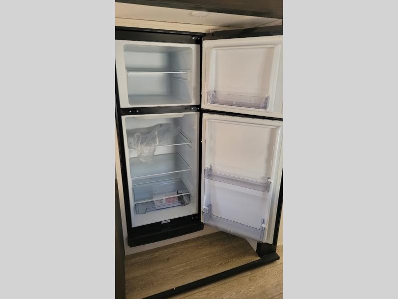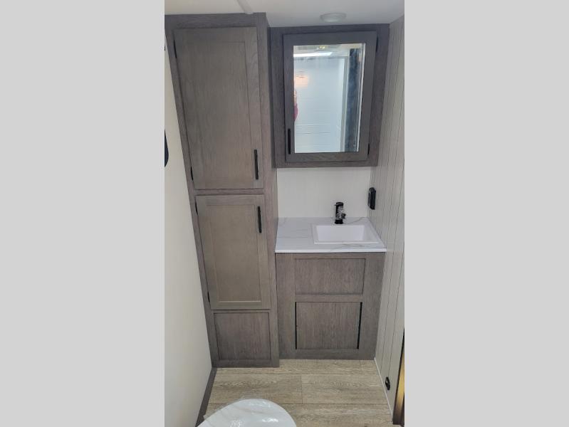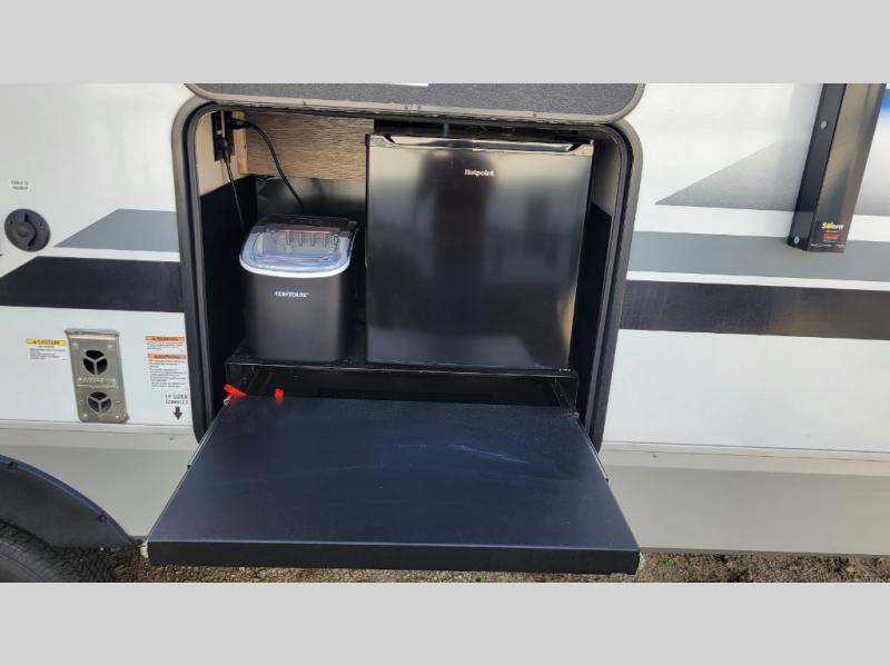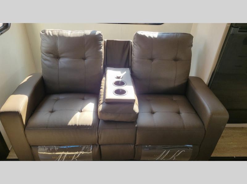 Looking for the perfect trailer for two with a spacious bathroom and bedroom? This Alpha Wolf provides a rear oversized bathroom complete with linen storage and a sliding door that saves space and looks great. The front bedroom includes a walk-around queen bed, dual wardrobes, a sliding door plus windows for natural lighting and great views. The main living and kitchen area is spacious as well with a large slide out that includes theater seating with a removable table across from the entertainment center with a fireplace, a 12V residential style refrigerator for lots of cold storage, and a pantry for your snacks and dry goods. You can decide to cook indoors on the three burner cooktop, or head outdoors to cook on the outside kitchen!