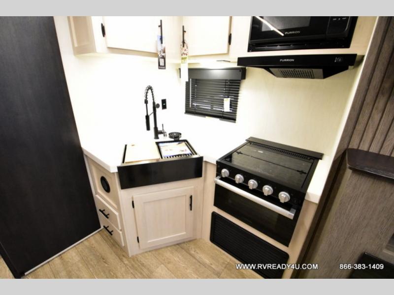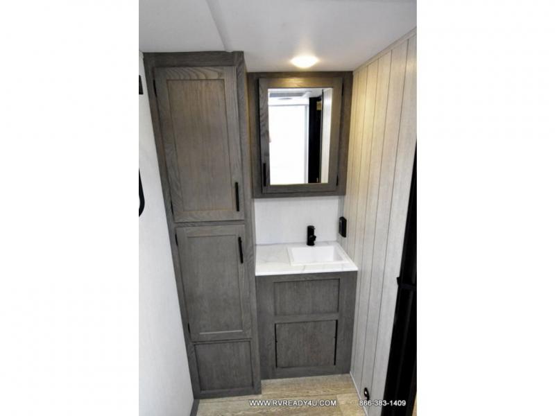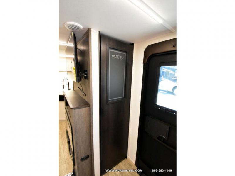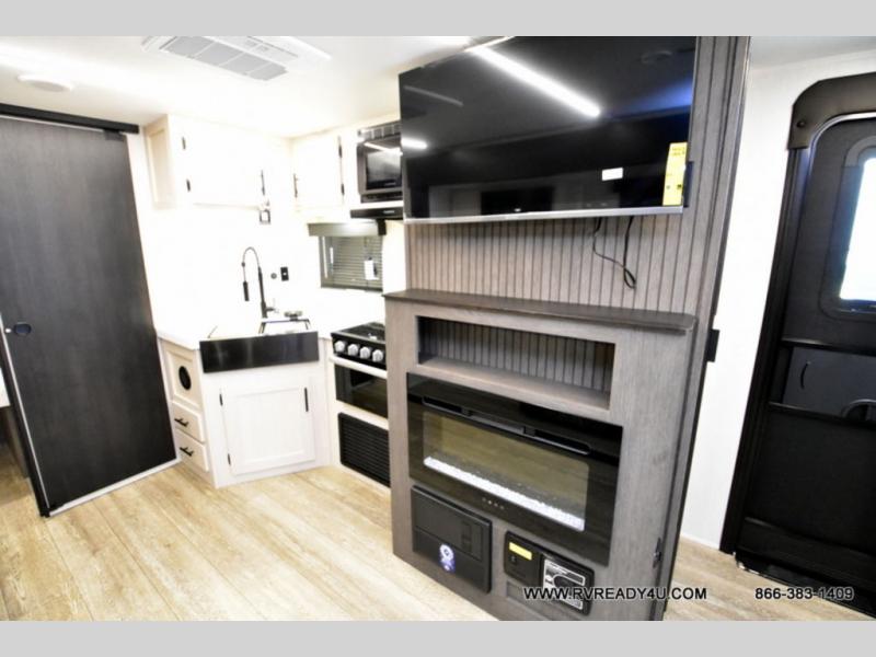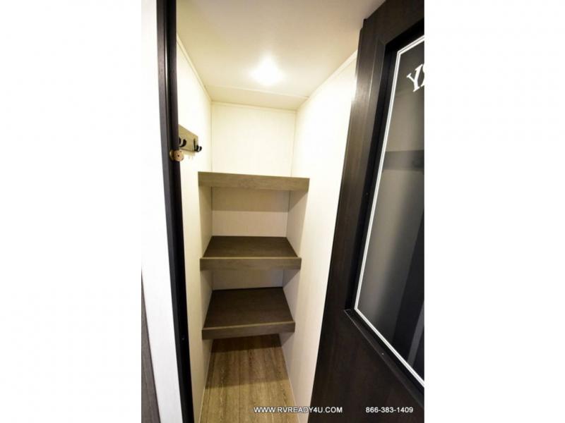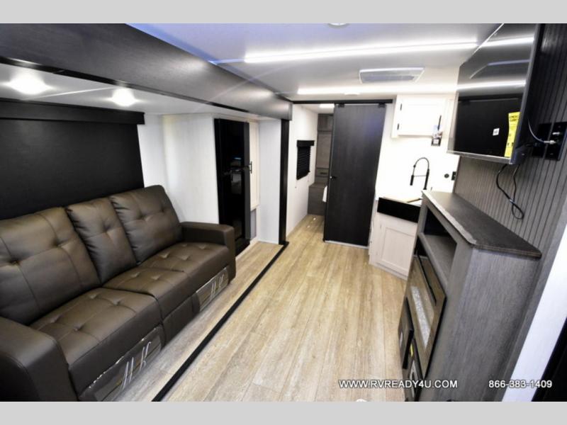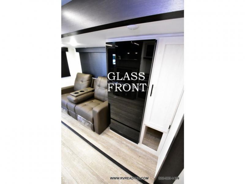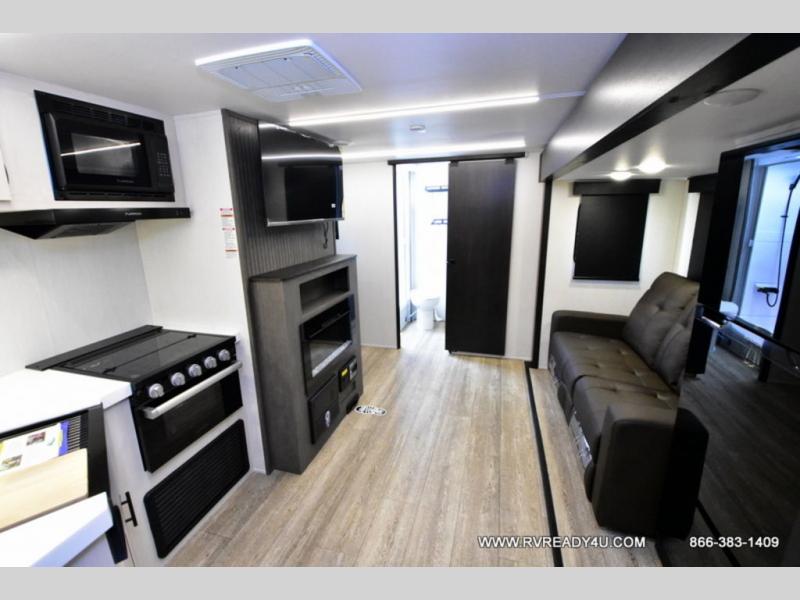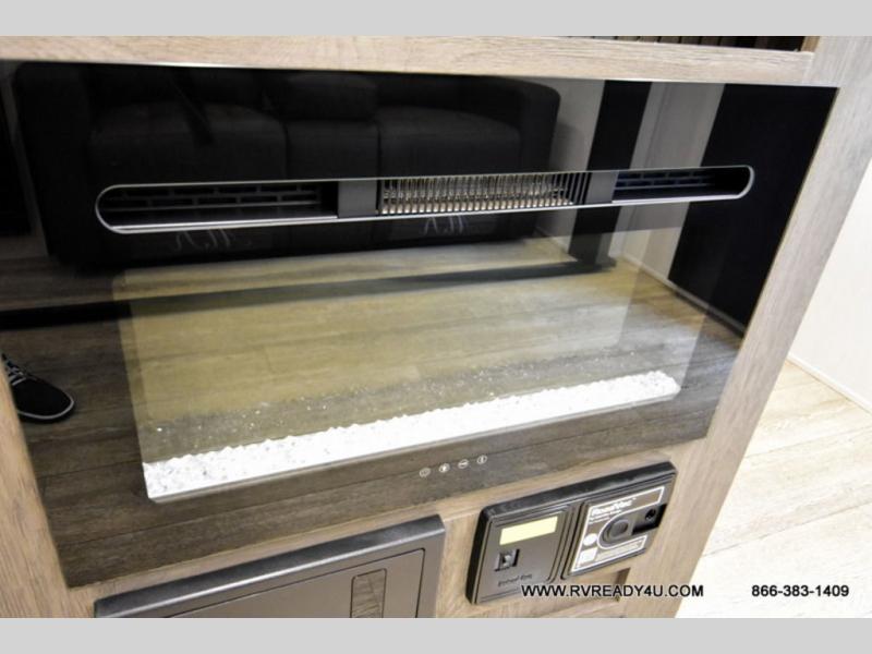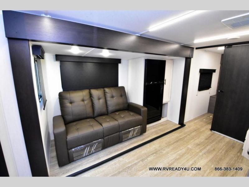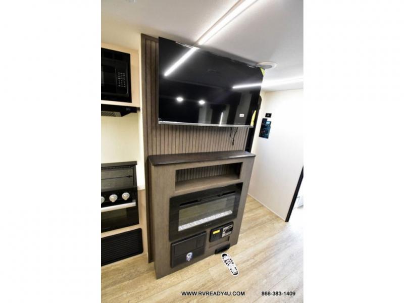 Looking for the perfect trailer for two with a spacious bathroom and bedroom? This Alpha Wolf provides a rear oversized bathroom complete with linen storage and a sliding door that saves space and looks great. The front bedroom includes a walk-around queen bed, dual wardrobes, a sliding door plus windows for natural lighting and great views. The main living and kitchen area is spacious as well with a large slide out that includes theater seating with a removable table across from the entertainment center with a fireplace, a 12V residential style refrigerator for lots of cold storage, and a pantry for your snacks and dry goods. You can decide to cook indoors on the three burner cooktop, or head outdoors to cook on the outside kitchen!