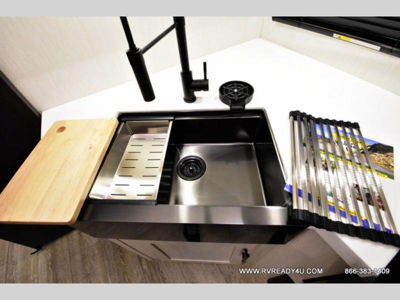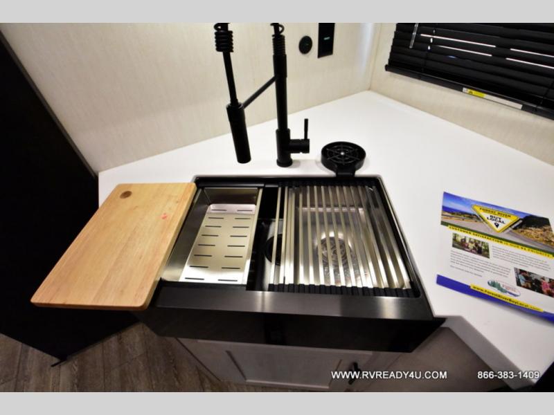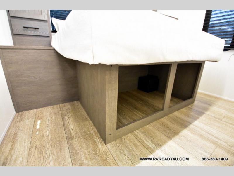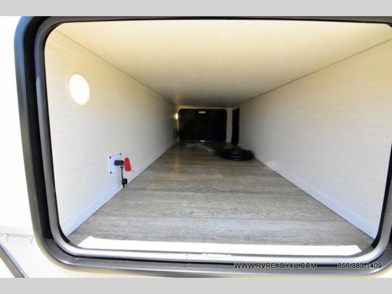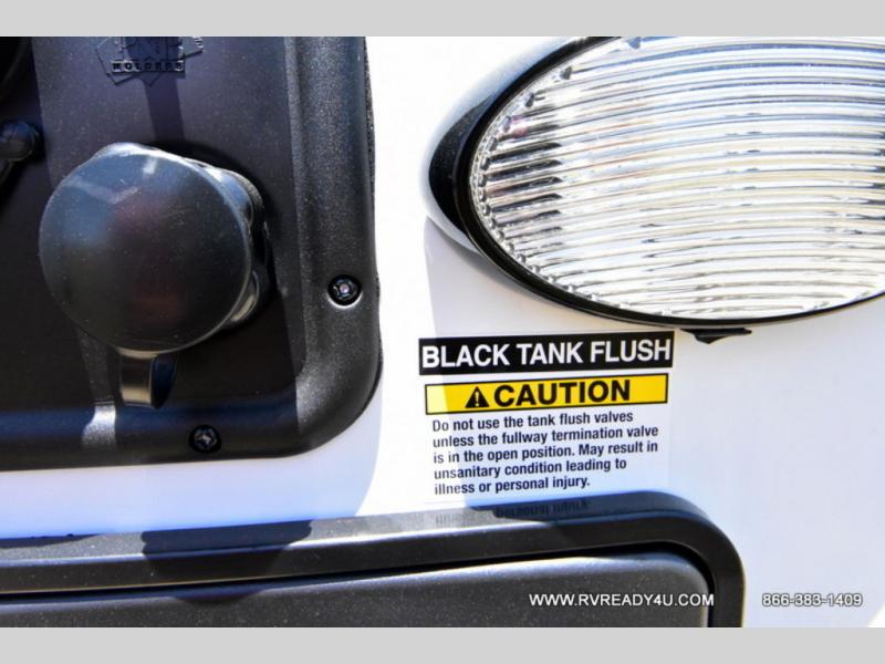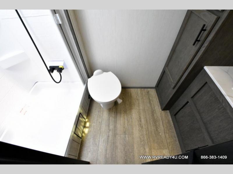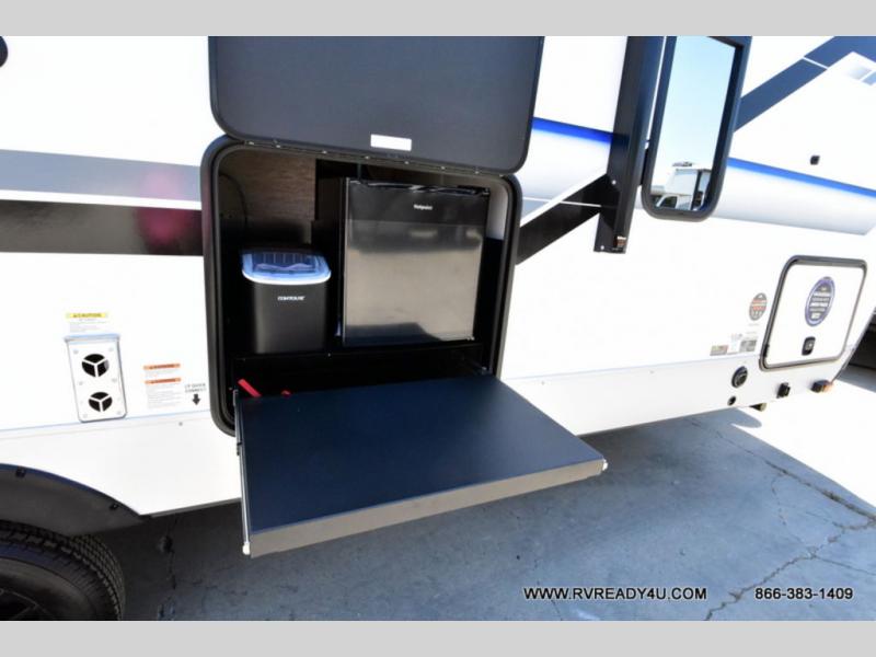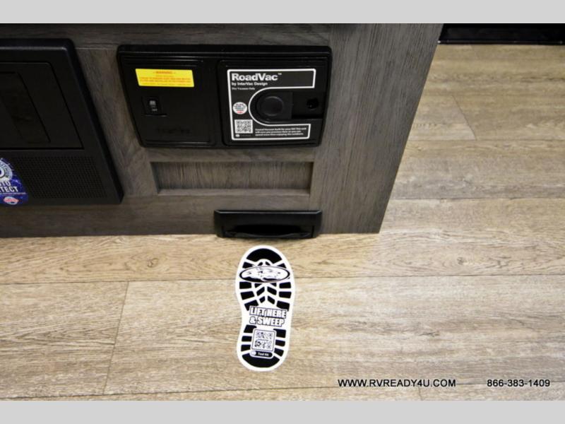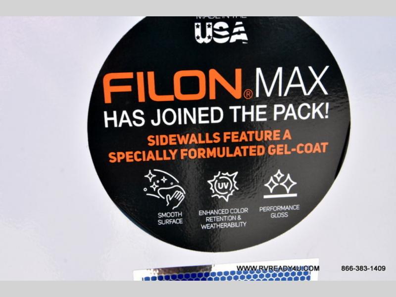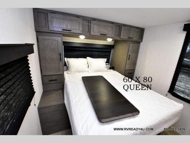 Looking for the perfect trailer for two with a spacious bathroom and bedroom? This Alpha Wolf provides a rear oversized bathroom complete with linen storage and a sliding door that saves space and looks great. The front bedroom includes a walk-around queen bed, dual wardrobes, a sliding door plus windows for natural lighting and great views. The main living and kitchen area is spacious as well with a large slide out that includes theater seating with a removable table across from the entertainment center with a fireplace, a 12V residential style refrigerator for lots of cold storage, and a pantry for your snacks and dry goods. You can decide to cook indoors on the three burner cooktop, or head outdoors to cook on the outside kitchen!